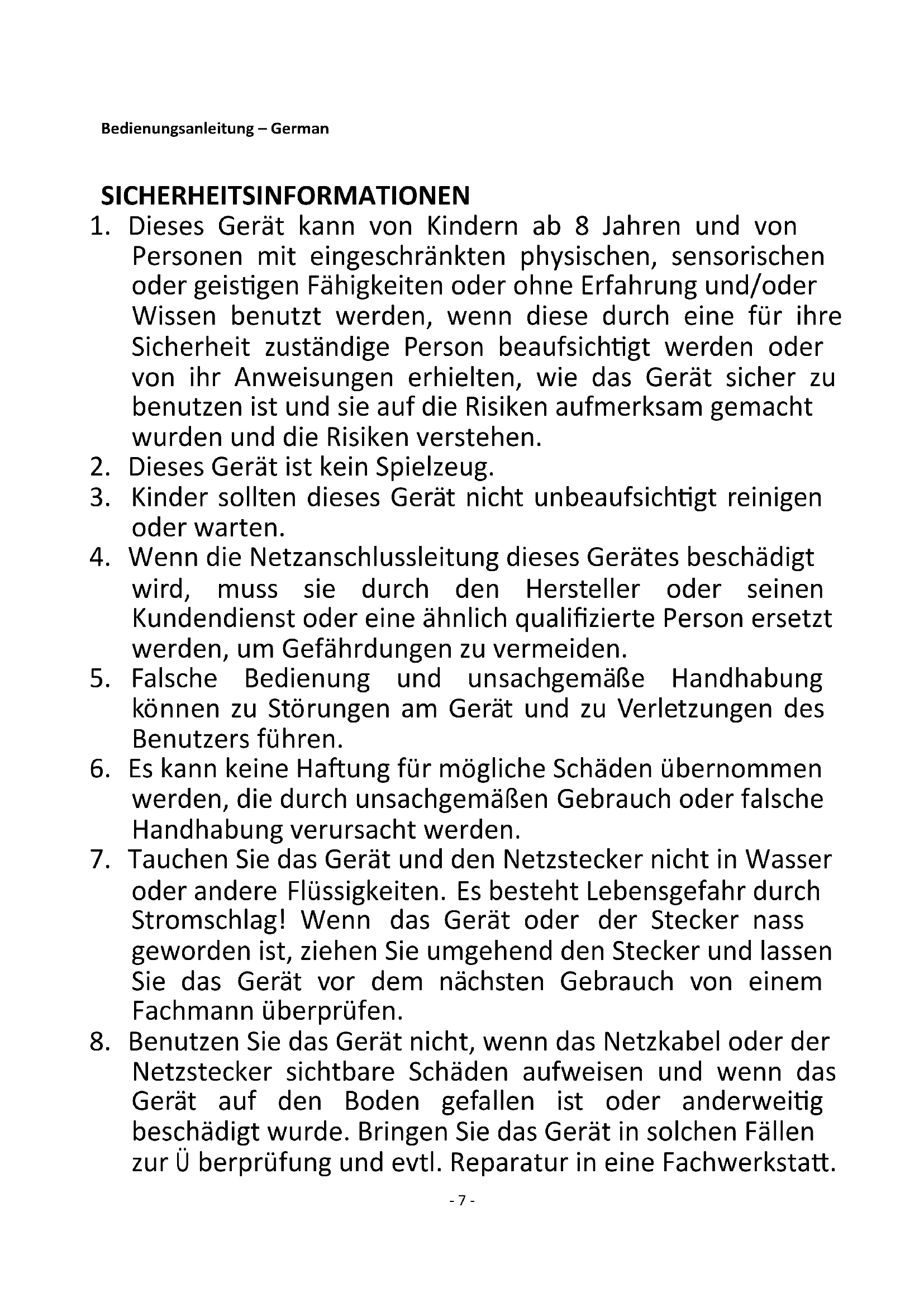 Netzstecker sichtbare Schäden aufweisen und wenn das Gerät auf den Boden gefallen ist oder anderweitig beschädigt wurde. Bringen Sie das Gerät in solchen Fällen zur Ü berprüfung und evtl. Reparatur in eine Fachwerkstatt.- 8 -