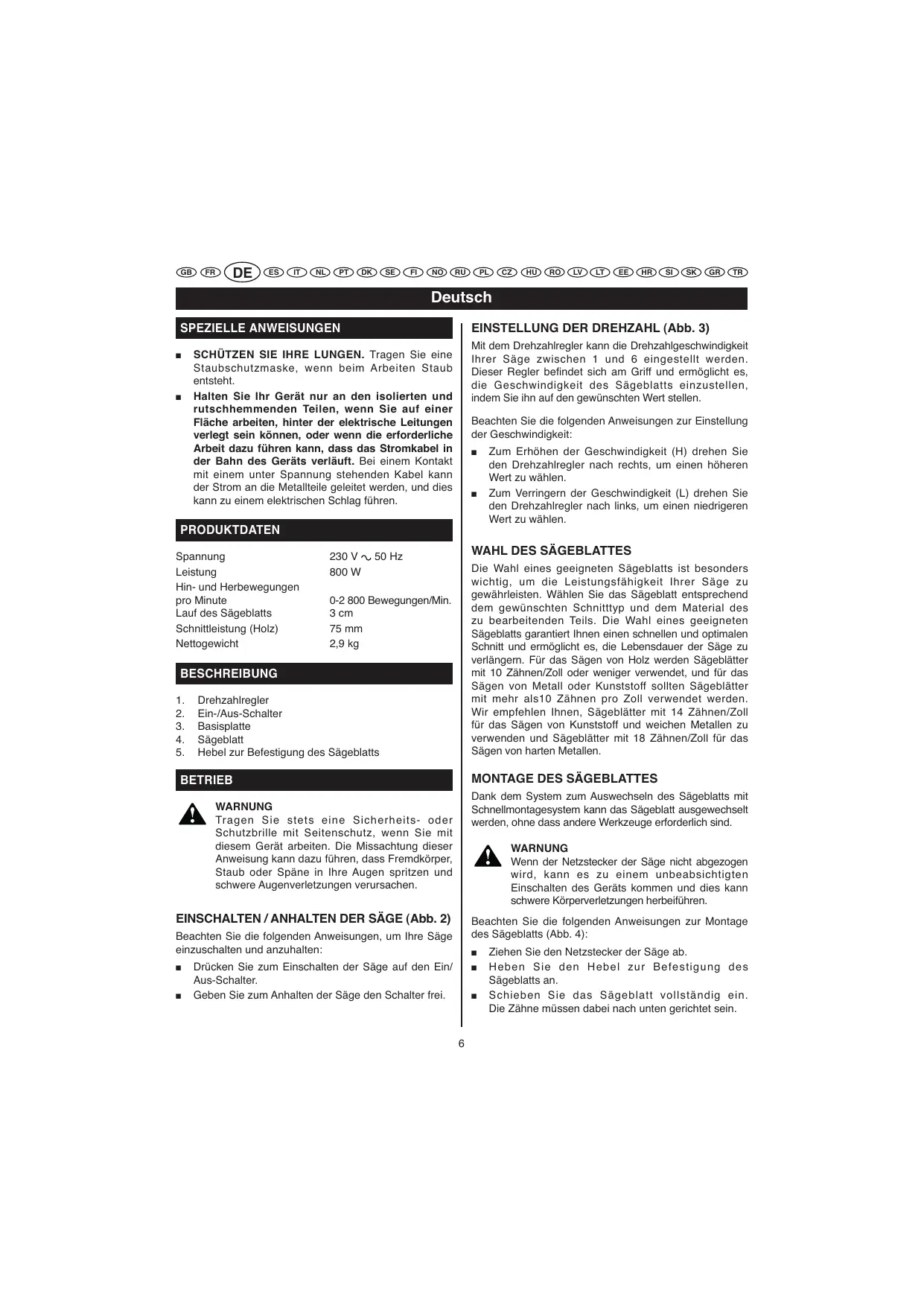 50 Hz Die Wahl eines geeigneten Sägeblatts ist besonders wichtig, um die Leistungsfähigkeit Ihrer Säge zu gewährleisten. Wählen Sie das Sägeblatt entsprechend dem gewünschten Schnitttyp und dem Material des zu bearbeitenden Teils. Die Wahl eines geeigneten Sägeblatts garantiert Ihnen einen schnellen und optimalen Schnitt und ermöglicht es, die Lebensdauer der Säge zu verlängern. Für das Sägen von Holz werden Sägeblätter mit 10 Zähnen/Zoll oder weniger verwendet, und für das Sägen von Metall oder Kunststoff sollten Sägeblätter mit mehr als10 Zähnen pro Zoll verwendet werden. Wir empfehlen Ihnen, Sägeblätter mit 14 Zähnen/Zoll für das Sägen von Kunststoff und weichen Metallen zu verwenden und Sägeblätter mit 18 Zähnen/Zoll für das Sägen von harten Metallen. 0-2 800 Bewegungen/Min. 3 cm 75 mm 2,9 kg BESCHREIBUNG