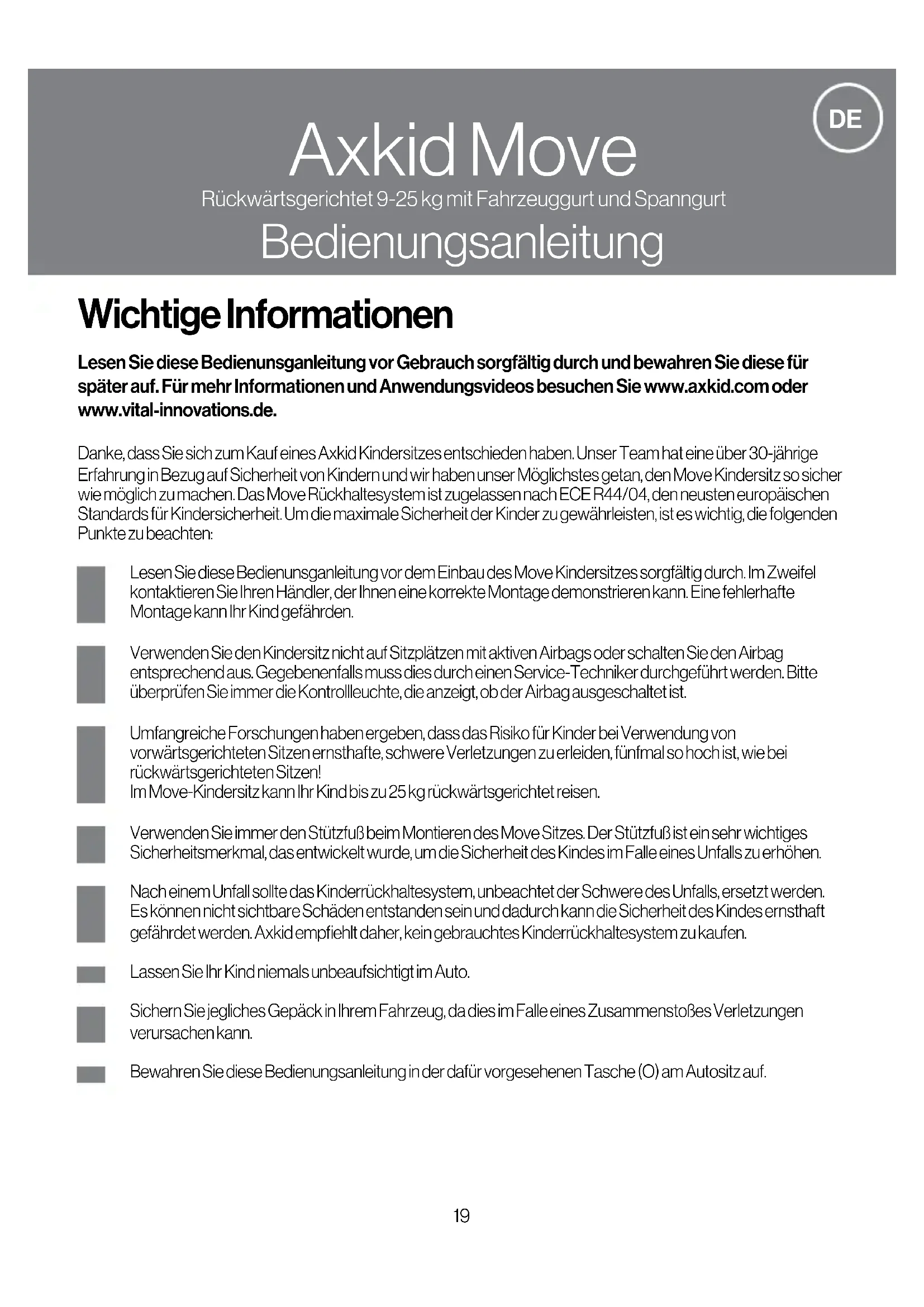Lesen Sie diese Bedienunsganleitung vor dem Einbau des Move Kindersitzes sorgfältig durch. Im Zweifel kontaktieren Sie Ihren Händler, der Ihnen eine korrekte Montage demonstrieren kann. Eine fehlerhafte Montage kann Ihr Kind gefährden. Verwenden Sie den Kindersitz nicht auf Sitzplätzen mit aktiven Airbags oder schalten Sie den Airbag entsprechend aus. Gegebenenfalls muss dies durch einen Service-Techniker durchgeführt werden. Bitte überprüfen Sie immer die Kontrollleuchte, die anzeigt, ob der Airbag ausgeschaltet ist. Umfangreiche Forschungen haben ergeben, dass das Risiko für Kinder bei Verwendung von vorwärtsgerichteten Sitzen ernsthafte, schwere Verletzungen zu erleiden, fünfmal so hoch ist, wie bei rückwärtsgerichteten Sitzen!Im Move-Kindersitz kann Ihr Kind bis zu 25 kg rückwärtsgerichtet reisen. Verwenden Sie immer den Stützfuß beim Montieren des Move Sitzes. Der Stützfuß ist ein sehr wichtiges Sicherheitsmerkmal, das entwickelt wurde, um die Sicherheit des Kindes im Falle eines Unfalls zu erhöhen. Nach einem Unfall sollte das Kinderrückhaltesystem, unbeachtet der Schwere des Unfalls, ersetzt werden. Es können nicht sichtbare Schäden entstanden sein und dadurch kann die Sicherheit des Kindes ernsthaft gefährdet werden. Axkid empfiehlt daher, kein gebrauchtes Kinderrückhaltesystem zu kaufen. Lassen Sie Ihr Kind niemals unbeaufsichtigt im Auto.Sichern Sie jegliches Gepäck in Ihrem Fahrzeug, da dies im Falle eines Zusammenstoßes Verletzungen verursachen kann. Bewahren Sie diese Bedienungsanleitung in der dafür vorgesehenen Tasche (O) am Autositz auf. Lesen Sie diese Bedienunsganleitung vor Gebrauch sorgfältig durch und bewahren Sie diese für später auf. Für mehr Informationen und Anwendungsvideos besuchen Sie www.axkid.com oder www.vital-innovations.de.Danke, dass Sie sich zum Kauf eines Axkid Kindersitzes entschieden haben. Unser Team hat eine über 30-jährige Erfahrung in Bezug auf Sicherheit von Kindern und wir haben unser Möglichstes getan, den Move Kindersitz so sicher wie möglich zu machen. Das Move Rückhaltesystem ist zugelassen nach ECE R44/04, den neusten europäischen Standards für Kindersicherheit. Um die maximale Sicherheit der Kinder zu gewährleisten, ist es wichtig, die folgenden Punkte zu beachten: Wichtige Informationen20 Das Kinderrückhaltesystem kann an jedem vorwärtsgerichtetem Beifahrersitz mit Dreipunktgurt benutzt werden, vorausgesetzt der Airbag ist ausgeschaltet. Das Rückhaltesystem kann nicht mit einem 2-Punkt Beckengurt benutzt werden (ii). WICHTIG: Verwenden Sie den Kindersitz nicht auf Sitzplätzen mit aktiven Airbags oder schalten Sie die Airbags entsprechend vorher aus. Gegebenenfalls muss dies durch einen Service-Techniker durchgeführt werden. Bitte überprüfen Sie immer die Kontrollleuchte, die anzeigt, ob der Airbag ausgeschaltet ist. WARNUNG: Verwenden Sie den Kindersitz niemals auf Sitzplätzen mit aktiven Airbags WARNUNG: Verwenden Sie den Kindersitz niemals auf rückwärts- oder seitwärtsgerichteten Fahrzeugsitzen. WARNUNG: Airbags wurden für Erwachsene entwickelt und können Ihr Kind bei einem Unfall ernsthaft verletzen.