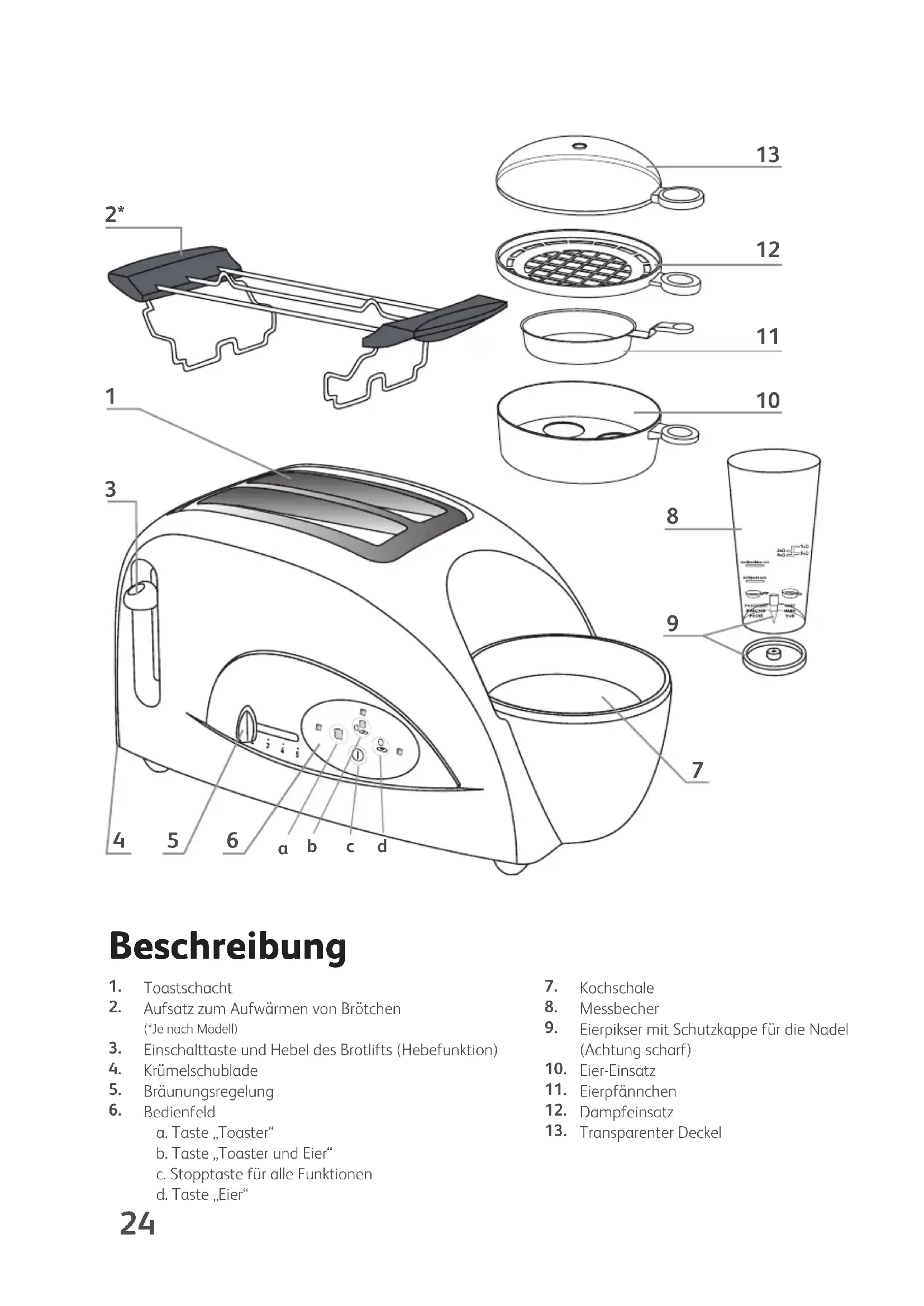 TOASTN'EGG-NC00013044:Mise en page 1 16/10/09 10:38 Page 23Beschreibung Toastschacht Aufsatz zum Aufwärmen von Brötchen (*Je nach Modell) Einschalttaste und Hebel des Brotlifts (Hebefunktion) Krümelschublade Bräunungsregelung Bedienfeld a. Taste „Toaster“ b. Taste „Toaster und Eier“ c. Stopptaste für alle Funktionen d. Taste „Eier“