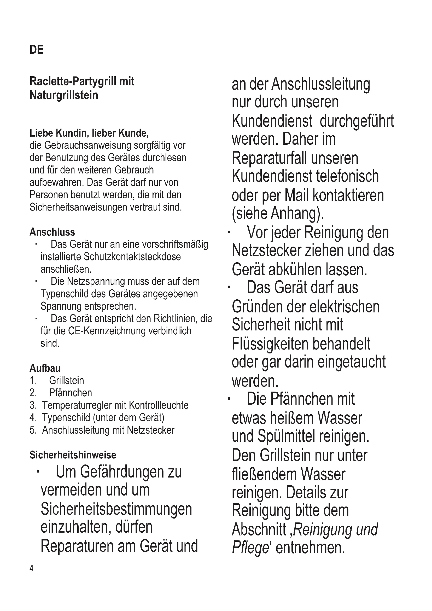 104 x 142 mm Raclette-Partygrill mit Naturgrillstein Liebe Kundin, lieber Kunde, die Gebrauchsanweisung sorgfältig vor der Benutzung des Gerätes durchlesen und für den weiteren Gebrauch aufbewahren. Das Gerät darf nur von Personen benutzt werden, die mit den Sicherheitsanweisungen vertraut sind. Anschluss ∙ Das Gerät nur an eine vorschriftsmäßig installierte Schutzkontaktsteckdose anschließen. ∙ Die Netzspannung muss der auf dem Typenschild des Gerätes angegebenen Spannung entsprechen. ∙ Das Gerät entspricht den Richtlinien, die für die CE-Kennzeichnung verbindlich sind. Aufbau