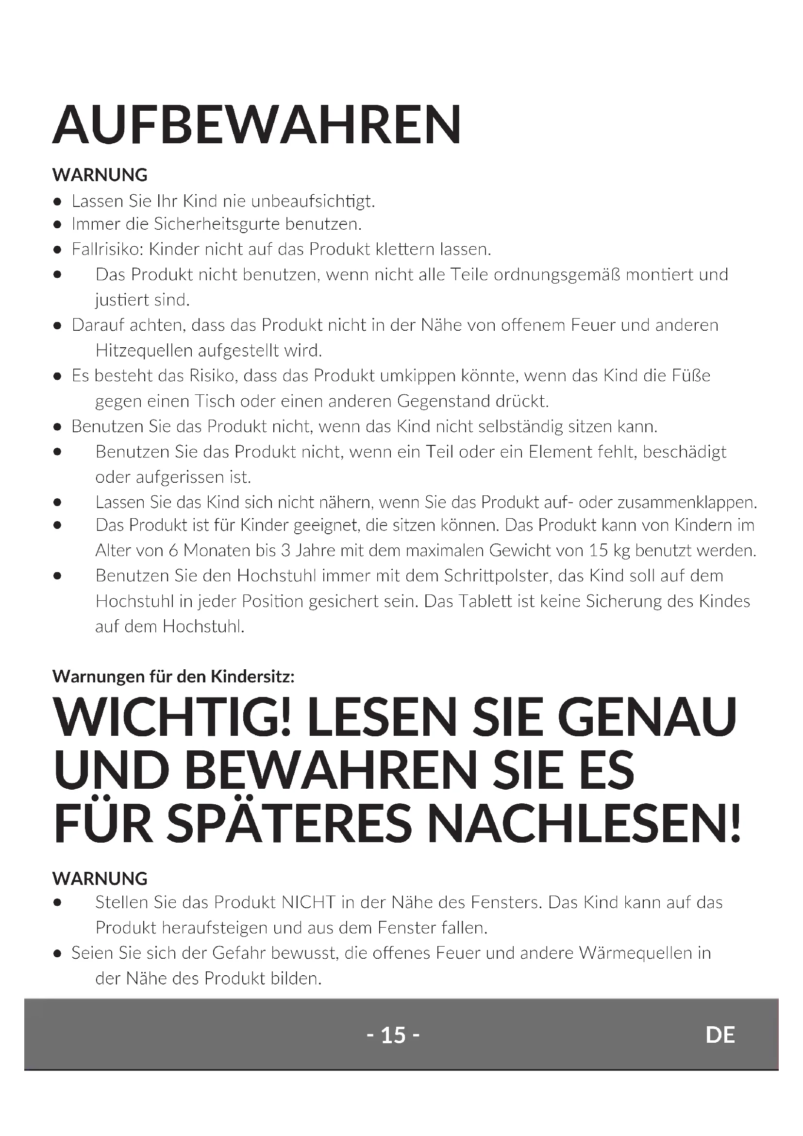Benutzen Sie den Hochstuhl immer mit dem Schripolster, das Kind soll auf dem Hochstuhl in jeder Posion gesichert sein. Das Table ist keine Sicherung des Kindes auf dem Hochstuhl. Warnungen für den Kindersitz: