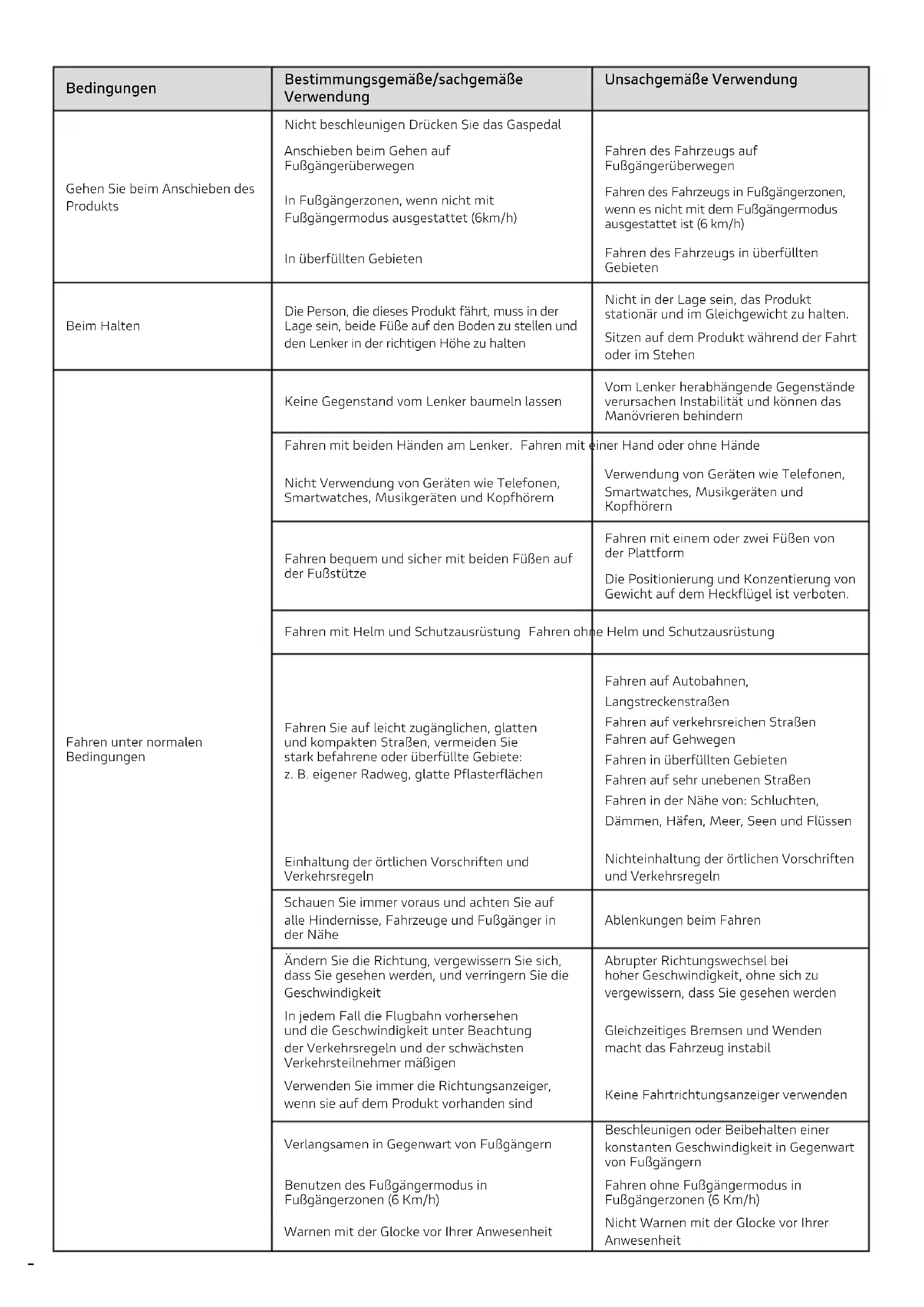 Überholen ansetzen, warnen Sie sie mit der Klingel und fahren Sie bei der Mindestgeschwindigkeit von 6 km/h. Fahrhinweise und Warnungen Bedingungen Bestimmungsgemäße/sachgemäße Verwendung Unsachgemäße Verwendung Fahrer Mehrere Personen, mit Kindern oder Tieren Sicherheitsausrüstung