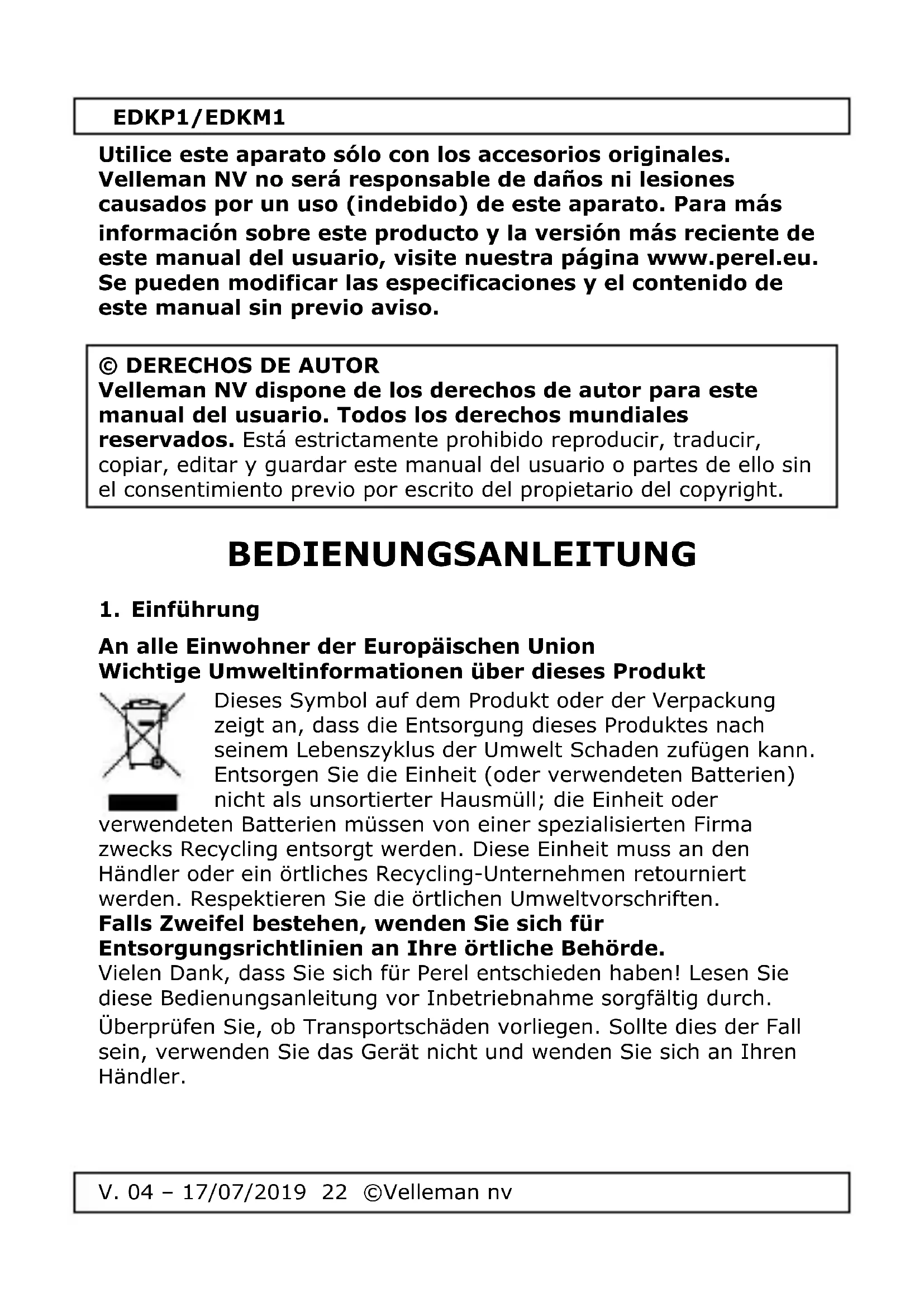 An alle Einwohner der Europäischen Union Wichtige Umweltinformationen über dieses Produkt Dieses Symbol auf dem Produkt oder der Verpackung zeigt an, dass die Entsorgung dieses Produktes nach seinem Lebenszyklus der Umwelt Schaden zufügen kann. Entsorgen Sie die Einheit (oder verwendeten Batterien) nicht als unsortierter Hausmüll; die Einheit oder verwendeten Batterien müssen von einer spezialisierten Firma zwecks Recycling entsorgt werden. Diese Einheit muss an den Händler oder ein örtliches Recycling-Unternehmen retourniert werden. Respektieren Sie die örtlichen Umweltvorschriften. Falls Zweifel bestehen, wenden Sie sich für Entsorgungsrichtlinien an Ihre örtliche Behörde. Vielen Dank, dass Sie sich für Perel entschieden haben! Lesen Sie diese Bedienungsanleitung vor Inbetriebnahme sorgfältig durch. Überprüfen Sie, ob Transportschäden vorliegen. Sollte dies der Fall sein, verwenden Sie das Gerät nicht und wenden Sie sich an Ihren Händler.EDKP1/EDKM1