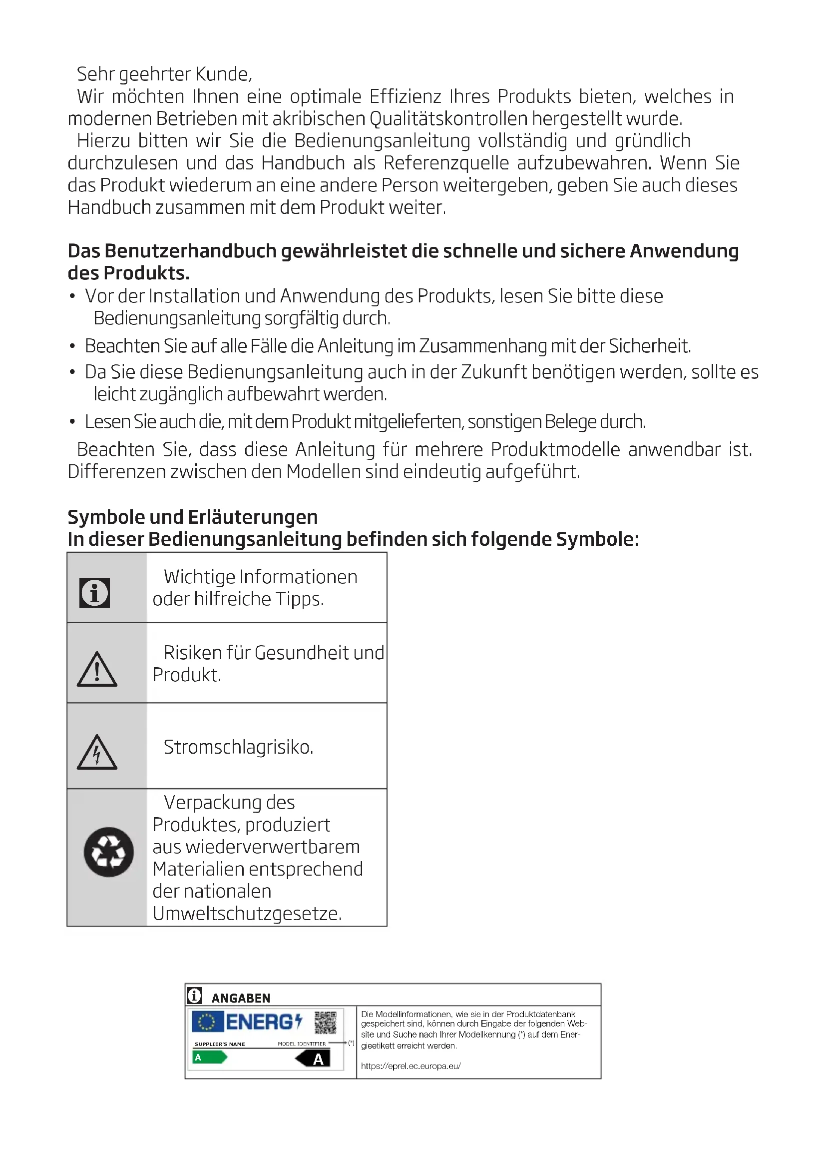 Die Modellinformationen, wie sie in der Produktdatenbank gespeichert sind, können durch Eingabe der folgenden Web-site und Suche nach Ihrer Modellkennung (*) auf dem Ener-gieetikett erreicht werden.https://eprel.ec.europa.eu/