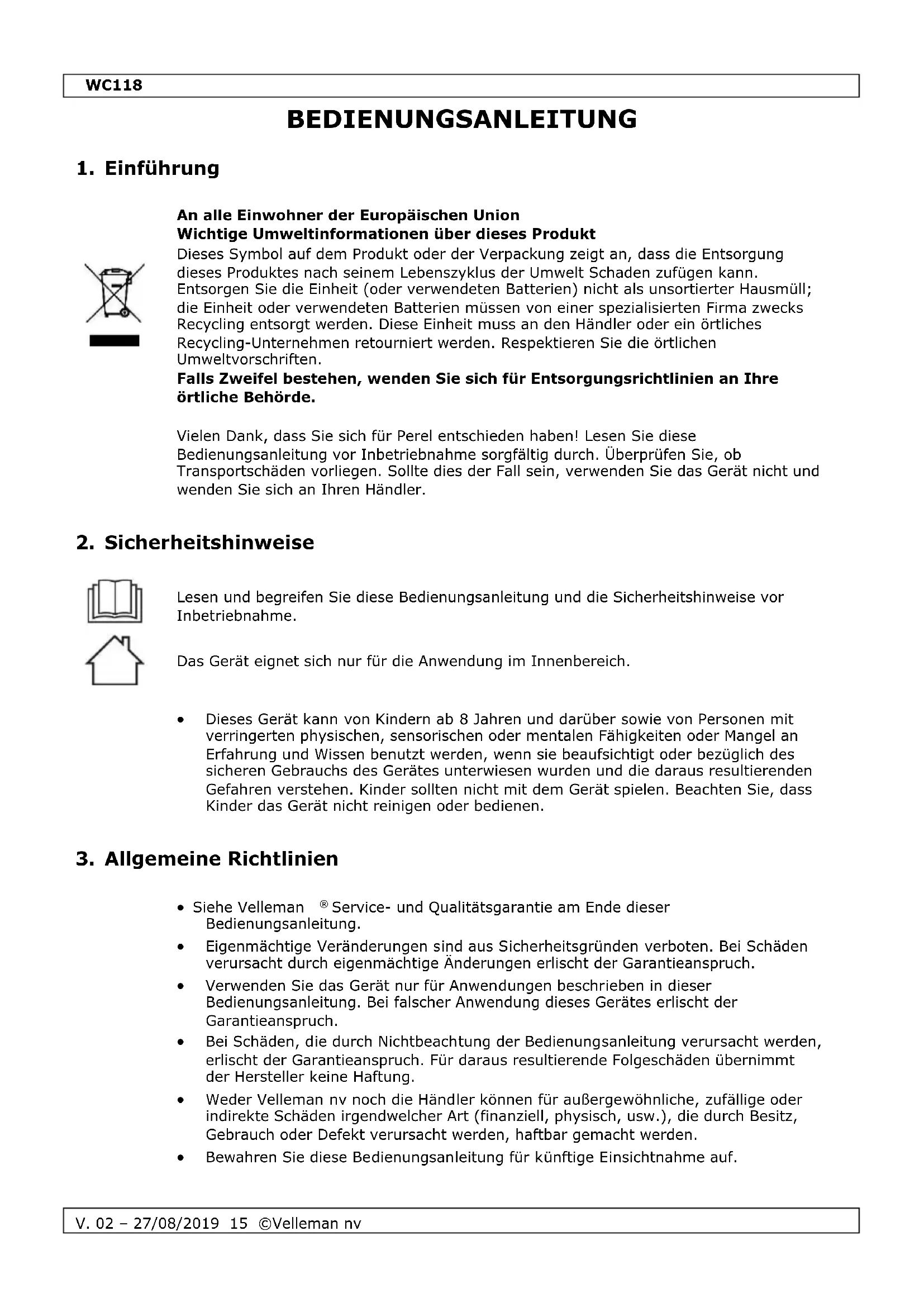 Velleman NV besitzt das Urheberrecht für diese Bedienungsanleitung. Alle weltweiten Rechte vorbehalten. Ohne vorherige schriftliche Genehmigung des Urhebers ist es nicht gestattet, diese Bedienungsanleitung ganz oder in Teilen zu reproduzieren, zu kopieren, zu übersetzen, zu bearbeiten oder zu speichern.WC118
