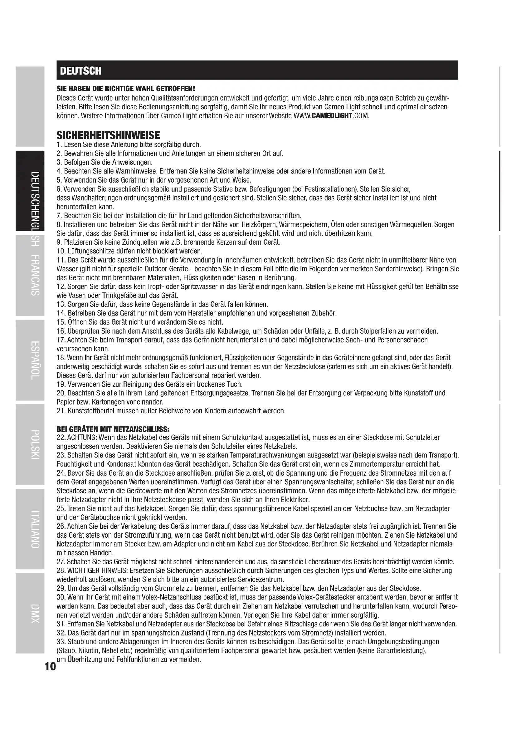 (Gültig in der Europäischen Union und anderen europäischen Ländern mit Mülltrennung) Dieses Symbol auf dem Produkt oder dazugehörigen Dokumenten weist darauf hin, dass das Gerät am Ende der Produktlebenszeit nicht zusammen mit dem normalen Hausmüll entsorgt werden darf, um Umwelt- oder Personenschäden durch unkontrollierte Abfallentsorgung zu vermeiden. Bitte entsorgen Sie dieses Produkt getrennt von anderen Abfällen und führen es zur Förderung nachhaltiger Wirtschaftskreisläufe dem Recycling zu. Als Privatkunde erhalten Sie Informationen zu umweltfreundlichen Entsorgungsmöglichkeiten über den Händler, bei dem das Produkt erworben wurde, oder über die entsprechenden regionalen Behörden. Als gewerblicher Nutzer kontaktieren Sie bitte Ihren Lieferanten und prüfen die ggf. vertraglich vereinbarten Konditionen zur Entsorgung der Geräte. Dieses Produkt darf nicht zusammen mit anderen gewerblichen Abfällen entsorgt werden. CE-Konformität Hiermit erklärt die Adam Hall GmbH, dass dieses Produkt folgenden Richtlinien entspricht (soweit zutreffend): R&TTE (1999/5/EG) bzw. RED (2014/53/EU) ab Juni 2017 Niederspannungsrichtlinie (2014/35/EU) EMV-Richtlinie (2014/30/EU) RoHS (2011/65/EU) Die vollständige Konformitätserklärung finden Sie unter www.adamhall.com. Des Weiteren können Sie diese auch unter info@adamhall.com anfragen.17 DMX DEUTSCHFRANCAIS ESPAÑOL ENGLISH ITALIANO POLSKI FRANCAIS Vous avez fait le bon choix! Cet appareil a été développé et fabriqué en appliquant des exigences de qualité très élevées: il garantit des années de fonctionnement sans problème.Veuillez lire attentivement ce Manuel Utilisateur : vous apprendrez rapidement à utiliser votre appareil Cameo Light de façon optimale. Vous trouverez davantage d‘informations à propos de Cameo Light sur notre site Web: WWW.CAMEOLIGHT.COM.