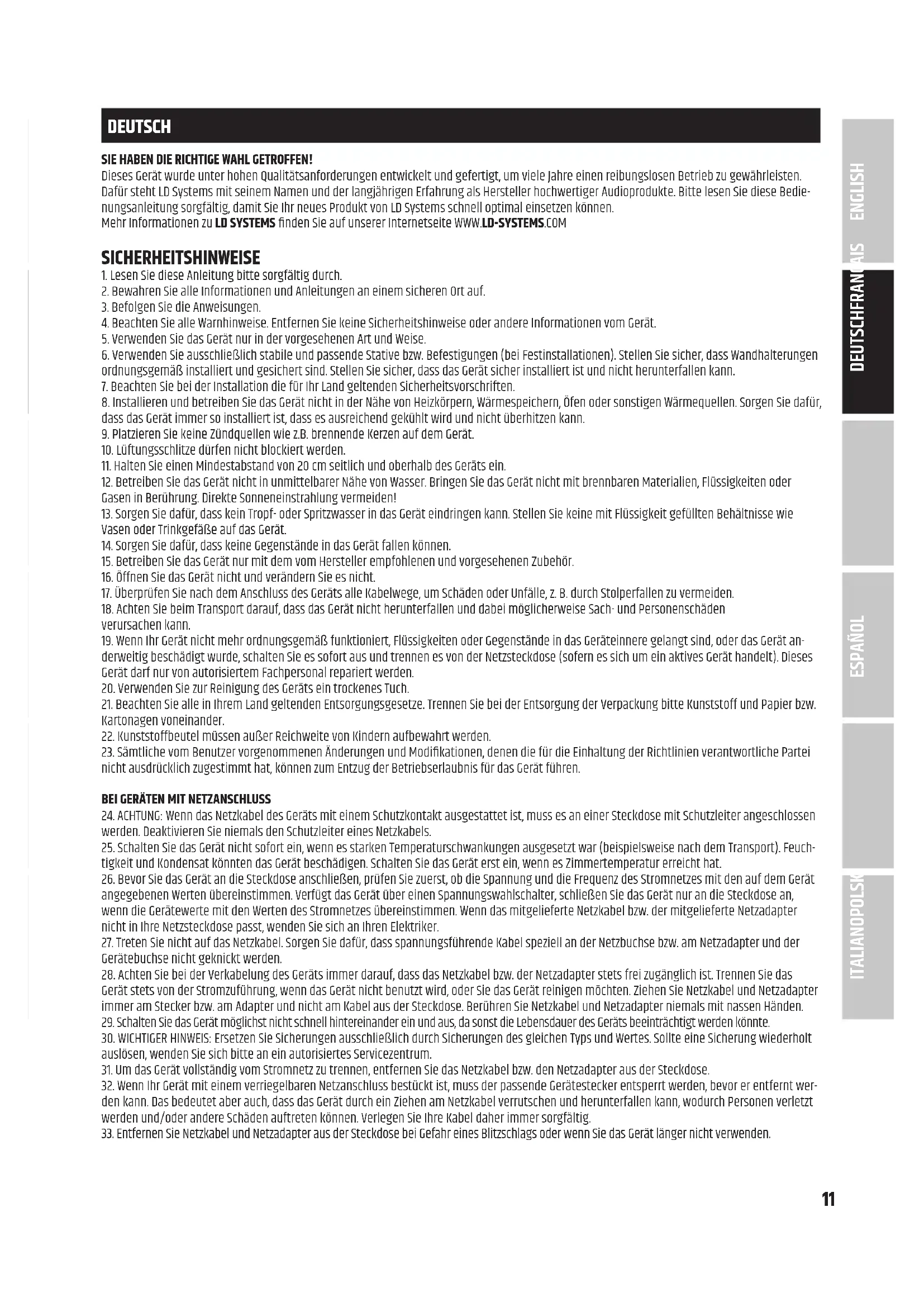 Unsere aktuellen Garantiebedingungen und Haftungsbeschränkung nden Sie unter: https://cdn-shop.adamhall.com/media/pdf/MANUFACTU- RERS-DECLARATIONS_LD_SYSTEMS.pdf. Im Service Fall wenden Sie sich bitte an Adam Hall GmbH, Adam-Hall-Str. 1, 61267 Neu Anspach / E-Mail Info@adamhall.com / +49 (0)6081 / 9419-0.