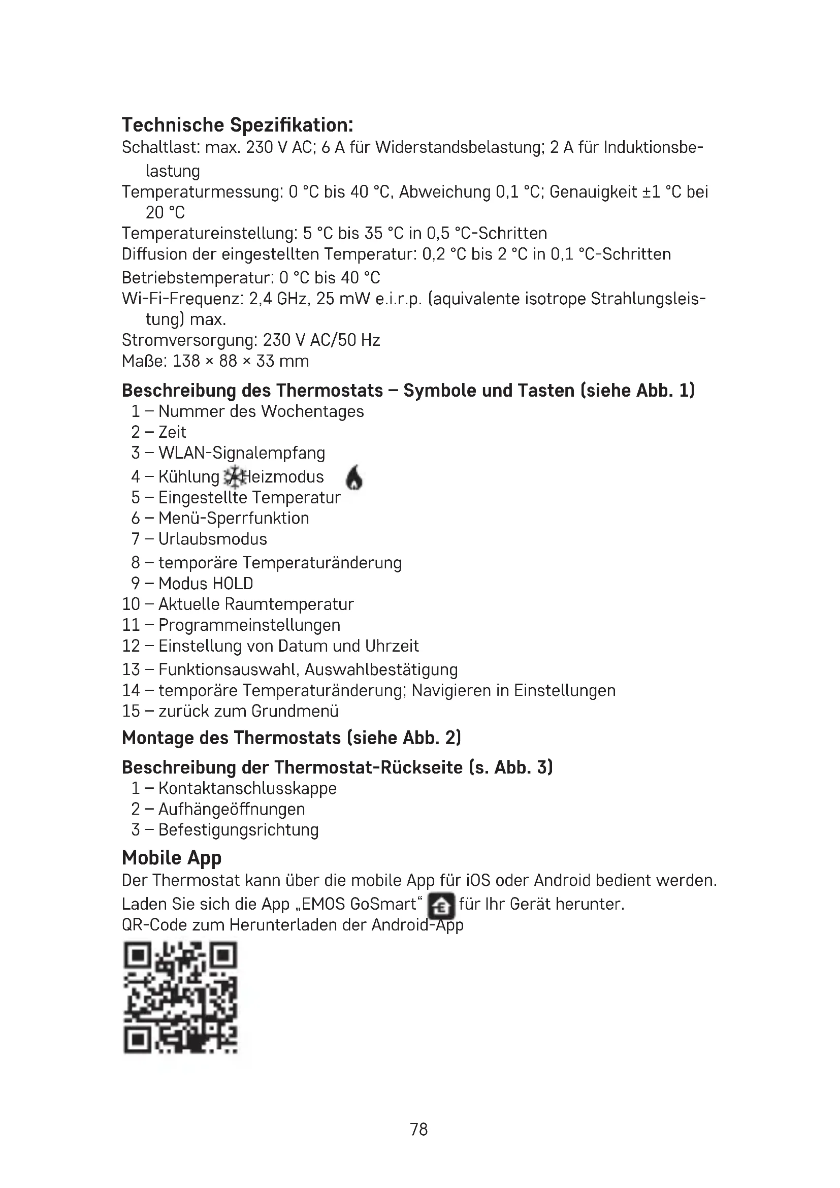 - Nije predviđeno da ovaj uređaj upotrebljavaju osobe (uključujući djecu) smanjenih zičkih, osjetilnih ili mentalnih sposobnosti koje nemaju iskustva i znanja za njihovu sigurnu upotrebu. Takve osobe treba podučiti kako koristiti uređaj i treba ih nadzirati osoba zadužena za njihovu sigurnost. Djeca se uvijek moraju nadzirati kako bi se osiguralo da se ne igraju s uređajem. POZOR: Sadržaj ovog priručnika može se mijenjati bez prethodnog obavještenja – zbog ograničenja u tisku prikazani simboli mogu se neznatno razlikovati od onih na zaslonu – sadržaj ovog priručnika ne smije se reproducirati bez dopuštenja proizvođača. Ne bacajte električne uređaje kao nerazvrstani komunalni otpad, koristite centre za sakupljanje razvrstanog otpada. Za aktualne informacije o centrima za sakupljanje otpada kontaktirajte lokalne vlasti. Ako se elek- trični uređaji odlože na deponije otpada, opasne materije mogu prodrijeti u podzemne vode i ući u lanac ishrane i oštetiti vaše zdravlje. EMOS spol. sr. o. ovime izjavljuje da je radijska oprema tipa P56201 u skladu s Direktivom 2014/53/EU. Cjeloviti tekst EU izjave o sukladnosti dostupan je na sljedećoj internetskoj adresi: http://www.emos.eu/download. DE | Thermostat Der Thermostat P56201 ist zur Steuerung von Heiz- und Klimaanlagen bestimmt. Wichtige Hinweise Lesen Sie sich vor dem ersten Gebrauch die Bedienungsanleitung für den Ther- mostat, den Kessel oder für die Klimaanlage aufmerksam durch. Schalten Sie vor der Installation die elektrische Stromzufuhr ab! Es wird empfohlen, die Installation von einem qualizierten Mitarbeiter vorneh- men zu lassen! Halten Sie bei der Installation die vorgeschriebenen Normen ein.78 Technische Spezikation: Schaltlast: max. 230 V AC; 6 A für Widerstandsbelastung; 2 A für Induktionsbe- lastung Temperaturmessung: 0 °C bis 40 °C, Abweichung 0,1 °C; Genauigkeit ±1 °C bei 20 °C Temperatureinstellung: 5 °C bis 35 °C in 0,5 °C-Schritten Diusion der eingestellten Temperatur: 0,2 °C bis 2 °C in 0,1 °C-Schritten Betriebstemperatur: 0 °C bis 40 °C Wi-Fi-Frequenz: 2,4 GHz, 25 mW e.i.r.p. (aquivalente isotrope Strahlungsleis- tung) max. Stromversorgung: 230 V AC/50 Hz Maße: 138 × 88 × 33 mm Beschreibung des Thermostats – Symbole und Tasten (siehe Abb. 1) 1 – Nummer des Wochentages 2 – Zeit 3 – WLAN-Signalempfang 4 – Kühlung / Heizmodus 5 – Eingestellte Temperatur 6 – Menü-Sperrfunktion 7 – Urlaubsmodus 8 – temporäre Temperaturänderung 9 – Modus HOLD 10 – Aktuelle Raumtemperatur 11 – Programmeinstellungen 12 – Einstellung von Datum und Uhrzeit 13 – Funktionsauswahl, Auswahlbestätigung 14 – temporäre Temperaturänderung; Navigieren in Einstellungen 15 – zurück zum Grundmenü Montage des Thermostats (siehe Abb. 2) Beschreibung der Thermostat-Rückseite (s. Abb. 3) 1 – Kontaktanschlusskappe 2 – Aufhängeönungen 3 – Befestigungsrichtung Mobile App Der Thermostat kann über die mobile App für iOS oder Android bedient werden. Laden Sie sich die App „EMOS GoSmart“ für Ihr Gerät herunter. QR-Code zum Herunterladen der Android-App79 QR-Code zum Herunterladen der iOS-App Beschreibung der Registrierung und Anmeldung in der App (siehe Abb. 4) Zur Verwendung der mobilen App müssen Sie sich zuerst registrieren. Hierfür klicken Sie auf die Schaltäche Registrieren. Geben Sie das Land und die E-Mail-Adresse ein, setzen Sie den Haken um der Benutzervereinbarung zuzustimmen und klicken Sie auf Bestätigungscode holen. Geben Sie den Bestätigungscode ein, der an Ihre E-Mail-Adresse gesendet wurde. Legen Sie dann ein Passwort für Ihr Konto fest und klicken Sie auf die Schalt- äche Fertig. Aktivieren Sie nach eigenem Ermessen die Datenanalyse-/Personalisierungsop- tionen und klicken Sie auf Zur Applikation übergehen. Verbindung des Thermostats mit dem WLAN-Netz zur Bedienung über die mobile App (siehe Abb. 5) Drücken Sie die Taste 5 Sekunden lang. Drücken Sie dann die Taste für ca. 3 Sekunden. E2 wird angezeigt und das Symbol blinkt. Klicken Sie in der App auf Gerät hinzufügen, den Zugang zur Position genehmigen. Manuelle Gerätesuche Kleine Haushaltsgeräte – Thermostat (WLAN) oder Andere – Andere (WLAN) auswählen. Wählen Sie ein 2,4-GHz-WLAN-Netzwerk aus, geben Sie das Passwort ein und klicken Sie auf Weiter. Haken setzen bei Bestätigen, dass die Kontrollleuchte schnell blinkt und auf Weiter klicken. Innerhalb von 2 Minuten wird der ausgewählte Thermostat in der Anwendung angezeigt. Klicken Sie auf den grünen Pfeil rechts, der Thermostat wird der Anwendung hinzugefügt. Klicken Sie dann auf das Thermostat-Symbol in der Anwendung, das Grund-Steu- erungsmenü wird angezeigt. Anmerkung: Wenn der Thermostat nicht gekoppelt werden kann, wiederholen Sie den ge- samten Vorgang erneut. 5-GHz-WLAN-Netzwerk wird nicht unterstützt. Über die App kann der Thermostat von max. 1 Benutzer bedient werden. Sofern ein weiterer Benutzer den Thermostat bedienen möchte, muss sich der vorher- gehende Benutzer in der App ab, abmelden. Beschreibung des Grundmenüs der mobilen App Klicken Sie auf das Thermostat-Symbol in der App, das Grund-Steuerungsmenü wird angezeigt (siehe Abb. 6).80
