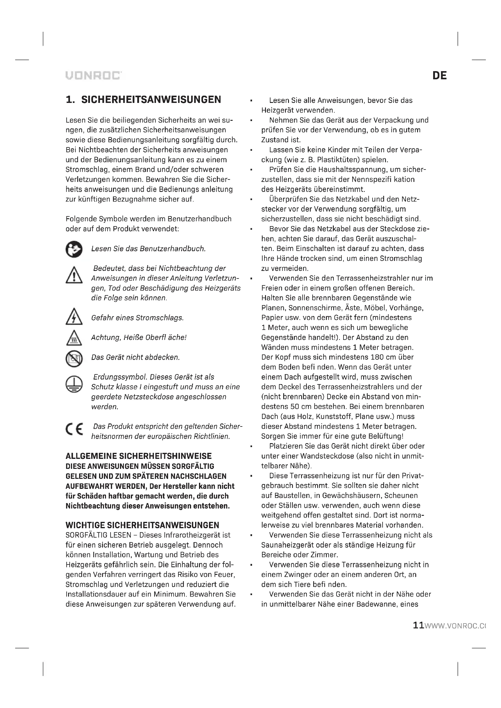 Lesen Sie die beiliegenden Sicherheits an wei su- ngen, die zusätzlichen Sicherheitsanweisungen sowie diese Bedienungsanleitung sorgfältig durch. Bei Nichtbeachten der Sicherheits anweisungen und der Bedienungsanleitung kann es zu einem Stromschlag, einem Brand und/oder schweren Verletzungen kommen. Bewahren Sie die Sicher- heits anweisungen und die Bedienungs anleitung zur künftigen Bezugnahme sicher auf. Folgende Symbole werden im Benutzerhandbuch oder auf dem Produkt verwendet: Lesen Sie das Benutzerhandbuch. Bedeutet, dass bei Nichtbeachtung der Anweisungen in dieser Anleitung Verletzun- gen, Tod oder Beschädigung des Heizgeräts die Folge sein können. Gefahr eines Stromschlags. Achtung, Heiße Oberfl äche! Das Gerät nicht abdecken. Erdungssymbol. Dieses Gerät ist als Schutz klasse I eingestuft und muss an eine geerdete Netzsteckdose angeschlossen werden. Das Produkt entspricht den geltenden Sicher- heitsnormen der europäischen Richtlinien. ALLGEMEINE SICHERHEITSHINWEISE