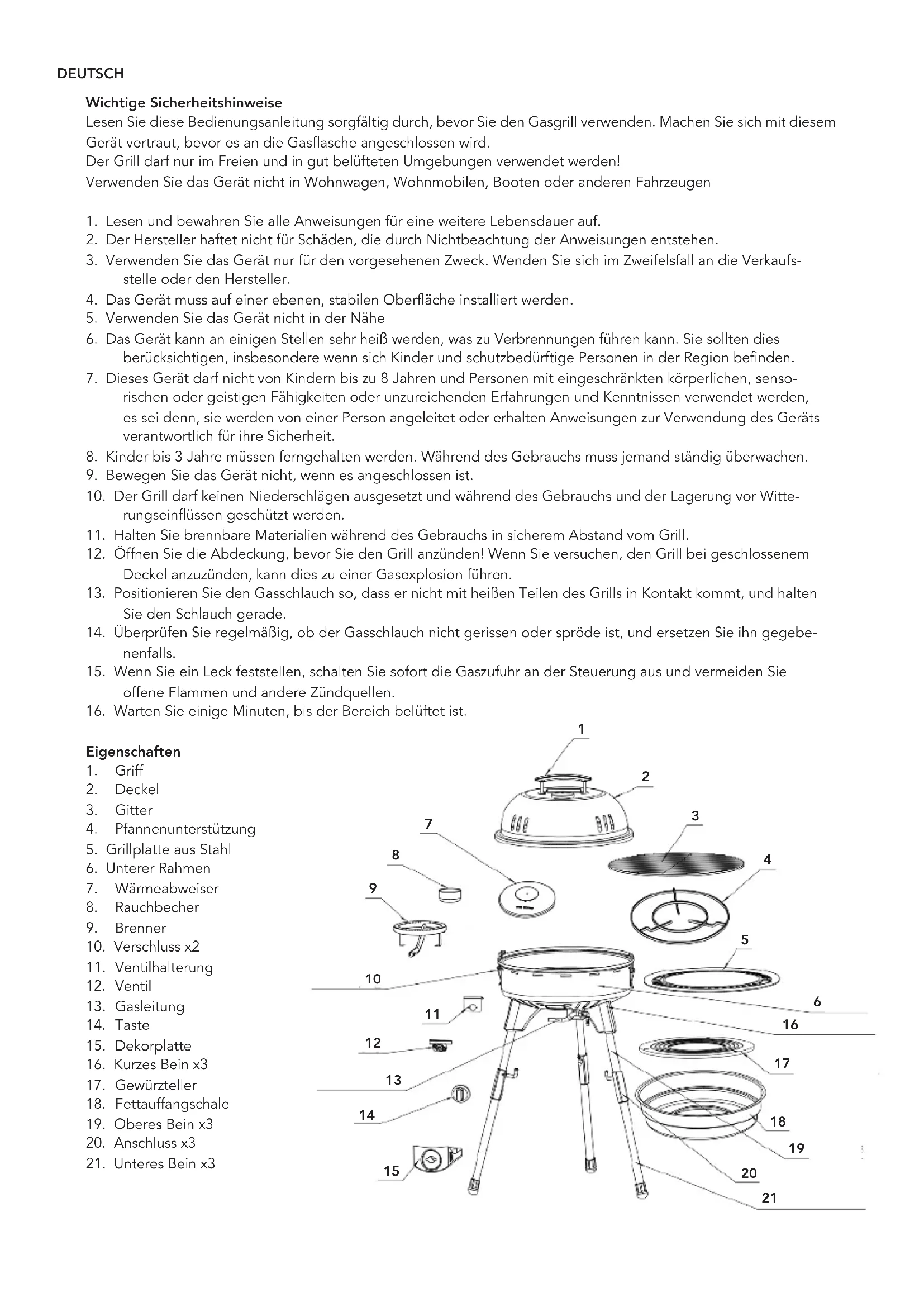 Wichtige Sicherheitshinweise Lesen Sie diese Bedienungsanleitung sorgfältig durch, bevor Sie den Gasgrill verwenden. Machen Sie sich mit diesem Gerät vertraut, bevor es an die Gasflasche angeschlossen wird. Der Grill darf nur im Freien und in gut belüfteten Umgebungen verwendet werden! Verwenden Sie das Gerät nicht in Wohnwagen, Wohnmobilen, Booten oder anderen Fahrzeugen