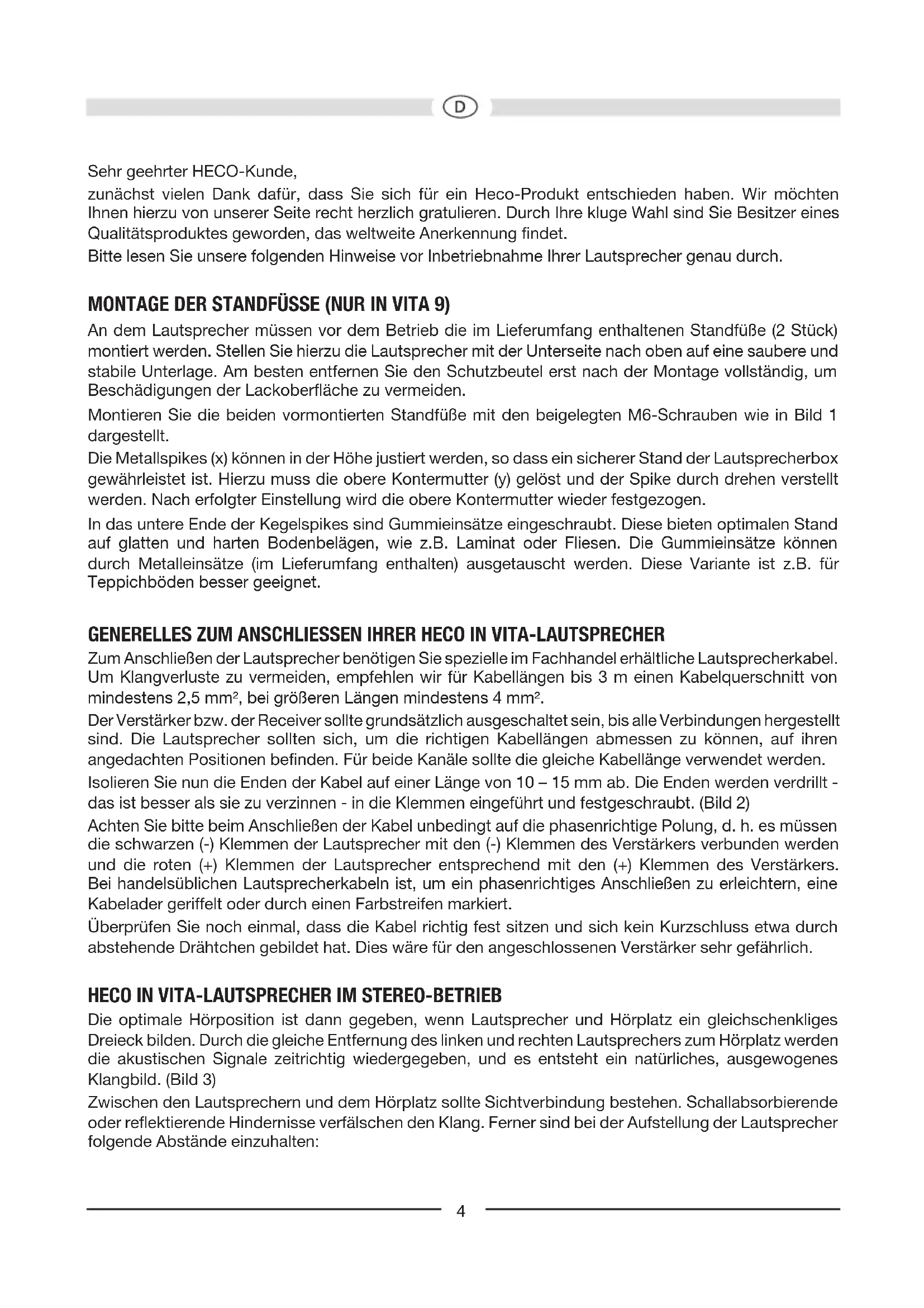 Abbildungen/Illustrations4 Sehr geehrter HECO-Kunde, zunächst vielen Dank dafür, dass Sie sich für ein Heco-Produkt entschieden haben. Wir möchten Ihnen hierzu von unserer Seite recht herzlich gratulieren. Durch Ihre kluge Wahl sind Sie Besitzer eines Qualitätsproduktes geworden, das weltweite Anerkennung findet. Bitte lesen Sie unsere folgenden Hinweise vor Inbetriebnahme Ihrer Lautsprecher genau durch. MONTAGE DER STANDFÜSSE (NUR IN VITA 9) An dem Lautsprecher müssen vor dem Betrieb die im Lieferumfang enthaltenen Standfüße (2 Stück) montiert werden. Stellen Sie hierzu die Lautsprecher mit der Unterseite nach oben auf eine saubere und stabile Unterlage. Am besten entfernen Sie den Schutzbeutel erst nach der Montage vollständig, um Beschädigungen der Lackoberfläche zu vermeiden. Montieren Sie die beiden vormontierten Standfüße mit den beigelegten M6-Schrauben wie in Bild 1 dargestellt. Die Metallspikes (x) können in der Höhe justiert werden, so dass ein sicherer Stand der Lautsprecherbox gewährleistet ist. Hierzu muss die obere Kontermutter (y) gelöst und der Spike durch drehen verstellt werden. Nach erfolgter Einstellung wird die obere Kontermutter wieder festgezogen. In das untere Ende der Kegelspikes sind Gummieinsätze eingeschraubt. Diese bieten optimalen Stand auf glatten und harten Bodenbelägen, wie z.B. Laminat oder Fliesen. Die Gummieinsätze können durch Metalleinsätze (im Lieferumfang enthalten) ausgetauscht werden. Diese Variante ist z.B. für Teppichböden besser geeignet. GENERELLES ZUM ANSCHLIESSEN IHRER HECO IN VITA-LAUTSPRECHER Zum Anschließen der Lautsprecher benötigen Sie spezielle im Fachhandel erhältliche Lautsprecherkabel. Um Klangverluste zu vermeiden, empfehlen wir für Kabellängen bis 3 m einen Kabelquerschnitt von mindestens 2,5 mm², bei größeren Längen mindestens 4 mm². Der Verstärker bzw. der Receiver sollte grundsätzlich ausgeschaltet sein, bis alle Verbindungen hergestellt sind. Die Lautsprecher sollten sich, um die richtigen Kabellängen abmessen zu können, auf ihren angedachten Positionen befinden. Für beide Kanäle sollte die gleiche Kabellänge verwendet werden. Isolieren Sie nun die Enden der Kabel auf einer Länge von 10 – 15 mm ab. Die Enden werden verdrillt - das ist besser als sie zu verzinnen - in die Klemmen eingeführt und festgeschraubt. (Bild 2) Achten Sie bitte beim Anschließen der Kabel unbedingt auf die phasenrichtige Polung, d. h. es müssen die schwarzen (-) Klemmen der Lautsprecher mit den (-) Klemmen des Verstärkers verbunden werden und die roten (+) Klemmen der Lautsprecher entsprechend mit den (+) Klemmen des Verstärkers. Bei handelsüblichen Lautsprecherkabeln ist, um ein phasenrichtiges Anschließen zu erleichtern, eine Kabelader geriffelt oder durch einen Farbstreifen markiert. Überprüfen Sie noch einmal, dass die Kabel richtig fest sitzen und sich kein Kurzschluss etwa durch abstehende Drähtchen gebildet hat. Dies wäre für den angeschlossenen Verstärker sehr gefährlich.