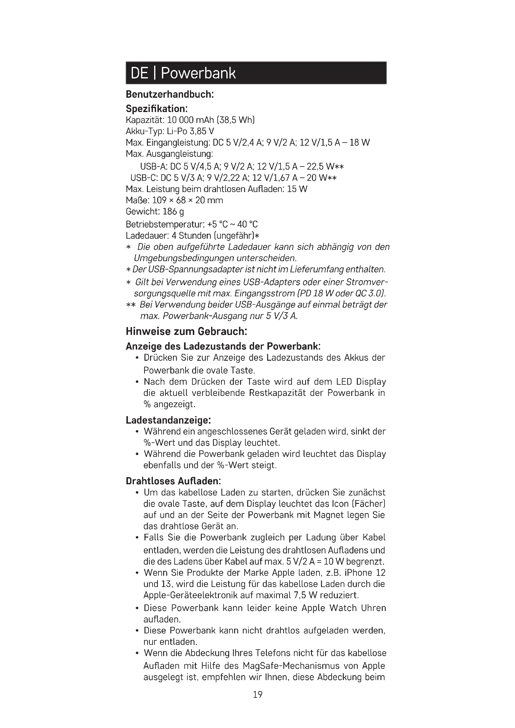 - Falls Sie die Powerbank zugleich per Ladung über Kabel entladen, werden die Leistung des drahtlosen Auadens und die des Ladens über Kabel auf max. 5 V/2 A = 10 W begrenzt.
