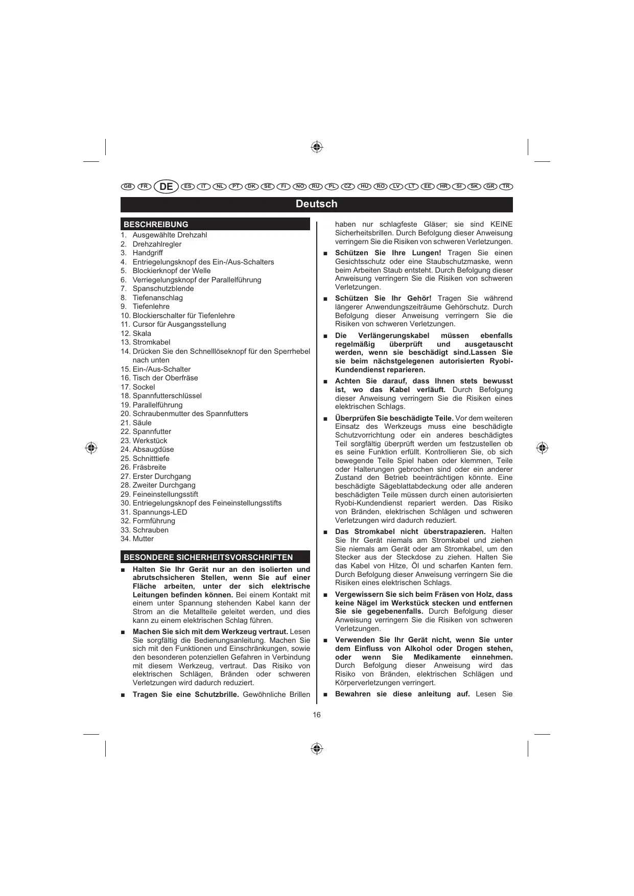 der ursprünglichen Schutzisolierung abgeschirmt. Doppeltisolierte Produkte müssen nicht geerdet werden. Siehe Abbildung 16. WARNUNG FORMFÜHRUNG Das Doppelisolierungssystem soll den Anwender vor einem Stromschlag aufgrund eines Defekts an der internen Isolierung des Produkts schützen. Zur Vermeidung von elektrischen Schlägen müssen alle normalerweise üblichen Sicherheitsvorkehrungen getroffen werden. Siehe Abbildung 17. Die Formführung kann am Tisch der Oberfräse befestigt werden, um Kurven und andere komplexe Formen präzise duplizieren zu können. Mit einer Stichsäge können Sie auf einfache Weise eine Vorlage des gewünschten Motivs erzielen. Befestigen Sie die Führung am Tisch der Oberfräse, indem Sie die beiden Schrauben entfernen, die die Absaugdüse halten. Setzen Sie die Führung anschließend auf die hierfür vorgesehene Tischrille, setzen Sie die Absaugdüse wieder ein und befestigen Sie diese Montage mithilfe der beiden Schrauben. Die Führung muss geringfügig unter dem Tisch herausragen, damit die Oberfräse den Konturen der Vorlage folgen kann.Befestigen Sie die Vorlage fest am Werkstück und üben Sie einen konstanten Druck auf die Oberfräse aus, so dass der Rand der Führung der Vorlage einwandfrei folgt. Die Vorlage muss eine Dicke von mindestens 5 mm haben, damit die Führung unter dem Tisch herausragen kann. Es muss außerdem ausreichend Platz zwischen der schneidenden Kante des Fräsers und dem äußeren Rand der Vorlage vorhanden sein. Wichtig! Die Wartung eines Geräts mit Doppelisolierung erfordert äußerste Sorgfalt und Systemkenntnisse und sollte daher nur durch einen quali zierten Servicetechniker durchgeführt werden. Wir empfehlen Ihnen, Ihr Gerät zur Ausführung von Reparaturen zum nächstgelegenen autorisierten Ryobi-Kundendienst zu bringen. WARNUNG Versuchen Sie nicht, dieses Werkzeug zu verändern oder mit Zubehör zu verwenden, das nicht zur Verwendung mit diesem Werkzeug empfohlen ist. Solche Veränderungen oder Modikationen stellen eine missbräuchliche Verwendung dar und können gefährliche Arbeitsbedingungen schaffen, die möglicherweise zu schweren Verletzungen führen. ERGONOMIE Dieses Gerät wurde für eine einfache Handhabung konzipiert, bietet einen hohen Benutzungskomfort und kann einfach gehalten werden, wenn Sie in verschiedenen Positionen und mit verschiedenen Winkeln arbeiten. EINSTELLUNGEN WARNUNG ELEKTRISCHE VERBINDUNG Ihre Oberfräse ist mit einem professionellen integrierten Motor ausgestattet. Die Oberfräse muss an eine Netzsteckdose angeschlossen werden, deren Spannung den auf dem Typenschild des Geräts angegebenen Werten (nur Wechselstrom) entspricht. Betreiben Sie dieses Produkt nicht mit Gleichstrom (DC). Ein Spannungsabfall von über 10% kann zu einer Überhitzung des Motors und einer Leistungsverminderung führen. Falls Ihr Werkzeug nicht funktioniert, nachdem sie es an eine Steckdose angeschlossen haben, überprüfen Sie die Stromversorgung. Während der Montage von Teilen, dem Durchführen von Einstellungen, dem Einsetzen oder Entfernen von Fräsern oder während Sie sie nicht verwenden, darf die Oberfräse niemals mit der Netzsteckdose verbunden sein. Dadurch, dass das Werkzeug vom Stromkreis getrennt wird, wird ein unbeabsichtigtes Einschalten, das schwere Verletzungen verursachen könnte, verhindert.