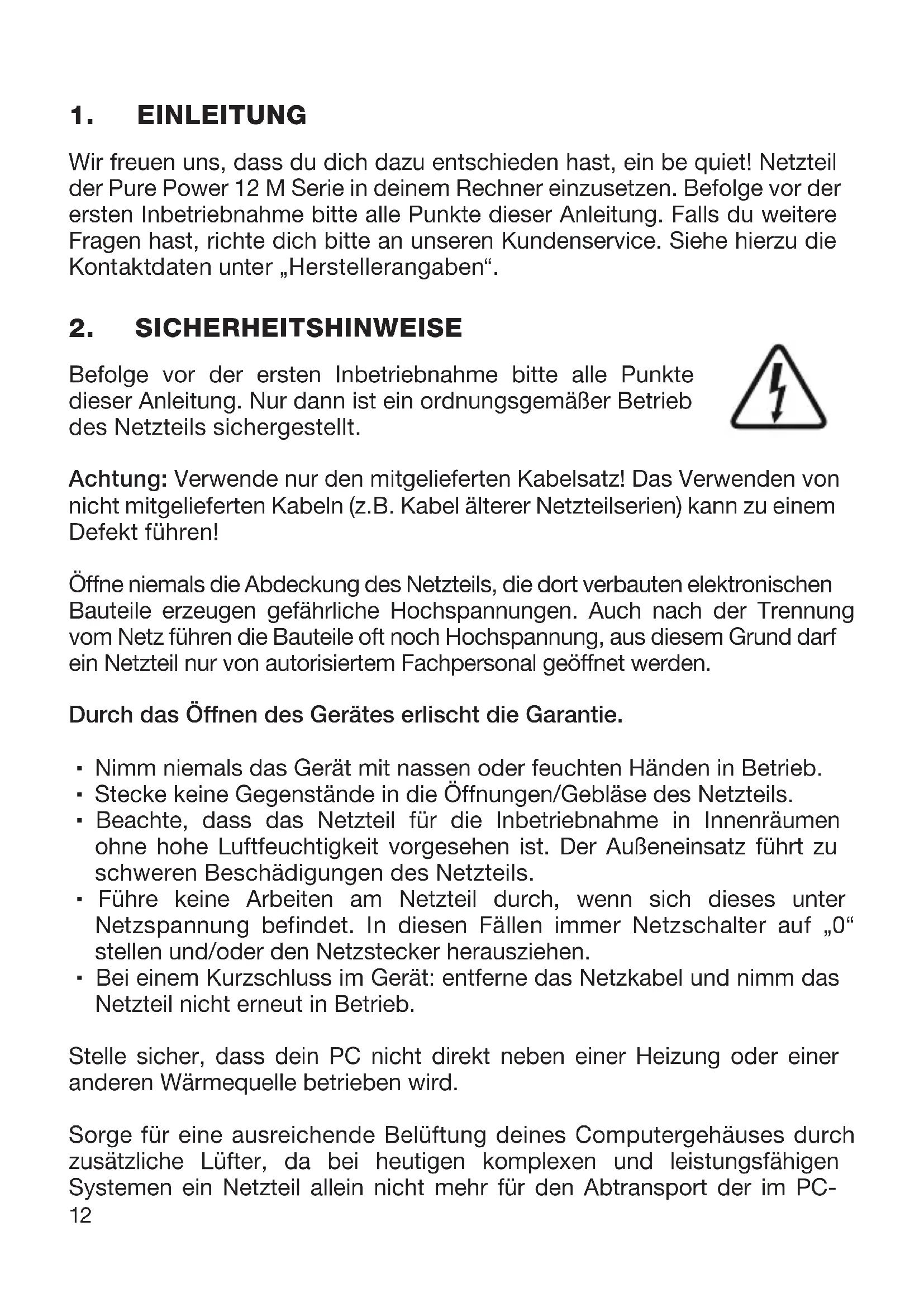 Wir freuen uns, dass du dich dazu entschieden hast, ein be quiet! Netzteil der Pure Power 12 M Serie in deinem Rechner einzusetzen Befolge vor der ersten Inbetriebnahme bitte alle Punkte dieser Anleitung Falls du weitere Fragen hast, richte dich bitte an unseren Kundenservice Siehe hierzu die Kontaktdaten unter „Herstellerangaben“