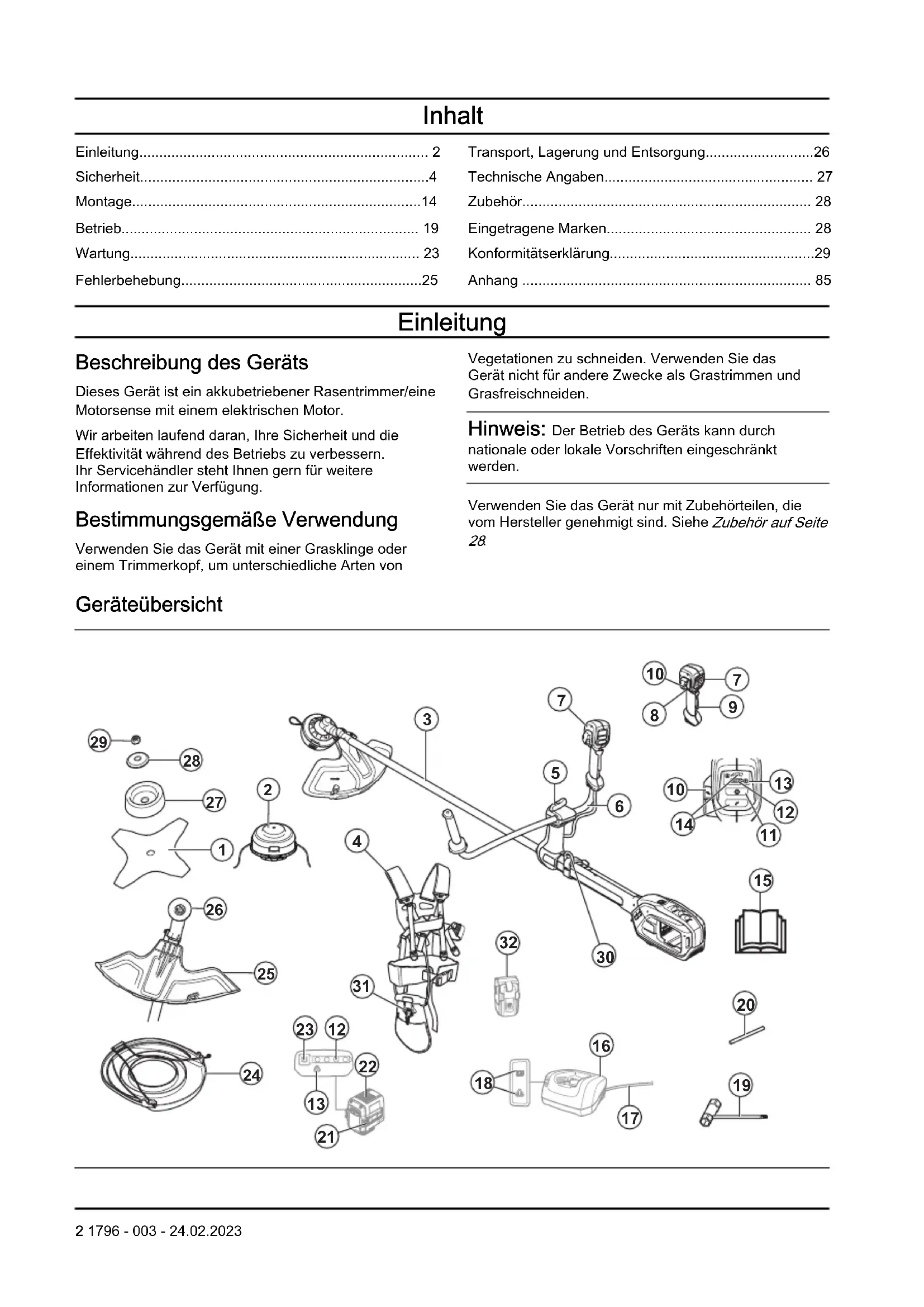 - Verwenden Sie nur vom Hersteller angegebene Ersatzschneidwerkzeuge, -fäden, -schneidköpfe und 1796 - 003 - 24.02.2023 7-klingen. Nicht ordnungsgemäße Ersatzteile können zu Kontrollverlust, Brüchen und Verletzungen führen. Ursachen für Klingenstoß und damit einhergehende Warnungen