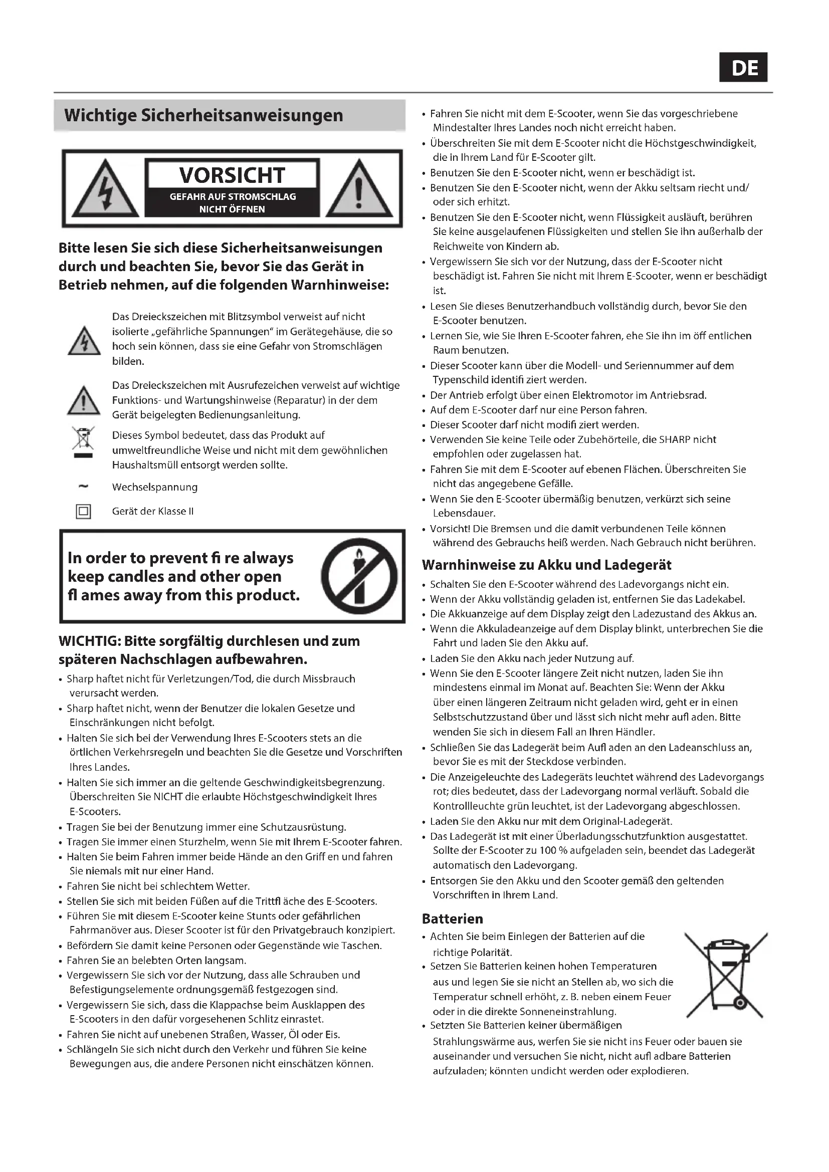 - Lesen Sie dieses Benutzerhandbuch vollständig durch, bevor Sie den E-Scooter benutzen.• Lernen Sie, wie Sie Ihren E-Scooter fahren, ehe Sie ihn im ö entlichen Raum benutzen.• Dieser Scooter kann über die Modell- und Seriennummer auf dem Typenschild identi ziert werden.• Der Antrieb erfolgt über einen Elektromotor im Antriebsrad.• Auf dem E-Scooter darf nur eine Person fahren.• Dieser Scooter darf nicht modi ziert werden.• Verwenden Sie keine Teile oder Zubehörteile, die SHARP nicht empfohlen oder zugelassen hat.• Fahren Sie mit dem E-Scooter auf ebenen Flächen. Überschreiten Sie nicht das angegebene Gefälle.• Wenn Sie den E-Scooter übermäßig benutzen, verkürzt sich seine Lebensdauer.• Vorsicht! Die Bremsen und die damit verbundenen Teile können während des Gebrauchs heiß werden. Nach Gebrauch nicht berühren. Warnhinweise zu Akku und Ladegerät
