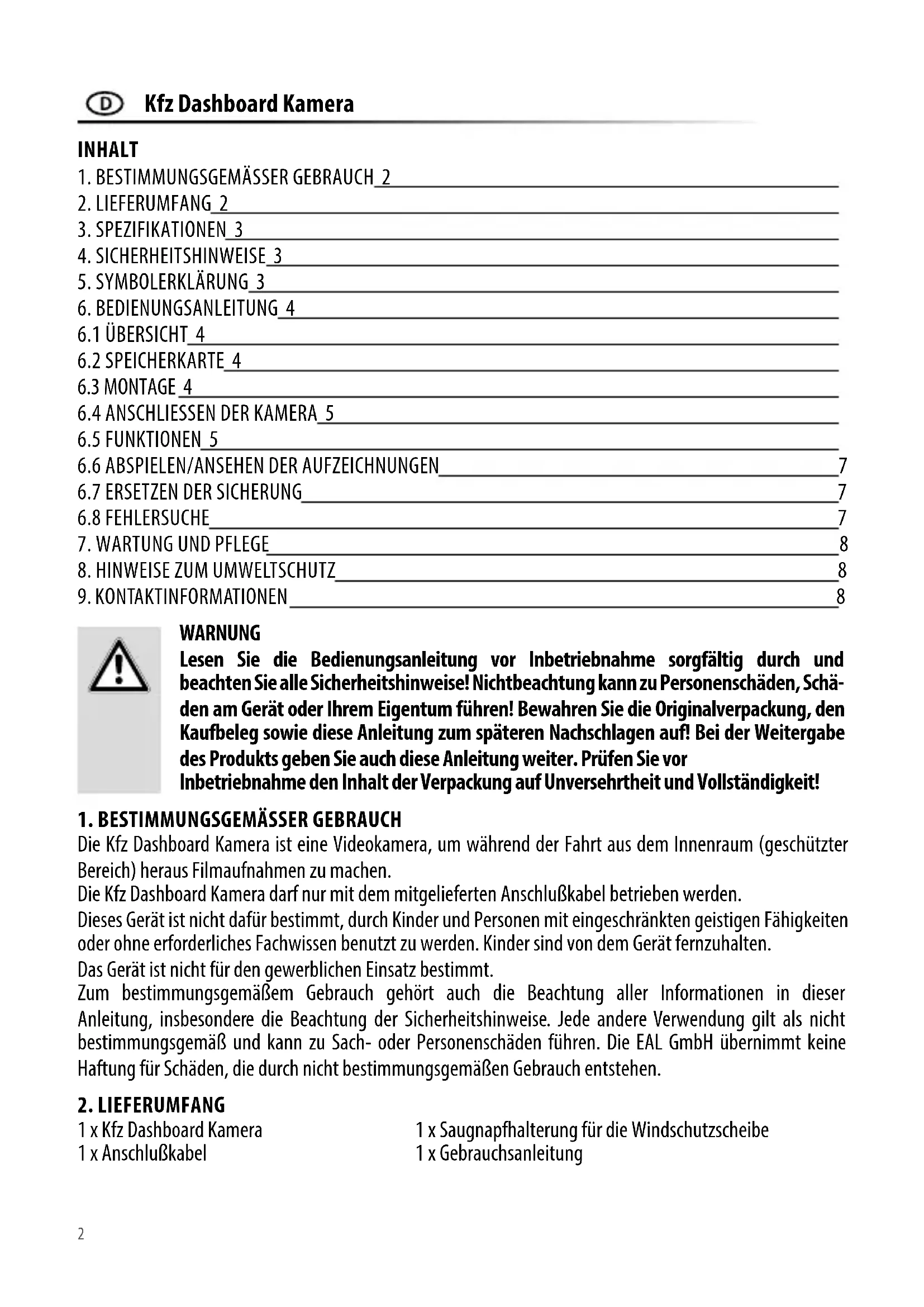 EAL GmbH Otto-Hausmann-Ring 107 42115 Wuppertal, Deutschland +49 (0)202 42 92 83 0 +49 (0) 202 42 92 83 – 160 info@eal-vertrieb.com www.eal-vertrieb.com Die Speicherkarte ist nicht korrekt ein- gesetzt Setzen Sie die Speicherkarte richtig ein Schreibschutz der Speicherkarte aktiviert Deaktivieren Sie den Schreibschutz der Speicherkarte Die Speicherkarte ist nicht formatiert Formatieren Sie die Speicherkarte (Format im Abschnitt 6.5 Funktionen) Der freie Speicherplatz ist zu gering Löschen Sie einige Dateien um Speicherplatz freizugeben Die Speicherkarte ist defekt Setzen Sie probeweise eine andere Karte ein Das Objektive der Kamera ist verschmutzt Reinigen Sie vorsichtig das Objektiv Starkes Licht fällt direkt in das Objektiv der Kamera Sobald der starke Lichteinfall nachlässt, ist die Bildqualität wieder in Ordnung Falsche Lichtfrequenz ist eingestellt Stellen Sie die passende Lichtfrequenz zur künstlichen Beleuchtung ein (Licht- frequenz in Abschnitt 6.5 Funktionen) Kein Speichern möglich Monitor zeigt kein klares Bild Fehler / Störung Mögliche Ursache Abhilfe / Lösung9 WARNING Please read the operating instructions carefully prior to use and observe all safety instructions! Not observing such may lead to personal injury, damage to the device or to your property! Store the original packaging, the receipt and these instructions so that they may be consulted at a later date! When passing on the product, please include these operating instructions as well. Please check the contents of package for integrity and completeness prior to use! CONTENTS The vehicle dashboard camera is a video camera designed to record moving images from the interior of the vehicle (protected area) during the journey. The vehicle dashboard camera may only be operated using the supplied connecting cable. This device is not designed to be used by children or persons with limited mental abilities or without experience and/or lack of required specialist knowledge. Keep children away from the device. The device is not designated for commercial use. Use according to the intended purpose also includes the observance of all information in these operating instructions, particularly the observance of the safety notes. Any other utilisation is considered to be cont- rary to the intended purpose and may lead to material damage or personal injuries. EAL GmbH assumes no liability for damage resulting from improper use.