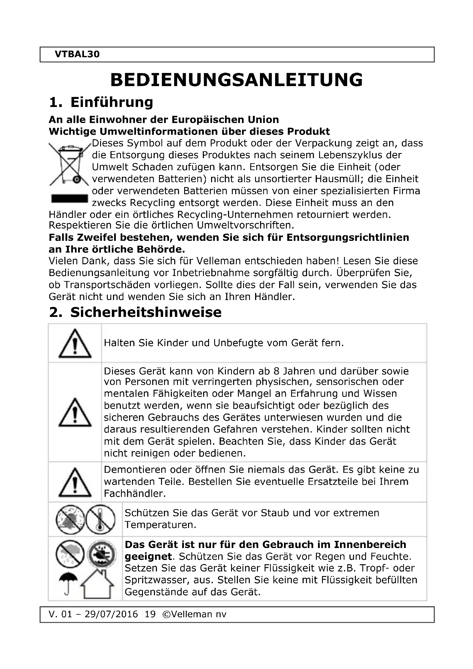 Das Gerät ist nur für den Gebrauch im Innenbereich geeignet. Schützen Sie das Gerät vor Regen und Feuchte. Setzen Sie das Gerät keiner Flüssigkeit wie z.B. Tropf- oder Spritzwasser, aus. Stellen Sie keine mit Flüssigkeit befüllten Gegenstände auf das Gerät.VTBAL30