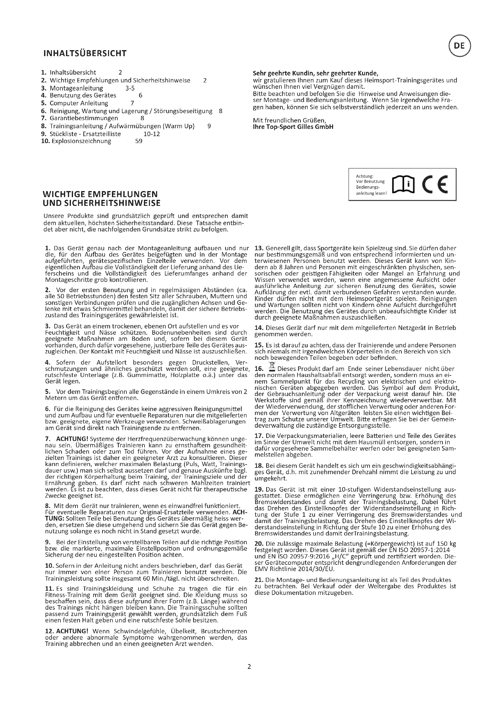 INHALTSÜBERSICHT WICHTIGE EMPFEHLUNGEN UND SICHERHEITSHINWEISE Sehr geehrte Kundin, sehr geehrter Kunde, wir gratulieren Ihnen zum Kauf dieses Heimsport-Trainingsgerätes und wünschen Ihnen viel Vergnügen damit. Bie beachten und befolgen Sie die Hinweise und Anweisungen die- ser Montage- und Bedienungsanleitung. Wenn Sie irgendwelche Fra- gen haben, können Sie sich selbstverständlich jederzeit an uns wenden. Mit freundlichen Grüßen, Ihre Top-Sport Gilles GmbH Achtung: Vor Benutzung Bedienungs- anleitung lesen!