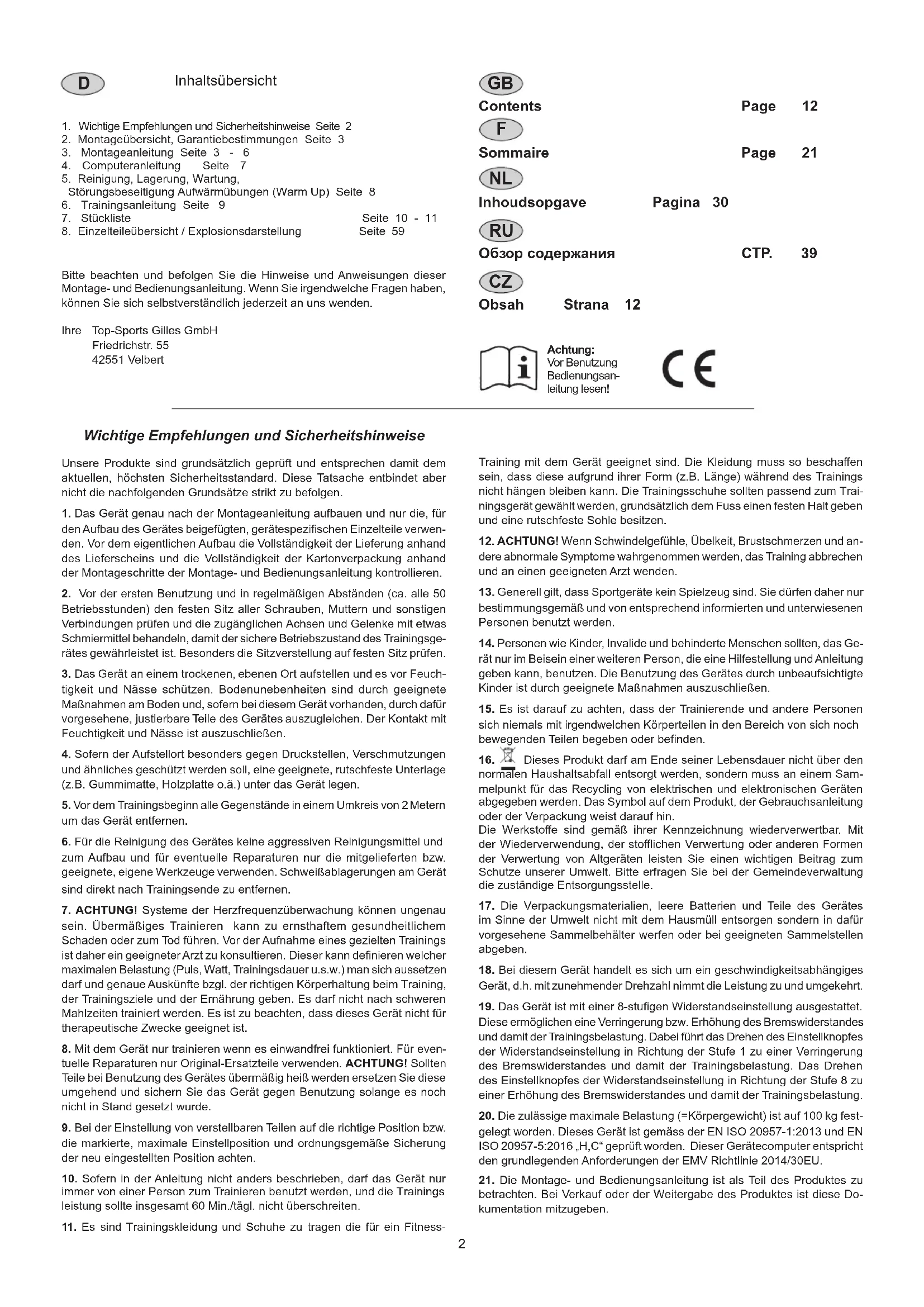 Обзор содержания CTP. 39 Obsah Strana 123 Deutsch Garantiebestimmungen Die Garantie beträgt 24 Monate, gilt für Neuware bei Ersterwerb und beginnt mit dem Rechnungs- bzw. Auslieferdatum. Während der Garantiezeit werden eventuelle Mängel kostenlos beseitigt. Bei Feststellung eines Mangels sind Sie verpichtet diesen unverzüglich dem Hersteller zu melden. Es steht im Ermessen des Herstellers die Garantie durch Ersatzteilversand oder Reparatur zu erfüllen. Bei Ersatzteilversand besteht die Befugnis des Austausches ohne Garantieverlust Eine Instandsetzung am Aufstellort ist ausgeschlossen. Heimsportgeräte sind nicht für eine kommerzielle oder gewerbliche Nutzung geeignet. Eine Zuwiderhandlung in der Nutzung hat eine Garantieverkürzung oder Garantieverlust zur Folge. Die Garantieleistung gilt nur für Material oder Fabrikationsfehler. Bei Verschleißteilen oder Beschädigungen durch missbräuchliche oder unsachgemäße Behandlung, Gewaltanwendung und Eingrien die ohne vorherige Absprache mit unserer Service Abteilung vorgenommen werden, erlischt die Garantie. Bitte bewahren Sie, falls möglich, die Originalverpackung für die Dauer der Garantiezeit auf, um im Falle einer Rücksendung die Ware ausreichend zu schützen und senden Sie keine Ware unfrei zur Service Abteilung ein! Eine Inanspruchnahme von Garantieleistungen erwirkt keine Verlängerung der Garantiezeit. Ansprüche auf Ersatz von Schäden welche evtl. außerhalb des Gerätes entstehen (sofern eine Haftung nicht zwingend gesetzlich geregelt ist) sind ausgeschlossen. Hersteller: Top-Sports Gilles GmbH Friedrichstr. 55 42551 Velbert Montageübersicht: Assembly overview: Aperçu de l‘Assemblée: Montage overzicht: Обзор Ассамблея: Přehled sestavy: