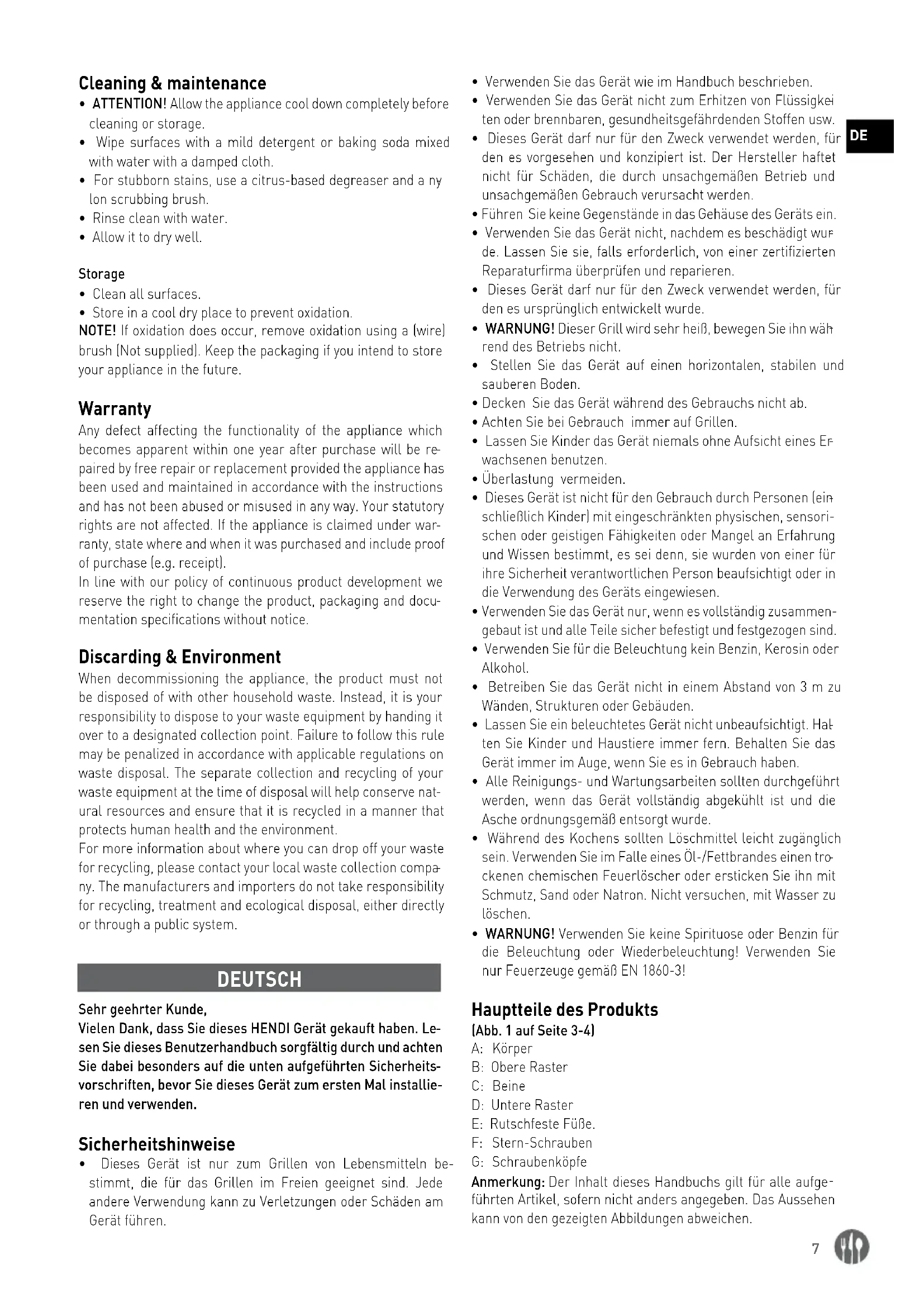- WARNUNG! Verwenden Sie keine Spirituose oder Benzin für die Beleuchtung oder Wiederbeleuchtung! Verwenden Sie nur Feuerzeuge gemäß EN 1860-3! Hauptteile des Produkts (Abb. 1 auf Seite 3-4) A: Körper B: Obere Raster C: Beine D: Untere Raster E: Rutschfeste Füße. F: Stern-Schrauben G: Schraubenköpfe Anmerkung: Der Inhalt dieses Handbuchs gilt für alle aufge