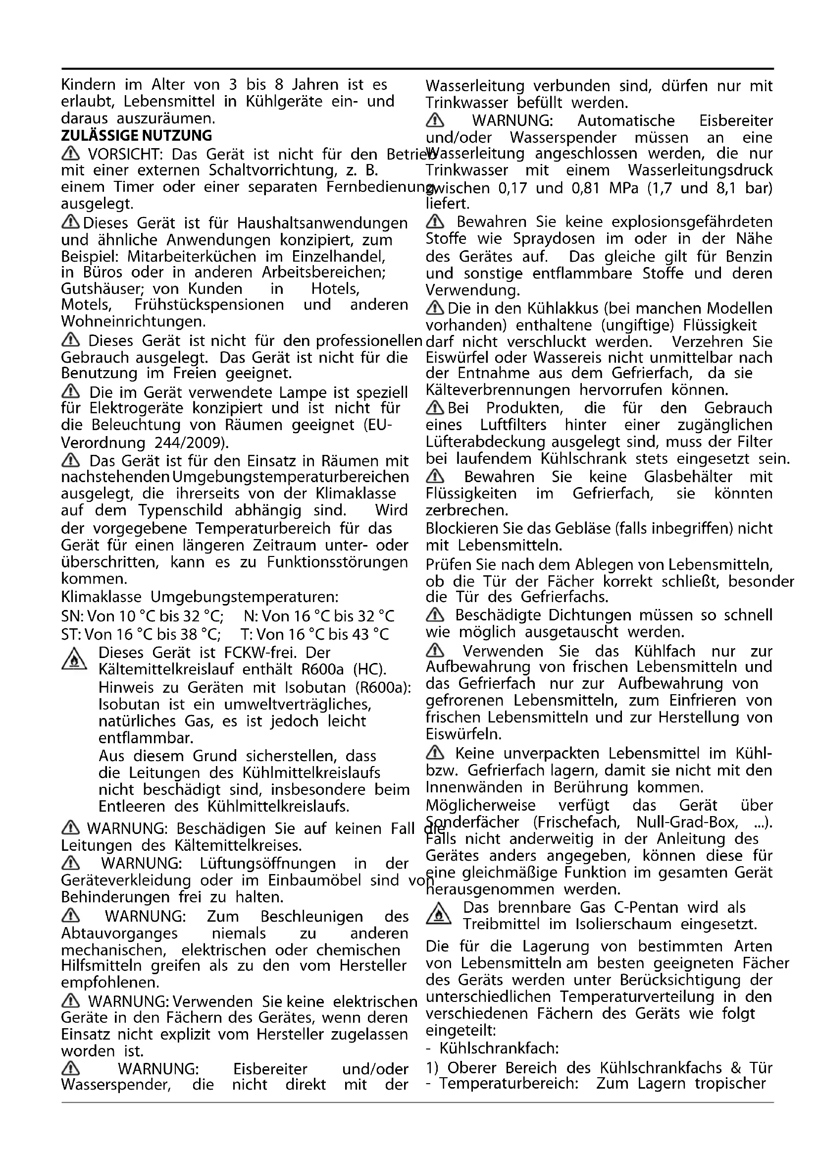 VORSICHT: Das Gerät ist nicht für den Betrieb mit einer externen Schaltvorrichtung, z. B. einem Timer oder einer separaten Fernbedienung, ausgelegt. Dieses Gerät ist für Haushaltsanwendungen und ähnliche Anwendungen konzipiert, zum Beispiel: Mitarbeiterküchen im Einzelhandel, in Büros oder in anderen Arbeitsbereichen; Gutshäuser; von Kunden in Hotels, Motels, Frühstückspensionen und anderen Wohneinrichtungen. Dieses Gerät ist nicht für den professionellen Gebrauch ausgelegt. Das Gerät ist nicht für die Benutzung im Freien geeignet. Die im Gerät verwendete Lampe ist speziell für Elektrogeräte konzipiert und ist nicht für die Beleuchtung von Räumen geeignet (EU- Verordnung 244/2009). Das Gerät ist für den Einsatz in Räumen mit nachstehendenUmgebungstemperaturbereichen ausgelegt, die ihrerseits von der Klimaklasse auf dem Typenschild abhängig sind. Wird der vorgegebene Temperaturbereich für das Gerät für einen längeren Zeitraum unter- oder überschritten, kann es zu Funktionsstörungen kommen. Klimaklasse Umgebungstemperaturen: SN: Von 10 °C bis 32 °C; N: Von 16 °C bis 32 °C ST: Von 16 °C bis 38 °C; T: Von 16 °C bis 43 °C Dieses Gerät ist FCKW-frei. Der Kältemittelkreislauf enthält R600a (HC). Hinweis zu Geräten mit Isobutan (R600a): Isobutan ist ein umweltverträgliches, natürliches Gas, es ist jedoch leicht entflammbar. Aus diesem Grund sicherstellen, dass die Leitungen des Kühlmittelkreislaufs nicht beschädigt sind, insbesondere beim Entleeren des Kühlmittelkreislaufs. WARNUNG: Beschädigen Sie auf keinen Fall die Leitungen des Kältemittelkreises. WARNUNG: Lüftungsöffnungen in der Geräteverkleidung oder im Einbaumöbel sind von Behinderungen frei zu halten. WARNUNG: Zum Beschleunigen des Abtauvorganges niemals zu anderen mechanischen, elektrischen oder chemischen Hilfsmitteln greifen als zu den vom Hersteller empfohlenen. WARNUNG: Verwenden Sie keine elektrischen Geräte in den Fächern des Gerätes, wenn deren Einsatz nicht explizit vom Hersteller zugelassen worden ist. WARNUNG: Eisbereiter und/oder Wasserspender, die nicht direkt mit der Wasserleitung verbunden sind, dürfen nur mit Trinkwasser befüllt werden. WARNUNG: Automatische Eisbereiter und/oder Wasserspender müssen an eine Wasserleitung angeschlossen werden, die nur Trinkwasser mit einem Wasserleitungsdruck zwischen 0,17 und 0,81 MPa (1,7 und 8,1 bar) liefert. Bewahren Sie keine explosionsgefährdeten Stoffe wie Spraydosen im oder in der Nähe des Gerätes auf. Das gleiche gilt für Benzin und sonstige entflammbare Stoffe und deren Verwendung. Die in den Kühlakkus (bei manchen Modellen vorhanden) enthaltene (ungiftige) Flüssigkeit darf nicht verschluckt werden. Verzehren Sie Eiswürfel oder Wassereis nicht unmittelbar nach der Entnahme aus dem Gefrierfach, da sie Kälteverbrennungen hervorrufen können. Bei Produkten, die für den Gebrauch eines Luftfilters hinter einer zugänglichen Lüfterabdeckung ausgelegt sind, muss der Filter bei laufendem Kühlschrank stets eingesetzt sein. Bewahren Sie keine Glasbehälter mit Flüssigkeiten im Gefrierfach, sie könnten zerbrechen. Blockieren Sie das Gebläse (falls inbegriffen) nicht mit Lebensmitteln. Prüfen Sie nach dem Ablegen von Lebensmitteln, ob die Tür der Fächer korrekt schließt, besonders die Tür des Gefrierfachs. Beschädigte Dichtungen müssen so schnell wie möglich ausgetauscht werden. Verwenden Sie das Kühlfach nur zur Aufbewahrung von frischen Lebensmitteln und das Gefrierfach nur zur Aufbewahrung von gefrorenen Lebensmitteln, zum Einfrieren von frischen Lebensmitteln und zur Herstellung von Eiswürfeln. Keine unverpackten Lebensmittel im Kühl- bzw. Gefrierfach lagern, damit sie nicht mit den Innenwänden in Berührung kommen. Möglicherweise verfügt das Gerät über Sonderfächer (Frischefach, Null-Grad-Box, ...). Falls nicht anderweitig in der Anleitung des Gerätes anders angegeben, können diese für eine gleichmäßige Funktion im gesamten Gerät herausgenommen werden. Das brennbare Gas C-Pentan wird als Treibmittel im Isolierschaum eingesetzt. Die für die Lagerung von bestimmten Arten von Lebensmitteln am besten geeigneten Fächer des Geräts werden unter Berücksichtigung der unterschiedlichen Temperaturverteilung in den verschiedenen Fächern des Geräts wie folgt eingeteilt: - Kühlschrankfach: