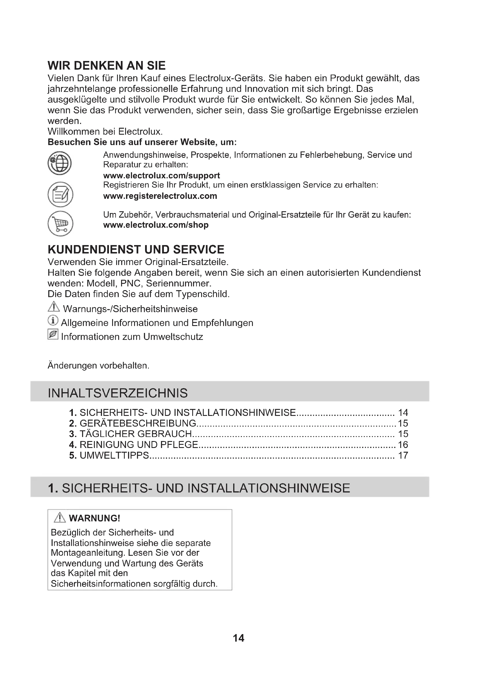 Vielen Dank für Ihren Kauf eines Electrolux-Geräts. Sie haben ein Produkt gewählt, das jahrzehntelange professionelle Erfahrung und Innovation mit sich bringt. Das ausgeklügelte und stilvolle Produkt wurde für Sie entwickelt. So können Sie jedes Mal, wenn Sie das Produkt verwenden, sicher sein, dass Sie großartige Ergebnisse erzielen werden. Willkommen bei Electrolux. Besuchen Sie uns auf unserer Website, um: Anwendungshinweise, Prospekte, Informationen zu Fehlerbehebung, Service undReparatur zu erhalten:www.electrolux.com/supportRegistrieren Sie Ihr Produkt, um einen erstklassigen Service zu erhalten:www.registerelectrolux.comUm Zubehör, Verbrauchsmaterial und Original-Ersatzteile für Ihr Gerät zu kaufen:www.electrolux.com/shop