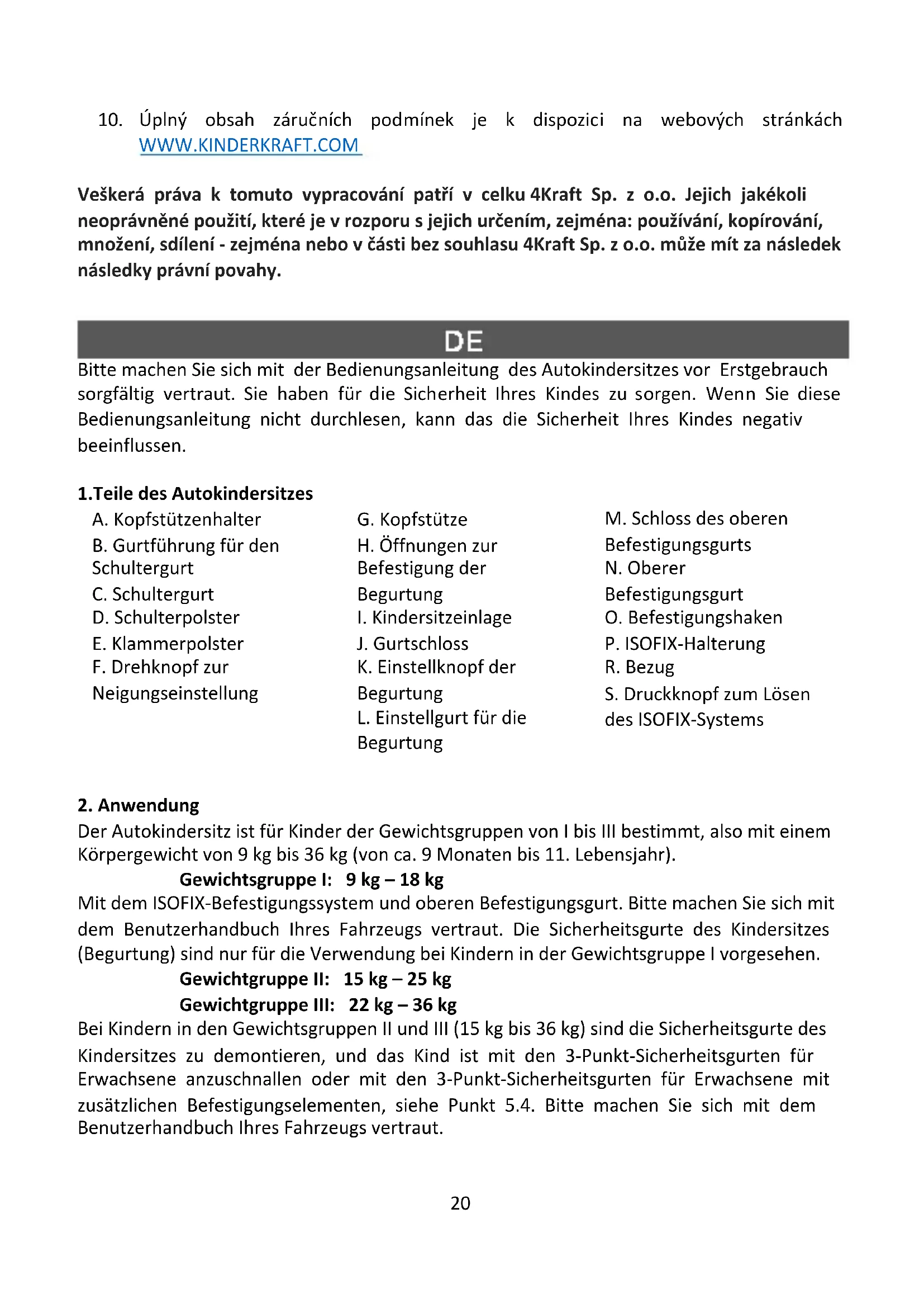 verfügbar. Alle Rechte an dieser Studie liegen vollständig bei 4Kraft Sp. z o.o. Jede nicht autorisierte Verwendung, die ihrem beabsichtigten Zweck widerspricht, insbesondere: Verwendung, Kopieren, Reproduktion, Weitergabe - ganz oder teilweise ohne Zustimmung von 4Kraft Sp. z o.o. kann rechtliche Konsequenzen haben.28 Please read through these instructions carefully before using the child car seat for the first time. Your child’s safety is your responsibility and may be affected if you do not follow these instructions.