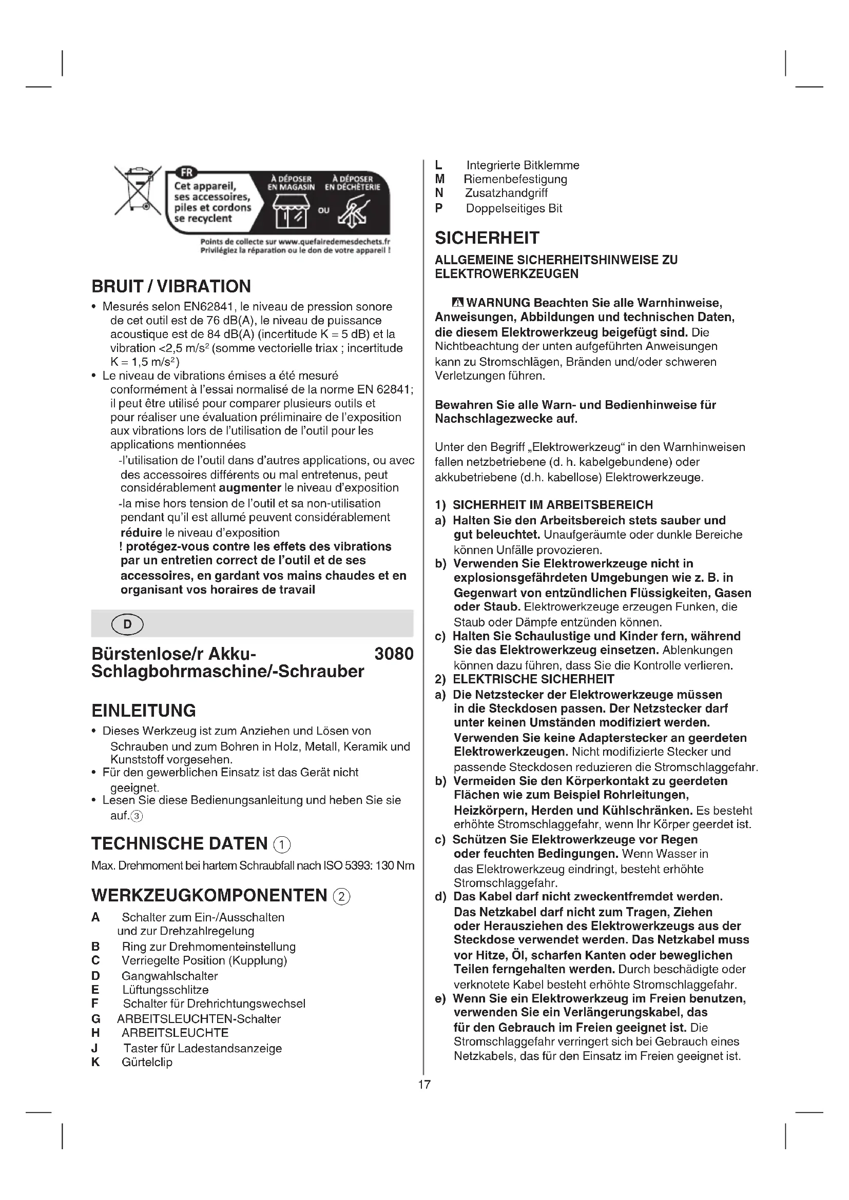 - Lesen Sie diese Bedienungsanleitung und heben Sie sie auf.3 TECHNISCHE DATEN 1 Max. Drehmoment bei hartem Schraubfall nach ISO 5393: 130 Nm WERKZEUGKOMPONENTEN 2 A Schalter zum Ein-/Ausschalten und zur Drehzahlregelung B Ring zur Drehmomenteinstellung C Verriegelte Position (Kupplung) D Gangwahlschalter E Lüftungsschlitze F Schalter für Drehrichtungswechsel G ARBEITSLEUCHTEN-Schalter H ARBEITSLEUCHTE