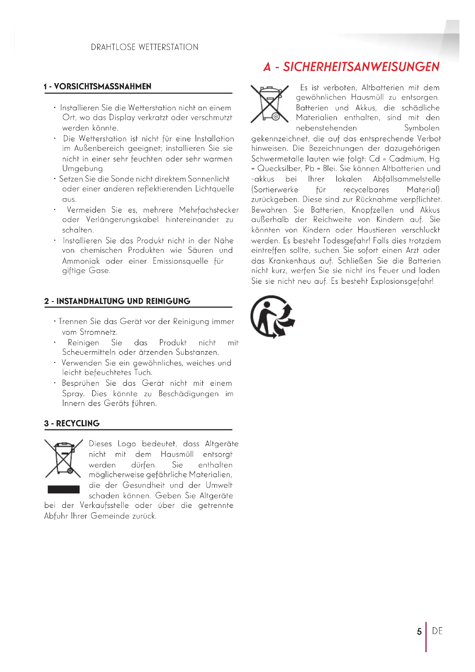 Dieses Logo bedeutet, dass Altgeräte nicht mit dem Hausmüll entsorgt werden dürfen. Sie enthalten möglicherweise gefährliche Materialien, die der Gesundheit und der Umwelt schaden können. Geben Sie Altgeräte bei der Verkaufsstelle oder über die getrennte Abfuhr Ihrer Gemeinde zurück. Es ist verboten, Altbatterien mit dem gewöhnlichen Hausmüll zu entsorgen. Batterien und Akkus, die schädliche Materialien enthalten, sind mit den nebenstehenden Symbolen gekennzeichnet, die auf das entsprechende Verbot hinweisen. Die Bezeichnungen der dazugehörigen Schwermetalle lauten wie folgt: Cd = Cadmium, Hg = Quecksilber, Pb = Blei. Sie können Altbatterien und -akkus bei Ihrer lokalen Abfallsammelstelle (Sortierwerke für recycelbares Material) zurückgeben. Diese sind zur Rücknahme verpichtet. Bewahren Sie Batterien, Knopfzellen und Akkus außerhalb der Reichweite von Kindern auf. Sie könnten von Kindern oder Haustieren verschluckt werden. Es besteht Todesgefahr! Falls dies trotzdem eintreffen sollte, suchen Sie sofort einen Arzt oder das Krankenhaus auf. Schließen Sie die Batterien nicht kurz, werfen Sie sie nicht ins Feuer und laden Sie sie nicht neu auf. Es besteht Explosionsgefahr! Pour en savoir plus : www.quefairedemesdechets.frDRAHTLOSE WETTERSTATION
