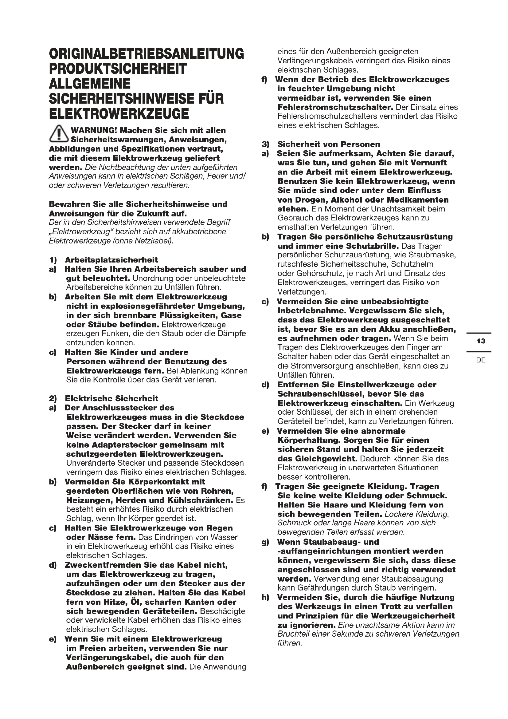 a) Seien Sie aufmerksam, Achten Sie darauf, was Sie tun, und gehen Sie mit Vernunft an die Arbeit mit einem Elektrowerkzeug. Benutzen Sie kein Elektrowerkzeug, wenn Sie müde sind oder unter dem Einfluss von Drogen, Alkohol oder Medikamenten stehen. Ein Moment der Unachtsamkeit beim Gebrauch des Elektrowerkzeuges kann zu ernsthaften Verletzungen führen. b) Tragen Sie persönliche Schutzausrüstung und immer eine Schutzbrille. Das Tragen persönlicher Schutzausrüstung, wie Staubmaske, rutschfeste Sicherheitsschuhe, Schutzhelm oder Gehörschutz, je nach Art und Einsatz des Elektrowerkzeuges, verringert das Risiko von Verletzungen. c) Vermeiden Sie eine unbeabsichtigte Inbetriebnahme. Vergewissern Sie sich, dass das Elektrowerkzeug ausgeschaltet ist, bevor Sie es an den Akku anschließen, es aufnehmen oder tragen. Wenn Sie beim Tragen des Elektrowerkzeuges den Finger am Schalter haben oder das Gerät eingeschaltet an die Stromversorgung anschließen, kann dies zu Unfällen führen. d) Entfernen Sie Einstellwerkzeuge oder Schraubenschlüssel, bevor Sie das Elektrowerkzeug einschalten. Ein Werkzeug oder Schlüssel, der sich in einem drehenden Geräteteil befindet, kann zu Verletzungen führen. e) Vermeiden Sie eine abnormale Körperhaltung. Sorgen Sie für einen sicheren Stand und halten Sie jederzeit das Gleichgewicht. Dadurch können Sie das Elektrowerkzeug in unerwarteten Situationen besser kontrollieren. f) Tragen Sie geeignete Kleidung. Tragen Sie keine weite Kleidung oder Schmuck. Halten Sie Haare und Kleidung fern von sich bewegenden Teilen. Lockere Kleidung, Schmuck oder lange Haare können von sich bewegenden Teilen erfasst werden. g) Wenn Staubabsaug- und -auffangeinrichtungen montiert werden können, vergewissern Sie sich, dass diese angeschlossen sind und richtig verwendet werden. Verwendung einer Staubabsaugung kann Gefährdungen durch Staub verringern. h) Vermeiden Sie, durch die häufige Nutzung des Werkzeugs in einen Trott zu verfallen und Prinzipien für die Werkzeugsicherheit zu ignorieren. Eine unachtsame Aktion kann im Bruchteil einer Sekunde zu schweren Verletzungen führen.14