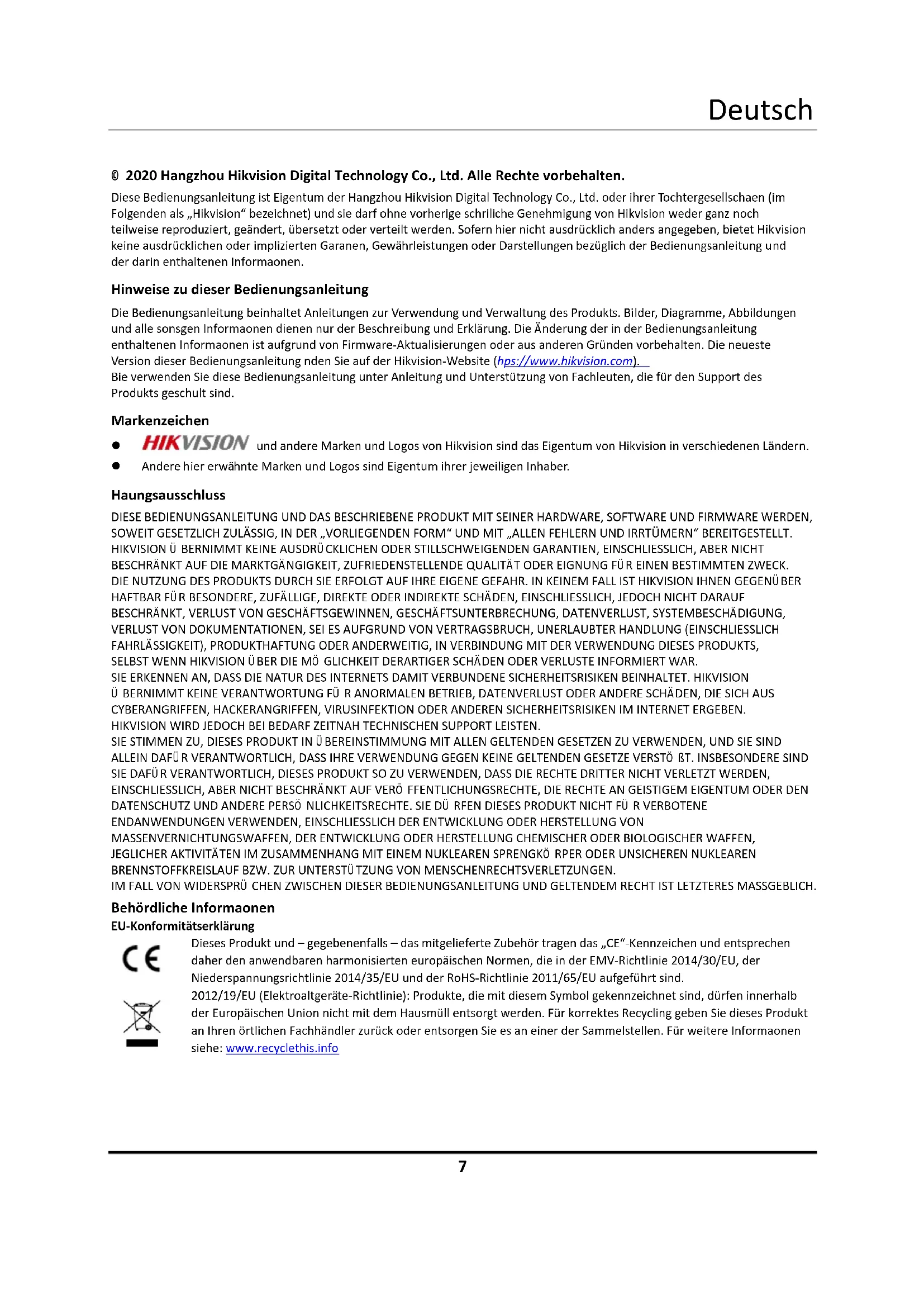 © 2020 Hangzhou Hikvision Digital Technology Co., Ltd. Alle Rechte vorbehalten. Diese Bedienungsanleitung ist Eigentum der Hangzhou Hikvision Digital Technology Co., Ltd. oder ihrer Tochtergesellschaften (im Folgenden als „Hikvision“ bezeichnet) und sie darf ohne vorherige schriftliche Genehmigung von Hikvision weder ganz noch teilweise reproduziert, geändert, übersetzt oder verteilt werden. Sofern hier nicht ausdrücklich anders angegeben, bietet Hikvision keine ausdrücklichen oder implizierten Garantien, Gewährleistungen oder Darstellungen bezüglich der Bedienungsanleitung und der darin enthaltenen Informationen. Hinweise zu dieser Bedienungsanleitung Die Bedienungsanleitung beinhaltet Anleitungen zur Verwendung und Verwaltung des Produkts. Bilder, Diagramme, Abbildungen und alle sonstigen Informationen dienen nur der Beschreibung und Erklärung. Die Änderung der in der Bedienungsanleitung enthaltenen Informationen ist aufgrund von Firmware-Aktualisierungen oder aus anderen Gründen vorbehalten. Die neueste Version dieser Bedienungsanleitung finden Sie auf der Hikvision-Website (https://www.hikvision.com). Bitte verwenden Sie diese Bedienungsanleitung unter Anleitung und Unterstützung von Fachleuten, die für den Support des Produkts geschult sind. Markenzeichen und andere Marken und Logos von Hikvision sind das Eigentum von Hikvision in verschiedenen Ländern. Andere hier erwähnte Marken und Logos sind Eigentum ihrer jeweiligen Inhaber. Haftungsausschluss DIESE BEDIENUNGSANLEITUNG UND DAS BESCHRIEBENE PRODUKT MIT SEINER HARDWARE, SOFTWARE UND FIRMWARE WERDEN, SOWEIT GESETZLICH ZULÄSSIG, IN DER „VORLIEGENDEN FORM“ UND MIT „ALLEN FEHLERN UND IRRTÜMERN“ BEREITGESTELLT. HIKVISION Ü BERNIMMT KEINE AUSDRÜCKLICHEN ODER STILLSCHWEIGENDEN GARANTIEN, EINSCHLIESSLICH, ABER NICHT BESCHRÄNKT AUF DIE MARKTGÄNGIGKEIT, ZUFRIEDENSTELLENDE QUALITÄT ODER EIGNUNG FÜR EINEN BESTIMMTEN ZWECK. DIE NUTZUNG DES PRODUKTS DURCH SIE ERFOLGT AUF IHRE EIGENE GEFAHR. IN KEINEM FALL IST HIKVISION IHNEN GEGENÜBER HAFTBAR FÜR BESONDERE, ZUFÄLLIGE, DIREKTE ODER INDIREKTE SCHÄDEN, EINSCHLIESSLICH, JEDOCH NICHT DARAUF BESCHRÄNKT, VERLUST VON GESCHÄFTSGEWINNEN, GESCHÄFTSUNTERBRECHUNG, DATENVERLUST, SYSTEMBESCHÄDIGUNG, VERLUST VON DOKUMENTATIONEN, SEI ES AUFGRUND VON VERTRAGSBRUCH, UNERLAUBTER HANDLUNG (EINSCHLIESSLICH FAHRLÄSSIGKEIT), PRODUKTHAFTUNG ODER ANDERWEITIG, IN VERBINDUNG MIT DER VERWENDUNG DIESES PRODUKTS, SELBST WENN HIKVISION ÜBER DIE MÖ GLICHKEIT DERARTIGER SCHÄDEN ODER VERLUSTE INFORMIERT WAR. SIE ERKENNEN AN, DASS DIE NATUR DES INTERNETS DAMIT VERBUNDENE SICHERHEITSRISIKEN BEINHALTET. HIKVISION Ü BERNIMMT KEINE VERANTWORTUNG FÜ R ANORMALEN BETRIEB, DATENVERLUST ODER ANDERE SCHÄDEN, DIE SICH AUS CYBERANGRIFFEN, HACKERANGRIFFEN, VIRUSINFEKTION ODER ANDEREN SICHERHEITSRISIKEN IM INTERNET ERGEBEN. HIKVISION WIRD JEDOCH BEI BEDARF ZEITNAH TECHNISCHEN SUPPORT LEISTEN. SIE STIMMEN ZU, DIESES PRODUKT IN ÜBEREINSTIMMUNG MIT ALLEN GELTENDEN GESETZEN ZU VERWENDEN, UND SIE SIND ALLEIN DAFÜR VERANTWORTLICH, DASS IHRE VERWENDUNG GEGEN KEINE GELTENDEN GESETZE VERSTÖ ßT. INSBESONDERE SIND SIE DAFÜR VERANTWORTLICH, DIESES PRODUKT SO ZU VERWENDEN, DASS DIE RECHTE DRITTER NICHT VERLETZT WERDEN, EINSCHLIESSLICH, ABER NICHT BESCHRÄNKT AUF VERÖ FFENTLICHUNGSRECHTE, DIE RECHTE AN GEISTIGEM EIGENTUM ODER DEN DATENSCHUTZ UND ANDERE PERSÖ NLICHKEITSRECHTE. SIE DÜ RFEN DIESES PRODUKT NICHT FÜ R VERBOTENE ENDANWENDUNGEN VERWENDEN, EINSCHLIESSLICH DER ENTWICKLUNG ODER HERSTELLUNG VON MASSENVERNICHTUNGSWAFFEN, DER ENTWICKLUNG ODER HERSTELLUNG CHEMISCHER ODER BIOLOGISCHER WAFFEN, JEGLICHER AKTIVITÄTEN IM ZUSAMMENHANG MIT EINEM NUKLEAREN SPRENGKÖ RPER ODER UNSICHEREN NUKLEAREN BRENNSTOFFKREISLAUF BZW. ZUR UNTERSTÜTZUNG VON MENSCHENRECHTSVERLETZUNGEN. IM FALL VON WIDERSPRÜ CHEN ZWISCHEN DIESER BEDIENUNGSANLEITUNG UND GELTENDEM RECHT IST LETZTERES MASSGEBLICH. Behördliche Informationen EU-Konformitätserklärung