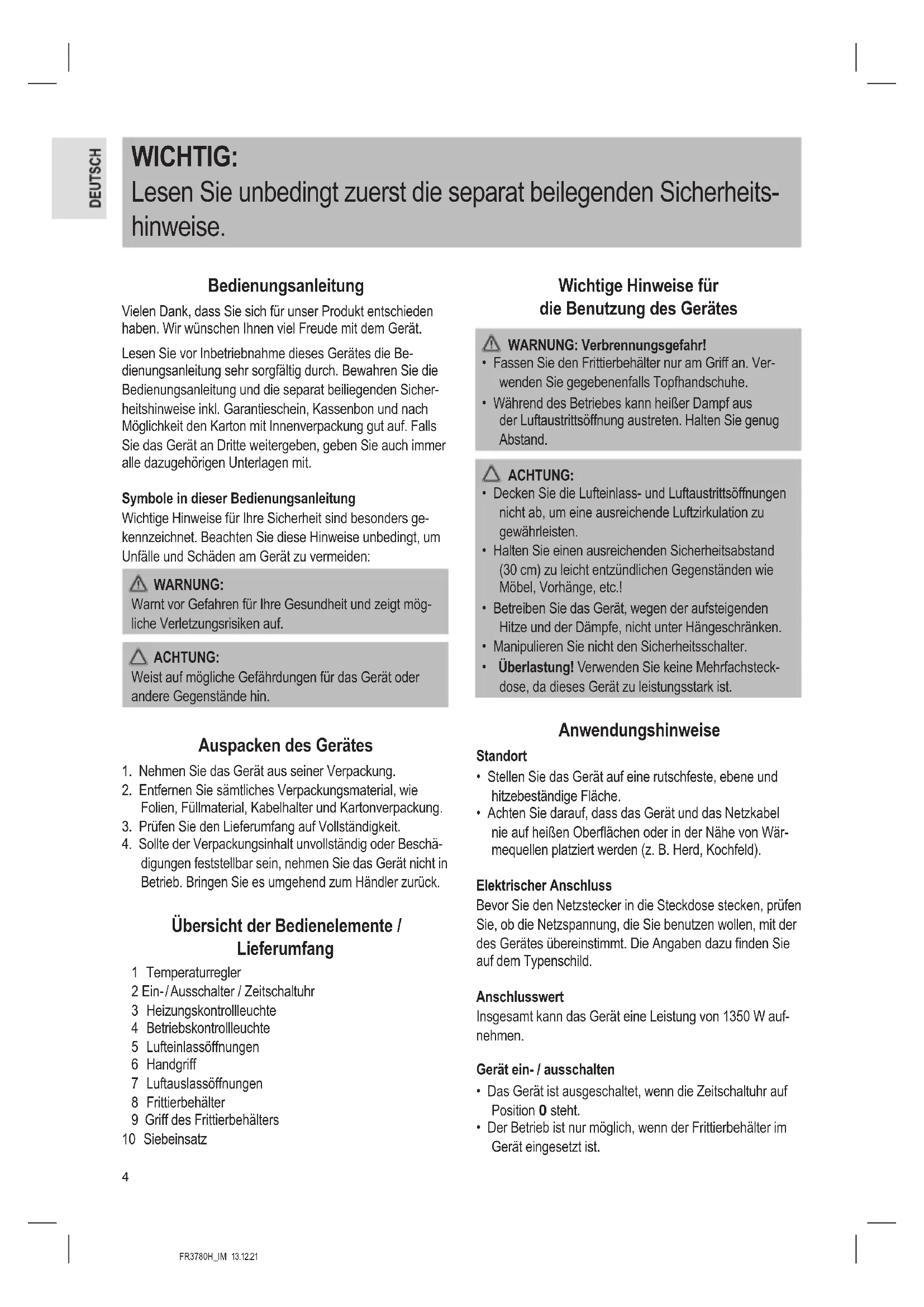 - Der Betrieb ist nur möglich, wenn der Frittierbehälter im Gerät eingesetzt ist.5 FR3780H_IM 13.12.21