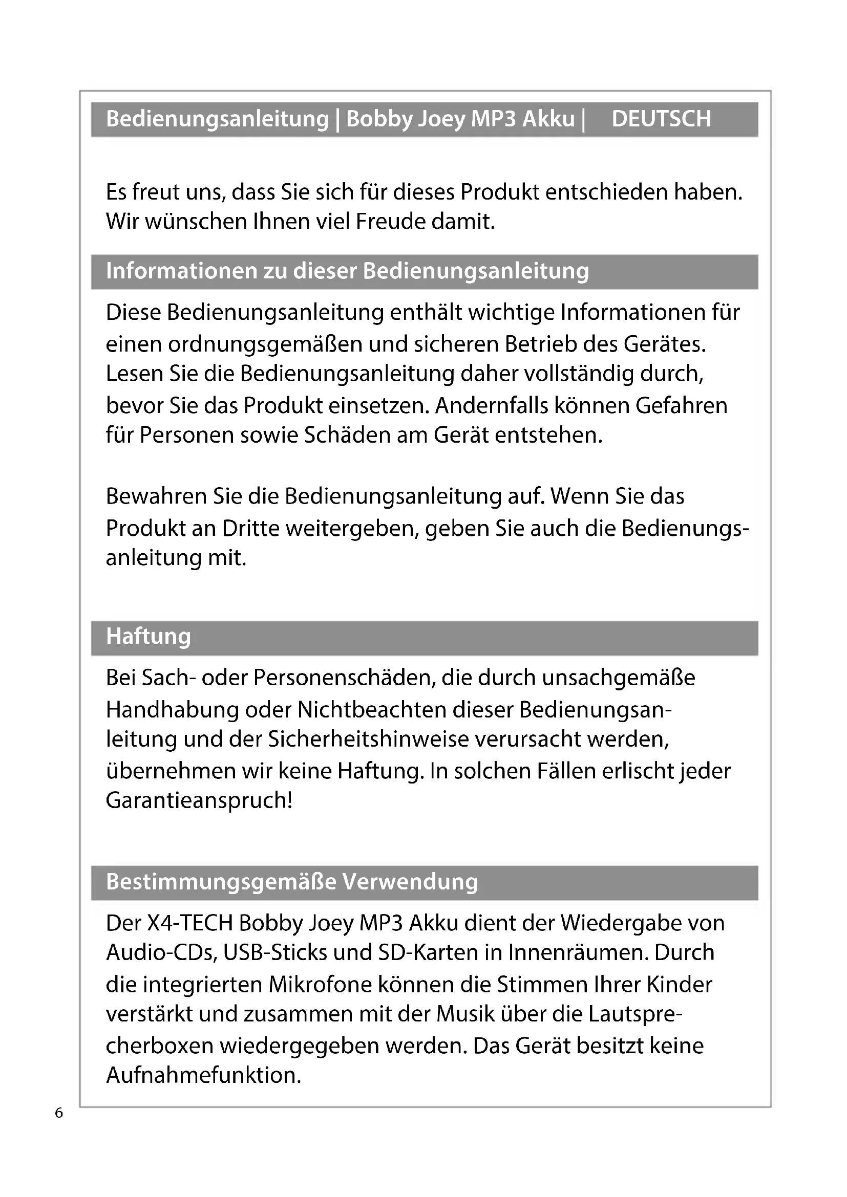 - Kennzeichnung Cd= Cadmium; Hg= Quecksilber; Pb= Blei27 DE lived non food GmbH lived non food GmbH, alle Rechte vorbehalten. Es wird keinerlei Haftung für Änderungen oder Irrtümer zu den in dieser Bedienungsanleitung beschriebenen technischen Daten oder Produkteigenschaften übernommen. Alle Rechte vorbehalten. Jegliche Vervielfäl- tigung, Übertragung, Abschrift oder Speicherung dieser Anleitung oder Teilen davon, sowie dessen Übersetzung in eine Fremdsprache oder eine Computersprache sind ohne die ausdrückliche Genehmigung des Herstellers nicht gestattet. Aufgrund der schnellen Weiterentwicklung der Produkte kann keine Garantie auf Vollständigkeit übernommen werden. Änderungen an Technik und Ausstattung sind jederzeit vorbehalten. Wenn Sie die Bedienungsanleitung in digitaler Form benötigen, wenden Sie sich bitte an unseren Service. Garantie- und Reparaturbedingungen Sie erhalten eine freiwillige 2-jährige Herstellergarantie ab Kaufdatum auf Material- und Fabrikationsfehler des Produktes. Der Geltungsbereich dieser Garantie betrit die Bundesrepublik Deutschland, Österreich und die Schweiz. Als Garantienachweis gilt der Kaufbeleg. Innerhalb der Garantiezeit beheben wir kostenlos alle Material- oder Herstellfehler. Ihre gesetzlichen Gewährleistungen bleiben durch die Garantie unberührt. Die Garantie gilt nicht: – im Falle von Schäden, die auf unsachgemäßer Bedienung beruhen – für Verschleißteile / Zubehörteile die einer normalen Abnutzung unterliegen – für Mängel, die dem Kunden bereits bei Kauf bekannt waren – bei Schäden, die auf Instandsetzung oder Eingrie durch den Käufer oder unbefugte Dritte zurückzuführen sind – wenn das Gerät an ein Stromnetz mit höherer Spannung, als auf dem Gerät angegeben, angeschlossen wird – bei Fallenlassen des Gerätes oder einzelner Teile – bei unsachgemäßem Transport oder unsachgemäßer Verpackung für den Transport – bei Schäden die durch höhere Gewalt herbeigeführt wurden – bei Nichtbeachtung der für das Gerät geltenden Sicherheitsvorkehrungen – bei Nichtbeachtung der Bedienungsanleitung Batterien/Akkus unterliegen keiner Garantie, da diese Verbrauchsteile sind. Ersatzteil: X4-TECH Ersatz-Akku für Kinder CD- Player Bobby Joey MP3 mit Akku Art. 701482 Das Verkaufsdatum ist im Garantiefall durch die Kaufquittung oder Rechnung nachzuweisen. Durch eine Garantieleistung tritt keine Verlängerung der Garantiezeit ein - weder für das Gerät noch für aus gewechselte Bauteile. Im Falle eines berechtigten Garantieanspruchs sind wir nach unserer Wahl berechtigt, das defekte Gerät unentgeltlich zu reparieren oder zu tauschen. Darüber hinausgehende Ansprüche bestehen nicht. Ersetzte Teile oder Produkte gehen in unser Eigentum über. Wir behalten uns das Recht vor, defekte Teile oder Produkte gegen Nachfolgemodelle zu tauschen. Bitte kontaktieren Sie uns immer zuerst, bevor Sie Ihr Produkt an uns einsenden. Sofern eine Einsendung vereinbart wurde, senden Sie das Gerät sicher verpackt auf Ihre Kosten an unsere Serviceabteilung. Fügen Sie unbedingt eine Kopie des Kaufbeleges bei. Nach Ablauf der Garantiezeit anfallende Reparaturen sind kostenpichtig. Unfrei eingesandte Sendungen können nicht angenommen werden und gehen automatisch zurück. DEUser Manual | Bobby Joey MP3 Rechargeable | ENGLISH We are pleased that you have decided to buy our product and wish you an enjoyable and successful use. Information on this user manual This user manual contains important information for the safe use of the product. Therefore, for your own safety and for a successful use, please read this user manual completely before assembling and using the product. Please keep this operating manual for reference. If you pass on the product to anyone else, please hand over the operating manual as well. Liability We do not accept liability for any damage to property or for personal injury that is due to improper use or failure to follow the instructions in this operating manual and the safety advice. In such cases any claim under the guarantee is null and void! Designated Use The X4-TECH Bobby Joey MP3 Rechargeable is designed to play music from Audio-CDs, USB-sticks and SD-cards in indoor environments. Children can sing along to their favorite songs with the integrated microphone that amplies their voice together with music through the loudspeakers. 28The device has no recording function. The designated use is dened by the instruction manual and in following the appliance and the warnings mentioned in this user manual. This product is not suitable for commercial usage. General Notes All mentioned company and product names are registered trademarks under the rights of their owners. © All rights reserved. No liabilities will be taken for damages or claims resulting out of not reading and/or not following the user guide and/or any form of modication on or in the product. Under these circumstances, no warranty services will be given. Liability cannot be taken for consequential damages. The contents of this user manual may dier from the product. If so, please consult additional manuals in the packing. Keep this user manual in a safe place. If you give this product away to a third party, make sure that you also pass on the user manual. For the reason of safety and CE-licensing it is not allowed to modify this unit in any way and/or use it for functions, other than the designated use.