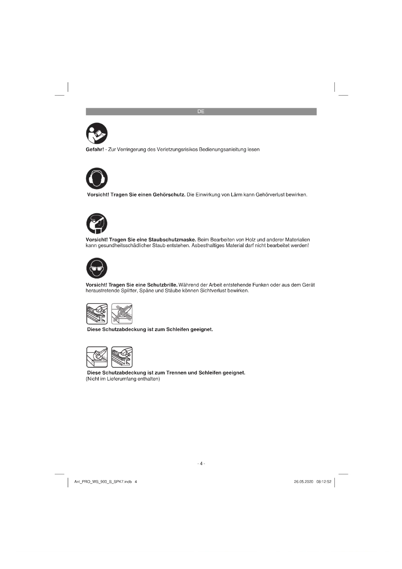 Gefahr! - Zur Verringerung des Verletzungsrisikos Bedienungsanleitung lesen Vorsicht! Tragen Sie einen Gehörschutz. Die Einwirkung von Lärm kann Gehörverlust bewirken. Vorsicht! Tragen Sie eine Schutzbrille. Während der Arbeit entstehende Funken oder aus dem Gerät heraustretende Splitter, Späne und Stäube können Sichtverlust bewirken. Vorsicht! Tragen Sie eine Staubschutzmaske. Beim Bearbeiten von Holz und anderer Materialien kann gesundheitsschädlicher Staub entstehen. Asbesthaltiges Material darf nicht bearbeitet werden! Diese Schutzabdeckung ist zum Trennen und Schleifen geeignet. (Nicht im Lieferumfang enthalten) Diese Schutzabdeckung ist zum Schleifen geeignet. Anl_PRO_WS_900_S_SPK7.indb 4Anl_PRO_WS_900_S_SPK7.indb 4 26.05.2020 08:12:5226.05.2020 08:12:52DE