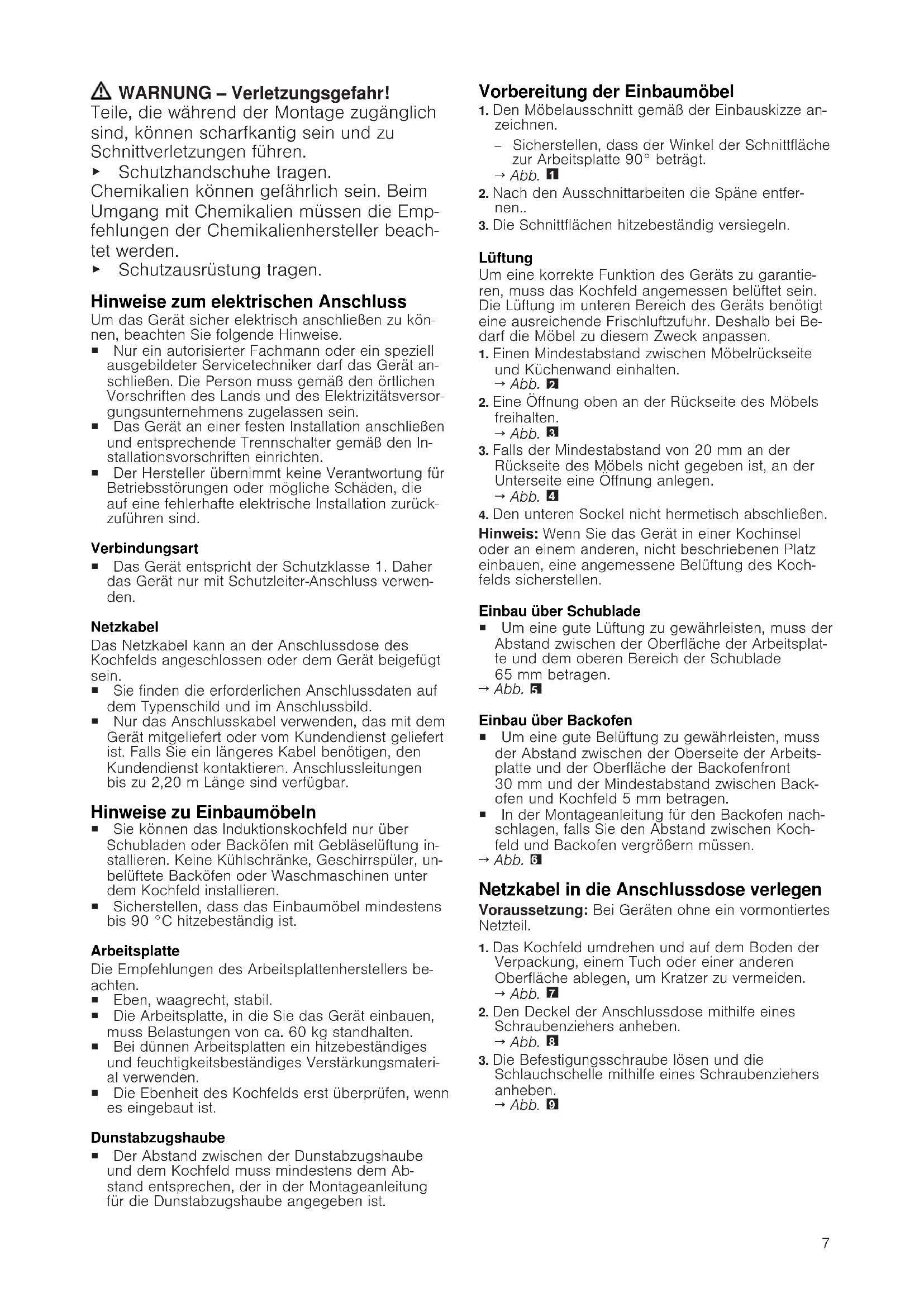 Allgemeine Hinweise ¡ Lesen Sie diese Anleitung sorgfältig. ¡ Nur eine konzessionierte Fachkraft darf das Gerät anschließen. ¡ Eine unsachgemäße Installation, Öffnung des Geräts, Verbindung oder Montage führt zum Verlust der Gültigkeit der Pro- duktgarantie. ¡ Vor der Durchführung jeglicher Arbeiten die Stromzufuhr abstellen. ¡ Nach der Installation sicherstellen, dass der Benutzer keinen Zugang zu den elek- trischen Bauteilen hat. ¡ Nie dieses Gerät in Booten oder Fahrzeu- gen verwenden. Sichere Montage Beachten Sie diese Sicherheitshinweise, wenn Sie das Gerät montieren. Nur bei fachgerechtem Einbau entspre- chend der Montageanleitung ist die Sicher- heit beim Gebrauch gewährleistet. Der In- stallateur ist für das einwandfreie Funktio- nieren des Geräts am Aufstellungsort ver- antwortlich. WARNUNG‒Gefahr durch Magnetismus! Das Gerät enthält Permanentmagnete. Die- se können elektronische Implantate, z.B. Herzschrittmacher oder Insulinpumpen be- einflussen. ▶ Personen mit elektronischen Implantaten müssen 10cm Mindestabstand zum Ge- rät einhalten.7 WARNUNG‒Verletzungsgefahr! Teile, die während der Montage zugänglich sind, können scharfkantig sein und zu Schnittverletzungen führen. ▶ Schutzhandschuhe tragen. Chemikalien können gefährlich sein. Beim Umgang mit Chemikalien müssen die Emp- fehlungen der Chemikalienhersteller beach- tet werden. ▶ Schutzausrüstung tragen. Hinweise zum elektrischen Anschluss Um das Gerät sicher elektrisch anschließen zu kön- nen, beachten Sie folgende Hinweise. ¡ Nur ein autorisierter Fachmann oder ein speziell ausgebildeter Servicetechniker darf das Gerät an- schließen. Die Person muss gemäß den örtlichen Vorschriften des Lands und des Elektrizitätsversor- gungsunternehmens zugelassen sein. ¡ Das Gerät an einer festen Installation anschließen und entsprechende Trennschalter gemäß den In- stallationsvorschriften einrichten. ¡ Der Hersteller übernimmt keine Verantwortung für Betriebsstörungen oder mögliche Schäden, die auf eine fehlerhafte elektrische Installation zurück- zuführen sind. Verbindungsart ¡ Das Gerät entspricht der Schutzklasse 1. Daher das Gerät nur mit Schutzleiter-Anschluss verwen- den. Netzkabel Das Netzkabel kann an der Anschlussdose des Kochfelds angeschlossen oder dem Gerät beigefügt sein. ¡ Sie finden die erforderlichen Anschlussdaten auf dem Typenschild und im Anschlussbild. ¡ Nur das Anschlusskabel verwenden, das mit dem Gerät mitgeliefert oder vom Kundendienst geliefert ist. Falls Sie ein längeres Kabel benötigen, den Kundendienst kontaktieren. Anschlussleitungen bis zu 2,20m Länge sind verfügbar. Hinweise zu Einbaumöbeln ¡ Sie können das Induktionskochfeld nur über Schubladen oder Backöfen mit Gebläselüftung in- stallieren. Keine Kühlschränke, Geschirrspüler, un- belüftete Backöfen oder Waschmaschinen unter dem Kochfeld installieren. ¡ Sicherstellen, dass das Einbaumöbel mindestens bis 90°C hitzebeständig ist. Arbeitsplatte Die Empfehlungen des Arbeitsplattenherstellers be- achten. ¡ Eben, waagrecht, stabil. ¡ Die Arbeitsplatte, in die Sie das Gerät einbauen, muss Belastungen von ca. 60kg standhalten. ¡ Bei dünnen Arbeitsplatten ein hitzebeständiges und feuchtigkeitsbeständiges Verstärkungsmateri- al verwenden. ¡ Die Ebenheit des Kochfelds erst überprüfen, wenn es eingebaut ist. Dunstabzugshaube ¡ Der Abstand zwischen der Dunstabzugshaube und dem Kochfeld muss mindestens dem Ab- stand entsprechen, der in der Montageanleitung für die Dunstabzugshaube angegeben ist. Vorbereitung der Einbaumöbel