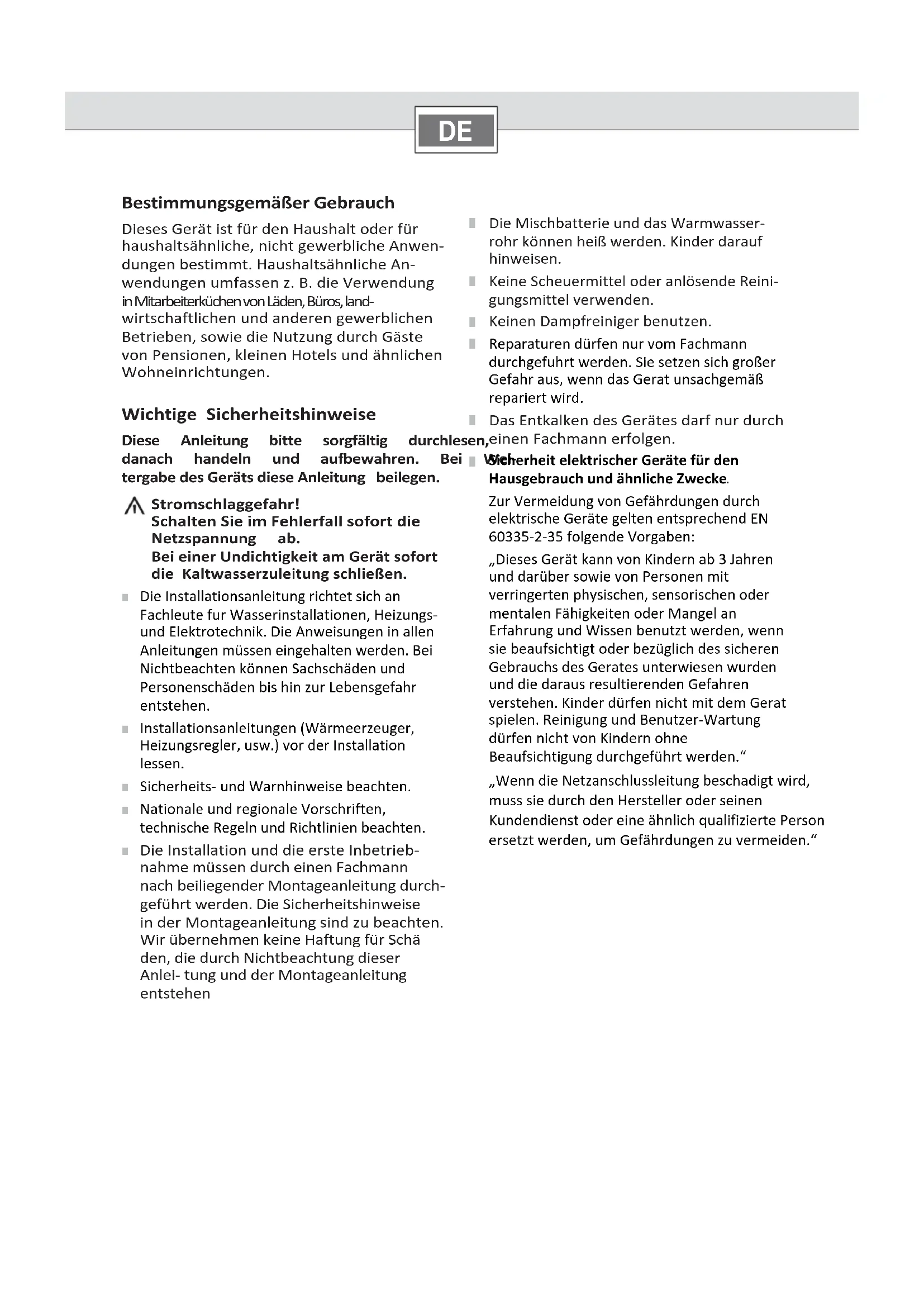 WichtigeSicherheitshinweise Diese Anleitung bitte sorgfältig durchlesen, danach handeln und aufbewahren. Bei Wei‐ tergabedesGerätsdieseAnleitungbeilegen. Stromschlaggefahr! SchaltenSieimFehlerfallsofortdie Netzspannung ab. BeieinerUndichtigkeitamGerätsofort dieKaltwasserzuleitungschließen.