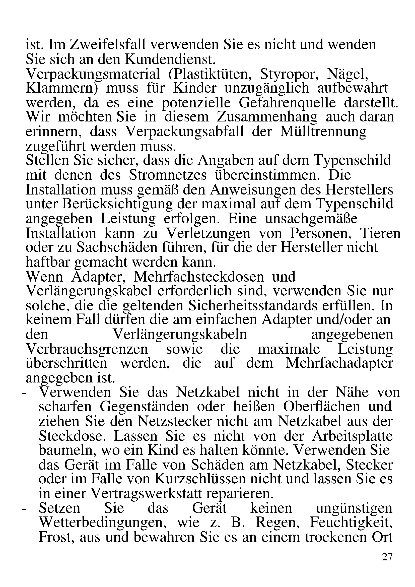 DEUTSCH: HINWEISE: Verwenden Sie das Gerät nur nach den Anweisungen in dieser Bedienungsanleitung. Jede anderweitige Verwendung gilt als unsachgemäß und gefährlich, und der Hersteller kann für Schäden nicht haftbar gemacht werden, die durch eine unsachgemäße, falsche oder unvernünftige Verwendung verursacht werden. Stellen Sie vor der Verwendung sicher, dass das Gerät unversehrt27 ist. Im Zweifelsfall verwenden Sie es nicht und wenden Sie sich an den Kundendienst. Verpackungsmaterial (Plastiktüten, Styropor, Nägel, Klammern) muss für Kinder unzugänglich aufbewahrt werden, da es eine potenzielle Gefahrenquelle darstellt. Wir möchten Sie in diesem Zusammenhang auch daran erinnern, dass Verpackungsabfall der Mülltrennung zugeführt werden muss. Stellen Sie sicher, dass die Angaben auf dem Typenschild mit denen des Stromnetzes übereinstimmen. Die Installation muss gemäß den Anweisungen des Herstellers unter Berücksichtigung der maximal auf dem Typenschild angegeben Leistung erfolgen. Eine unsachgemäße Installation kann zu Verletzungen von Personen, Tieren oder zu Sachschäden führen, für die der Hersteller nicht haftbar gemacht werden kann. Wenn Adapter, Mehrfachsteckdosen und Verlängerungskabel erforderlich sind, verwenden Sie nur solche, die die geltenden Sicherheitsstandards erfüllen. In keinem Fall dürfen die am einfachen Adapter und/oder an den Verlängerungskabeln angegebenen Verbrauchsgrenzen sowie die maximale Leistung überschritten werden, die auf dem Mehrfachadapter angegeben ist. - Verwenden Sie das Netzkabel nicht in der Nähe von scharfen Gegenständen oder heißen Oberflächen und ziehen Sie den Netzstecker nicht am Netzkabel aus der Steckdose. Lassen Sie es nicht von der Arbeitsplatte baumeln, wo ein Kind es halten könnte. Verwenden Sie das Gerät im Falle von Schäden am Netzkabel, Stecker oder im Falle von Kurzschlüssen nicht und lassen Sie es in einer Vertragswerkstatt reparieren. - Setzen Sie das Gerät keinen ungünstigen Wetterbedingungen, wie z. B. Regen, Feuchtigkeit, Frost, aus und bewahren Sie es an einem trockenen Ort28 auf. Fassen Sie das Gerät nicht mit nassen Händen an und verwenden Sie es nicht barfuß. - Dieses Gerät kann von Kindern ab 8 Jahren und von Personen mit eingeschränkten körperlichen, sensorischen oder geistigen Fähigkeiten oder mangelnder Erfahrung und Kenntnissen verwendet werden, wenn sie beaufsichtigt oder instruiert wurden, um das Gerät sicher zu verwenden und die damit verbundenen Gefahren zu verstehen. Kinder dürfen nicht mit dem Gerät spielen. Reinigung und Benutzerwartung dürfen nicht von Kindern ohne Aufsicht durchgeführt werden. - Kinder dürfen nicht mit dem Gerät spielen. - Bewahren Sie das Gerät und sein Netzanschluss außerhalb der Reichweite von Kinder unter 8 Jahren. Wenn das Netzkabel beschädigt ist oder wenn ein Fehler vorliegt, darf das Gerät nicht manipuliert werden. Jede Reparatur muss vom Hersteller oder seinem technischen Kundendienst oder in jedem Fall von einer Person mit ähnlicher Qualifikation durchgeführt werden, um jegliches Risiko zu vermeiden. Die Nichtbeachtung der vorstehenden Bestimmungen kann die Sicherheit des Geräts beeinträchtigen und die Garantiebedingungen ungültig machen. WARNUNG: Dieses Gerät enthält eine Heizfunktion. Oberflächen, außer die funktionellen Oberflächen können hohe Temperaturen entwickeln. Da die Temperaturen von verschiedene Personen unterschiedlich wahrgenommen werden, sollte dieses Gerät mit VORSICHT verwendet werden. Halten Sie das Gerät ausschließlich auf Griffflächen die abhalten und verwenden Sie solche Hitzeschutzmaßen. Dieses Gerät ist nur für den Hausgebrauch oder gleichwertiges bestimmt, in Situationen wie bspw.: Kantinen in kleinen Firmen oder ähnliche29 Arbeitsumgebungen, von Kunden in Hotels, Motels oder andere Art von touristische Unterkunft, wie ländlicher oder Wohn –Tourismus. Das Gerät darf nicht mit einer Zeitschaltuhr oder mit einem separaten Fernwirksystem betrieben werden Führen Sie vor jedem Gebrauch das Netzkabel aus. Setzen Sie das Produkt keinen Stößen aus, es könnte beschädigt werden. Verwenden Sie nur originale und kompatible Teile und Zubehör. Halten Sie das Gerät fern von brennbaren Materialien, Wärmequellen, Dampf-und kalte Zonen. BEDIENUNGSANLEITUNG ACHTUNG: Schalten Sie das Gerät mit leeren Töpfen nicht ein. Überhitzen Sie nie den Topf oder die Pfanne. Stecken Sie keine Aluminiumfolien, Papier oder andere brennbaren Materialien zwischen das Kochfeld und den Topf/die Pfanne. Behandeln Sie das gerade gekochte Essen sorgfältig. Stellen Sie das Gerät nicht um, während Sie kochen oder wenn warme Objekte auf dem Gerät sind. Benutzen Sie das Gerät nur mit Töpfen oder anderen Behältern, die geeignet für das Kochen mit Induktion sind, wofür das Gerät konzipiert wurde. Benutzen Sie Töpfer, die der Größe des Kochfeldes passen. Nach Abschluss des Vorgangs, ziehen Sie den Stecker aus der Steckdose und lassen Sie alle Teile abkühlen, bevor Sie das Gerät wegpacken oder reinigen. Reinigen Sie das Gerät mit einem weichen Schwamm. Tauchen Sie das Gerät nicht ins Wasser oder in andere Flüssigkeiten. Lassen Sie das Gerät nicht unter fliehendem Leitungswasser. Vermeiden Sie, dass Wasser oder andere Flüssigkeiten auf die Kochfelder fliehen .30 Legen Sie die Kochplatte auf stabile Flächen. Lassen Sie während der Nutzung genügenden Raum an den Seiten des Produkts (5 bis 10 cm). Verstopfen Sie die Luftschlitze nicht. Benutzen Sie das Gerät nicht als Fläche für andere Gegenstände. Wegen der hohen Leistung des Herds, benutzen Sie keine Multistecker. Benutzen Sie das Produkt nicht, wenn Sie einen implantierten Herzschrittmacher haben. Benutzen Sie das Produkt nicht, wenn die Glasplatte beschädigt ist. Stellen Sie das Produkt von elektronischen Gegenständen fern, die durch das elektromagnetische Feld beeinträchtigt werden können: Fernseher, Radio, magnetische Karten usw. Berühren S