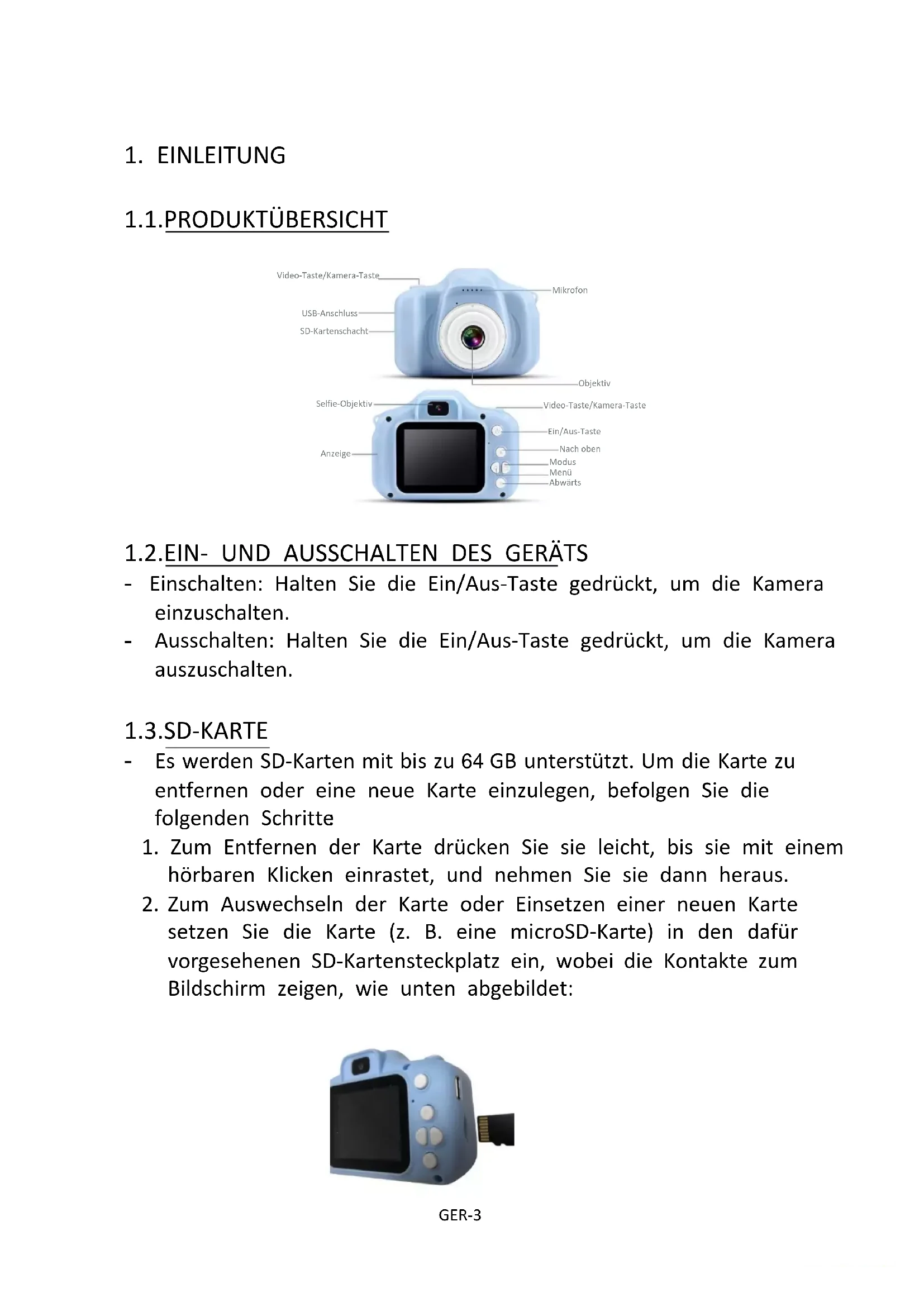 setzen Sie die Karte (z. B. eine microSD-Karte) in den dafür vorgesehenen SD-Kartensteckplatz ein, wobei die Kontakte zum Bildschirm zeigen, wie unten abgebildet: Video-Taste/Kamera-Taste USB-Anschluss SD-Kartenschacht Selfie-Objektiv Anzeige Mikrofon Objektiv Video-Taste/Kamera-Taste Ein/Aus-Taste Nach oben Modus Menü AbwärtsGER-4 Hinweis: - Vergewissern Sie sich vor dem Einsetzen oder Austauschen einer microSD-Karte, dass das Gerät ausgeschaltet ist. - Achten Sie beim Einsetzen der microSD-Karte auf die richtige Ausrichtung der Karte.