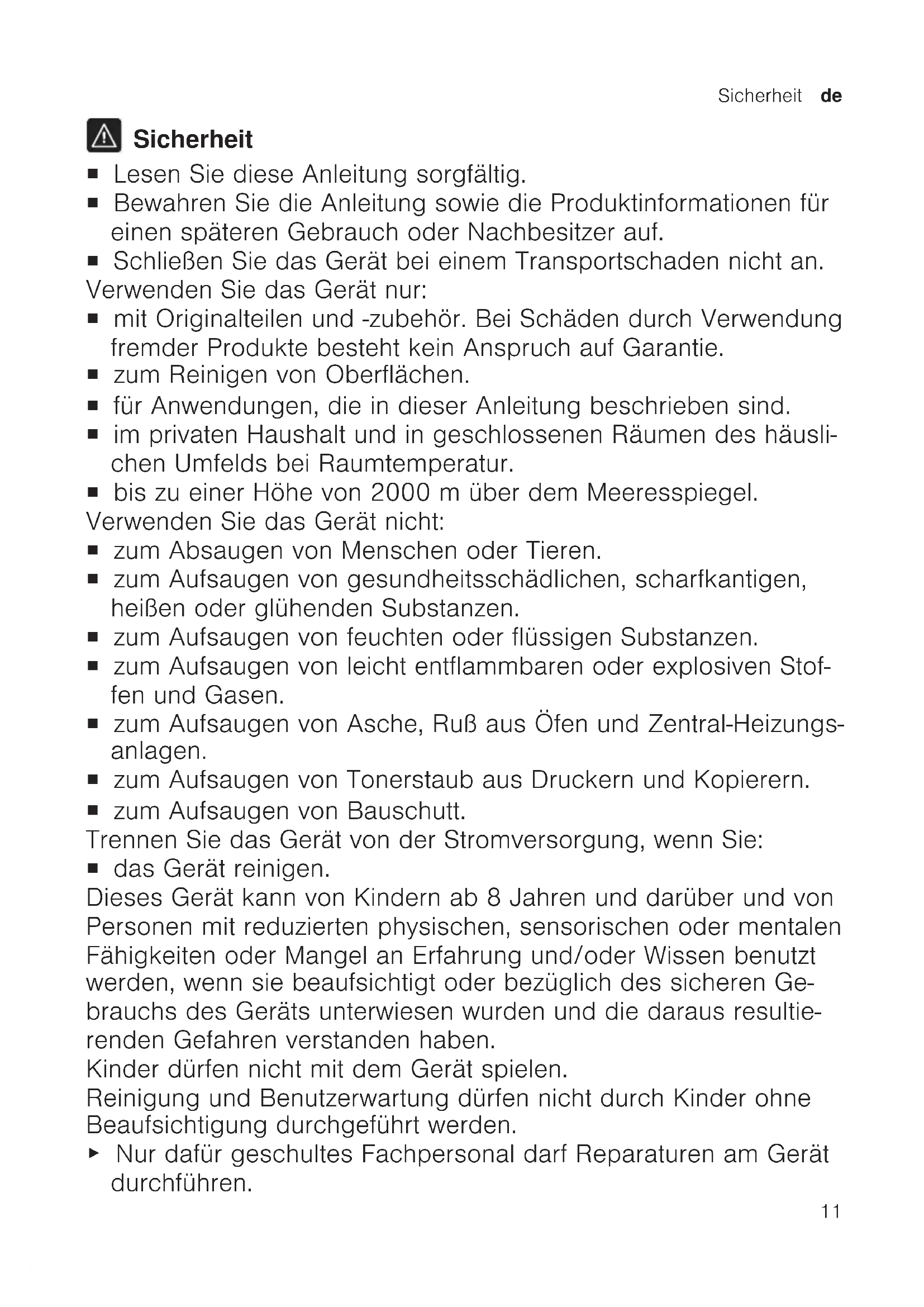 Sicherheit ¡ Lesen Sie diese Anleitung sorgfältig. ¡ Bewahren Sie die Anleitung sowie die Produktinformationen für einen späteren Gebrauch oder Nachbesitzer auf. ¡ Schließen Sie das Gerät bei einem Transportschaden nicht an. Verwenden Sie das Gerät nur: ¡ mit Originalteilen und -zubehör. Bei Schäden durch Verwendung fremder Produkte besteht kein Anspruch auf Garantie. ¡ zum Reinigen von Oberflächen. ¡ für Anwendungen, die in dieser Anleitung beschrieben sind. ¡ im privaten Haushalt und in geschlossenen Räumen des häusli- chen Umfelds bei Raumtemperatur. ¡ bis zu einer Höhe von 2000m über dem Meeresspiegel. Verwenden Sie das Gerät nicht: ¡ zum Absaugen von Menschen oder Tieren. ¡ zum Aufsaugen von gesundheitsschädlichen, scharfkantigen, heißen oder glühenden Substanzen. ¡ zum Aufsaugen von feuchten oder flüssigen Substanzen. ¡ zum Aufsaugen von leicht entflammbaren oder explosiven Stof- fen und Gasen. ¡ zum Aufsaugen von Asche, Ruß aus Öfen und Zentral-Heizungs- anlagen. ¡ zum Aufsaugen von Tonerstaub aus Druckern und Kopierern. ¡ zum Aufsaugen von Bauschutt. Trennen Sie das Gerät von der Stromversorgung, wenn Sie: ¡ das Gerät reinigen. Dieses Gerät kann von Kindern ab 8 Jahren und darüber und von Personen mit reduzierten physischen, sensorischen oder mentalen Fähigkeiten oder Mangel an Erfahrung und/oder Wissen benutzt werden, wenn sie beaufsichtigt oder bezüglich des sicheren Ge- brauchs des Geräts unterwiesen wurden und die daraus resultie- renden Gefahren verstanden haben. Kinder dürfen nicht mit dem Gerät spielen. Reinigung und Benutzerwartung dürfen nicht durch Kinder ohne Beaufsichtigung durchgeführt werden. ▶ Nur dafür geschultes Fachpersonal darf Reparaturen am Gerät durchführen.de Sicherheit