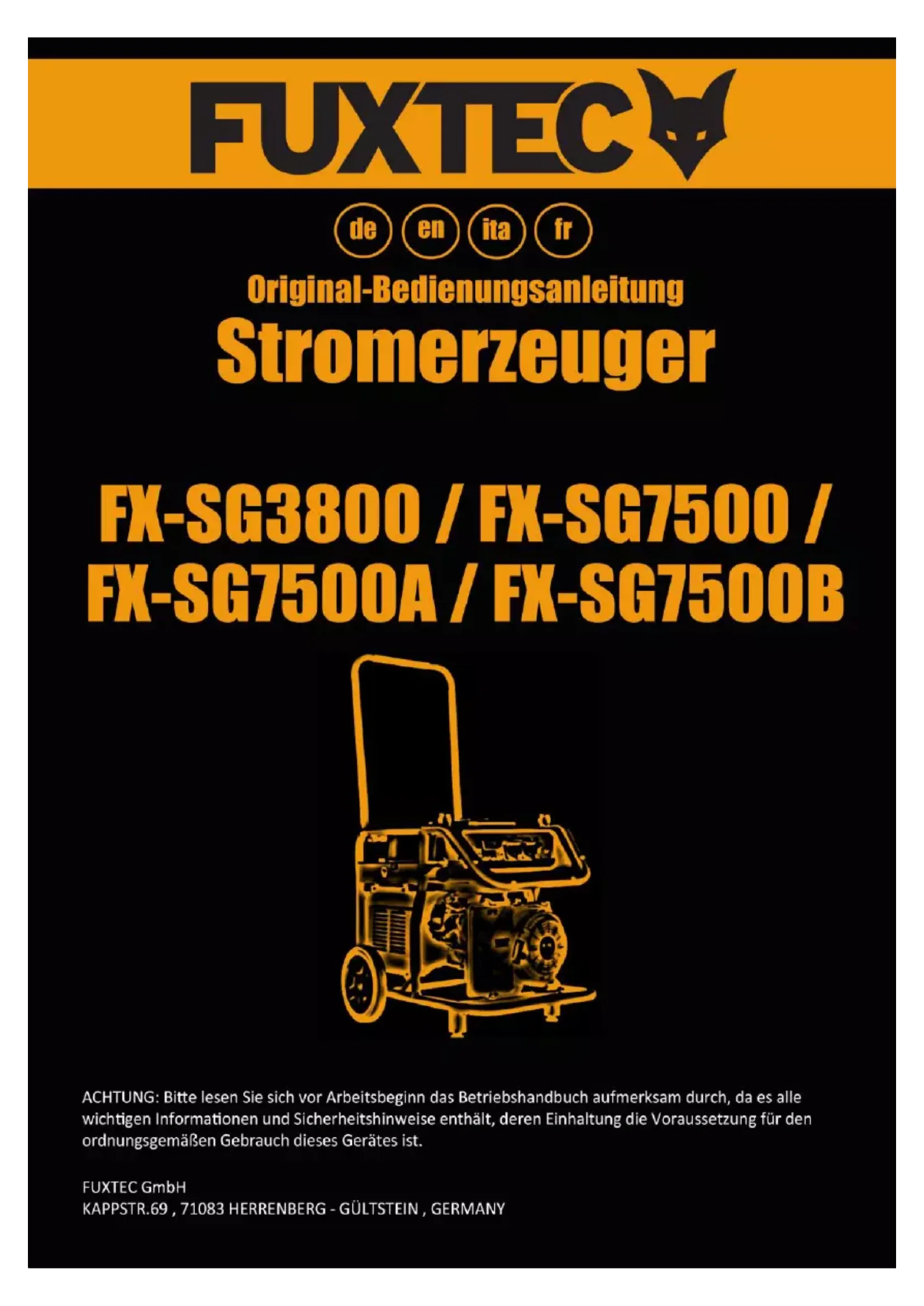 WARNUNG! Vor Gebrauch des Stromerzeugers lesen und danach handeln: − die vorliegende Bedienungsanleitung, − die für den Einsatzort geltenden Regeln und Vorschriften zum Arbeitsschutz und zur Unfallverhütung.Originalbedienungsanleitung Stromerzeuger FX-SG-Serie