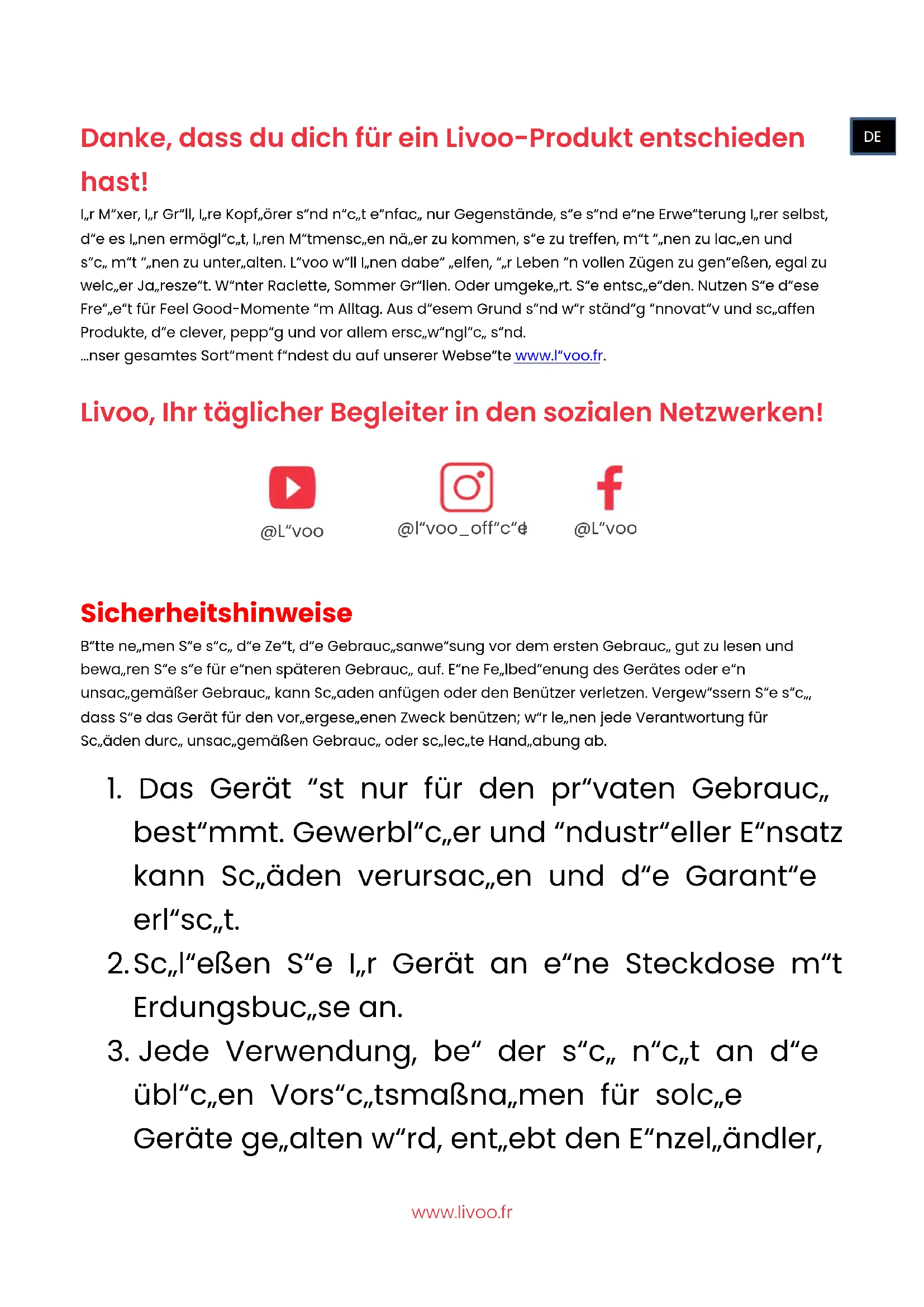 Danke, dass du dich für ein Livoo-Produkt entschieden hast! Ihr Mixer, Ihr Grill, Ihre Kopfhörer sind nicht einfach nur Gegenstände, sie sind eine Erweiterung Ihrer selbst, die es Ihnen ermöglicht, Ihren Mitmenschen näher zu kommen, sie zu treffen, mit ihnen zu lachen und sich mit ihnen zu unterhalten. Livoo will Ihnen dabei helfen, ihr Leben in vollen Zügen zu genießen, egal zu welcher Jahreszeit. Winter Raclette, Sommer Grillen. Oder umgekehrt. Sie entscheiden. Nutzen Sie diese Freiheit für Feel Good-Momente im Alltag. Aus diesem Grund sind wir ständig innovativ und schaffen Produkte, die clever, peppig und vor allem erschwinglich sind. Unser gesamtes Sortiment findest du auf unserer Webseite www.livoo.fr. Livoo, Ihr täglicher Begleiter in den sozialen Netzwerken!