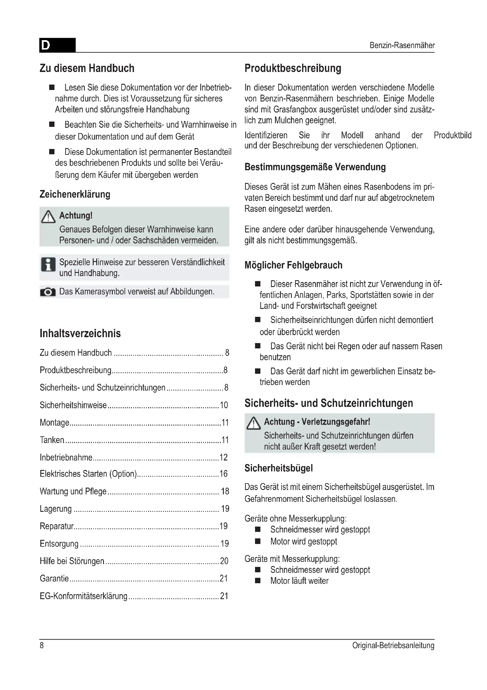 - EG-Konformitätserklärung Zu diesem Handbuch Lesen Sie diese Dokumentation vor der Inbetrieb- nahme durch. Dies ist Voraussetzung für sicheres Arbeiten und störungsfreie Handhabung Beachten Sie die Sicherheits- und Warnhinweise in dieser Dokumentation und auf dem Gerät Diese Dokumentation ist permanenter Bestandteil des beschriebenen Produkts und sollte bei Veräu- ßerung dem Käufer mit übergeben werden Zeichenerklärung Achtung! Genaues Befolgen dieser Warnhinweise kann Personen- und / oder Sachschäden vermeiden. Spezielle Hinweise zur besseren Verständlichkeit und Handhabung. Das Kamerasymbol verweist auf Abbildungen. Produktbeschreibung In dieser Dokumentation werden verschiedene Modelle von Benzin-Rasenmähern beschrieben. Einige Modelle sind mit Grasfangbox ausgerüstet und/oder sind zusätz- lich zum Mulchen geeignet. Identizieren Sie ihr Modell anhand der Produktbilder und der Beschreibung der verschiedenen Optionen. Bestimmungsgemäße Verwendung Dieses Gerät ist zum Mähen eines Rasenbodens im pri- vaten Bereich bestimmt und darf nur auf abgetrocknetem Rasen eingesetzt werden. Eine andere oder darüber hinausgehende Verwendung, gilt als nicht bestimmungsgemäß. Möglicher Fehlgebrauch Dieser Rasenmäher ist nicht zur Verwendung in öf- fentlichen Anlagen, Parks, Sportstätten sowie in der Land- und Forstwirtschaft geeignet Sicherheitseinrichtungen dürfen nicht demontiert oder überbrückt werden Das Gerät nicht bei Regen oder auf nassem Rasen benutzen Das Gerät darf nicht im gewerblichen Einsatz be- trieben werden Sicherheits- und Schutzeinrichtungen Achtung - Verletzungsgefahr! Sicherheits- und Schutzeinrichtungen dürfen nicht außer Kraft gesetzt werden! Sicherheitsbügel Das Gerät ist mit einem Sicherheitsbügel ausgerüstet. Im Gefahrenmoment Sicherheitsbügel loslassen. Geräte ohne Messerkupplung: Schneidmesser wird gestoppt Motor wird gestoppt Geräte mit Messerkupplung: Schneidmesser wird gestoppt Motor läuft weiterD 9470 592_c 1 Starterseil 9 Schnitthöhenverstellung* 2 Start, Stop* 10 Messerkupplung* 3 Radantrieb* 11 Variogetriebe* 4 Sicherheitsbügel 12 Betriebsanleitung 5 Ergonomische Höhenverstellung* 13 Auswurfeinsatz* 6 Füllstandsanzeige* 14 Verschlußklappe* 7 Prallklappe* 15 Mulchkit* 8 Grasfangbox* * je nach Ausführung Symbole am Gerät Achtung! Besondere Vorsicht bei der Handhabung. Vor Arbeiten am Schneidwerk Zündkerzenstecker ziehen. Vor Inbetriebnahme Gebrauchsanleitung lesen! Motorbremse lösen. Dritte aus dem Gefahrenbereich fernhalten! Radantrieb einschalten. Hände und Füße vom Schneidwerk fernhalten! p. 21