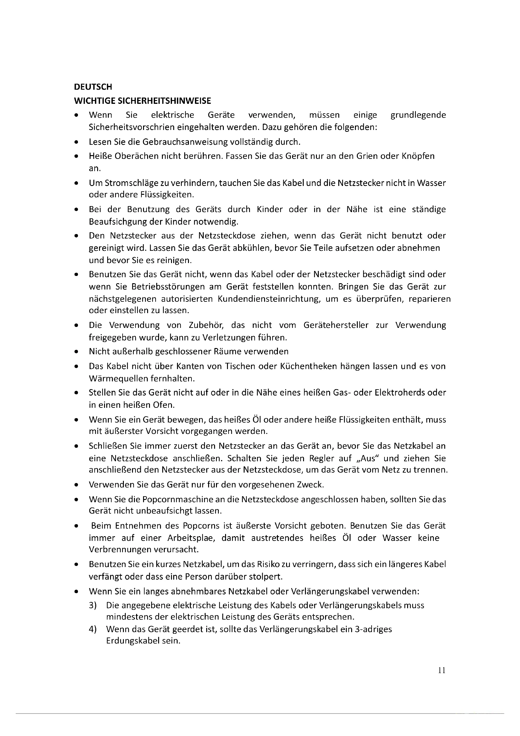 SERVICE If you have any further questions about the product after reading this manual, please contact the Trebs customer service. Trebs BV Thermiekstraat 1a 6361 HB Nuth Nederland Internet: www.trebs.nl / www.trebsshop.com11 DEUTSCH WICHTIGE SICHERHEITSHINWEISE Wenn Sie elektrische Geräte verwenden, müssen einige grundlegende Sicherheitsvorschriften eingehalten werden. Dazu gehören die folgenden: Lesen Sie die Gebrauchsanweisung vollständig durch. Heiße Oberflächen nicht berühren. Fassen Sie das Gerät nur an den Griffen oder Knöpfen an. Um Stromschläge zu verhindern, tauchen Sie das Kabel und die Netzstecker nicht in Wasser oder andere Flüssigkeiten. Bei der Benutzung des Geräts durch Kinder oder in der Nähe ist eine ständige Beaufsichtigung der Kinder notwendig. Den Netzstecker aus der Netzsteckdose ziehen, wenn das Gerät nicht benutzt oder gereinigt wird. Lassen Sie das Gerät abkühlen, bevor Sie Teile aufsetzen oder abnehmen und bevor Sie es reinigen. Benutzen Sie das Gerät nicht, wenn das Kabel oder der Netzstecker beschädigt sind oder wenn Sie Betriebsstörungen am Gerät feststellen konnten. Bringen Sie das Gerät zur nächstgelegenen autorisierten Kundendiensteinrichtung, um es überprüfen, reparieren oder einstellen zu lassen. Die Verwendung von Zubehör, das nicht vom Gerätehersteller zur Verwendung freigegeben wurde, kann zu Verletzungen führen. Nicht außerhalb geschlossener Räume verwenden Das Kabel nicht über Kanten von Tischen oder Küchentheken hängen lassen und es von Wärmequellen fernhalten. Stellen Sie das Gerät nicht auf oder in die Nähe eines heißen Gas- oder Elektroherds oder in einen heißen Ofen. Wenn Sie ein Gerät bewegen, das heißes Öl oder andere heiße Flüssigkeiten enthält, muss mit äußerster Vorsicht vorgegangen werden. Schließen Sie immer zuerst den Netzstecker an das Gerät an, bevor Sie das Netzkabel an eine Netzsteckdose anschließen. Schalten Sie jeden Regler auf „Aus“ und ziehen Sie anschließend den Netzstecker aus der Netzsteckdose, um das Gerät vom Netz zu trennen. Verwenden Sie das Gerät nur für den vorgesehenen Zweck. Wenn Sie die Popcornmaschine an die Netzsteckdose angeschlossen haben, sollten Sie das Gerät nicht unbeaufsichtigt lassen. Beim Entnehmen des Popcorns ist äußerste Vorsicht geboten. Benutzen Sie das Gerät immer auf einer Arbeitsplatte, damit austretendes heißes Öl oder Wasser keine Verbrennungen verursacht. Benutzen Sie ein kurzes Netzkabel, um das Risiko zu verringern, dass sich ein längeres Kabel verfängt oder dass eine Person darüber stolpert. Wenn Sie ein langes abnehmbares Netzkabel oder Verlängerungskabel verwenden: