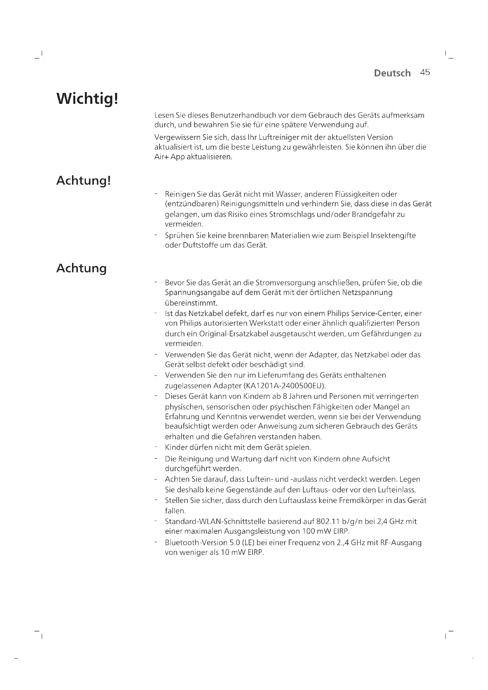 Deutsch Wichtig! Lesen Sie dieses Benutzerhandbuch vor dem Gebrauch des Geräts aufmerksam durch, und bewahren Sie sie für eine spätere Verwendung auf. Vergewissern Sie sich, dass Ihr Luftreiniger mit der aktuellsten Version aktualisiert ist, um die beste Leistung zu gewährleisten. Sie können ihn über die Air+ App aktualisieren. Achtung!