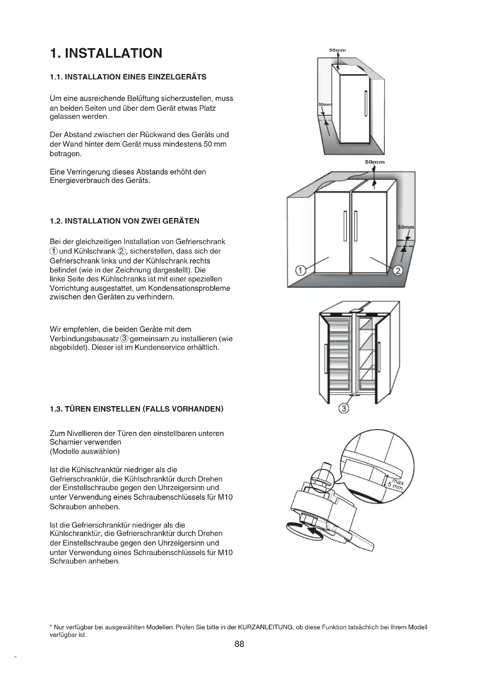 gemeinsamzuinstallieren(wie abgebildet).DieseristimKundenserviceerhältlich. 1.3. TÜREN EINSTELLEN (FALLS VORHANDEN) Zum Nivellieren der Türen den einstellbaren unteren Scharnier verwenden (Modelleauswählen) Ist die Kühlschranktür niedriger als die Gefrierschranktür,dieKühlschranktürdurchDrehen derEinstellschraubegegendenUhrzeigersinnund unterVerwendungeinesSchraubenschlüsselsfürM10 Schraubenanheben. Ist die Gefrierschranktür niedriger als die Kühlschranktür,dieGefrierschranktürdurchDrehen derEinstellschraubegegendenUhrzeigersinnund unterVerwendungeinesSchraubenschlüsselsfürM10 Schraubenanheben. *NurverfügbarbeiausgewähltenModellen.PrüfenSiebitteinderKURZANLEITUNG,obdieseFunktiontatsächlichbeiIhremModell verfügbarist. 50mm 50mm 5 mm max89