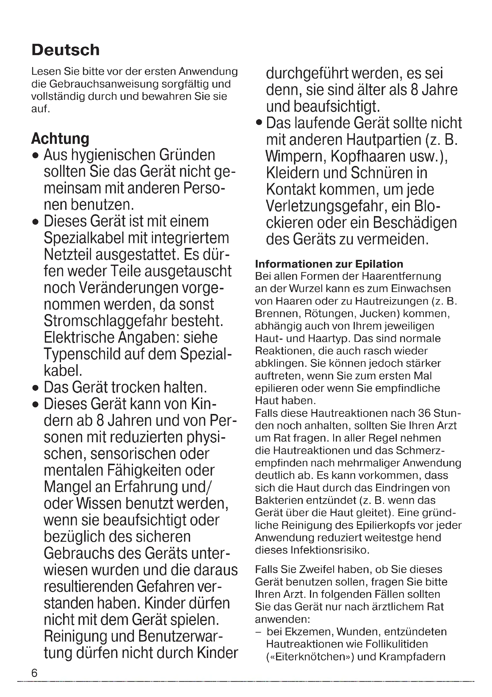 Das laufende Gerät sollte nicht mit anderen Hautpartien (z. B. Wimpern, Kopfhaaren usw.), Kleidern und Schnüren in Kontakt kommen, um jede Verletzungsgefahr, ein Blo- ckieren oder ein Beschädigen des Geräts zu vermeiden. Informationen zur Epilation Bei allen Formen der Haarentfernung an der Wurzel kann es zum Einwachsen von Haaren oder zu Hautreizungen (z. B. Brennen, Rötungen, Jucken) kommen, abhängig auch von Ihrem jeweiligen Haut- und Haartyp. Das sind normale Reaktionen, die auch rasch wieder abklingen. Sie können jedoch stärker auftreten, wenn Sie zum ersten Mal epilieren oder wenn Sie empfindliche Haut haben. Falls diese Hautreaktionen nach 36 Stun- den noch anhalten, sollten Sie Ihren Arzt um Rat fragen. In aller Regel nehmen die Hautreaktionen und das Schmerz- empfinden nach mehrmaliger Anwendung deutlich ab. Es kann vorkommen, dass sich die Haut durch das Eindringen von Bakterien entzündet (z. B. wenn das Gerät über die Haut gleitet). Eine gründ- liche Reinigung des Epilierkopfs vor jeder Anwendung reduziert weitestge hend dieses Infektionsrisiko. Falls Sie Zweifel haben, ob Sie dieses Gerät benutzen sollen, fragen Sie bitte Ihren Arzt. In folgenden Fällen sollten Sie das Gerät nur nach ärztlichem Rat anwenden: – bei Ekzemen, Wunden, entzündeten Hautreaktionen wie Follikulitiden («Eiterknötchen») und Krampfadern Deutsch 91618385_SE_3273_3274_GROCERY_S6-60.indd 691618385_SE_3273_3274_GROCERY_S6-60.indd 6 22.08.17 08:3022.08.17 08:30 CSS APPROVED Effective Date 25Aug2017 GMT - Printed 22Nov2017 Page 6 of 607 – im Bereich von Muttermalen – bei Schwächung der Abwehrkräfte Ihrer Haut, die auftreten kann bei Diabetes, Schwangerschaft, bei Vorliegen des Raynaud Syndroms – bei Blutern oder bei Immunschwäche. Die Epilation ist leichter und angenehmer, wenn die Haare die optimale Länge von 2-5 mm haben. Sind die Haare länger, empfehlen wir zunächst zu rasieren (siehe Abschnitt B) und nach einer Woche die kürzeren, nachwachsenden Haare zu epilieren. Es kann vorkommen, dass dünne nach- wachsende Härchen nicht an die Haut- oberfläche gelangen. Die regelmäßige Verwendung eines Massageschwamms (z. B. nach dem Duschen) oder eines Körper-Peelings hilft, das Einwachsen von Härchen zu verhindern. Damit wird die obere Hautschicht entfernt und feine Haare können an die Oberfläche gelangen. Gerätebeschreibung 1 Massagerollen-Aufsatz 2 Epilierkopf mit Pinzettenwalze 3 Entriegelungsknöpfe 4 Ein-/Ausschalter mit integriertem Licht 5 Steckerbuchse 6 Spezialkabel 7 Rasieraufsatz mit Trimmer-Kappe A So epilieren Sie