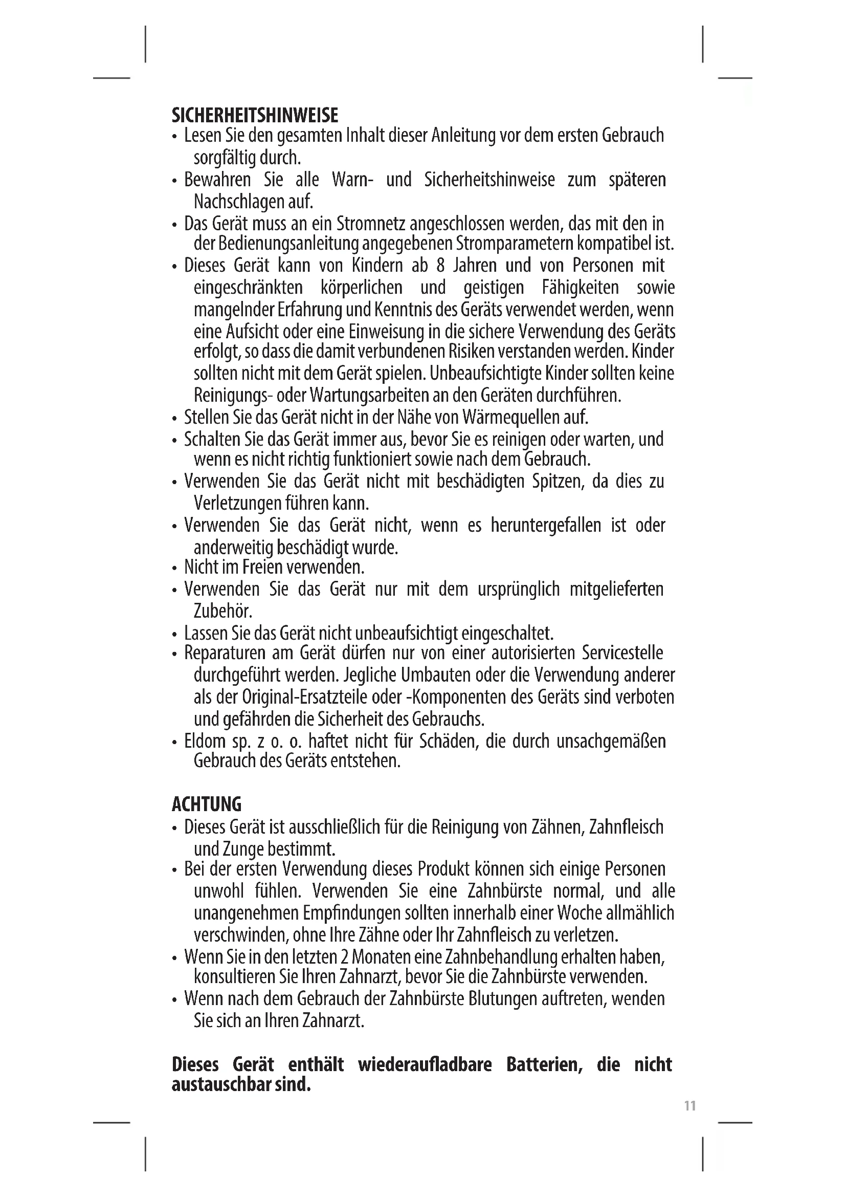- Dieses Gerät ist ausschließlich für die Reinigung von Zähnen, Zahneisch und Zunge bestimmt.