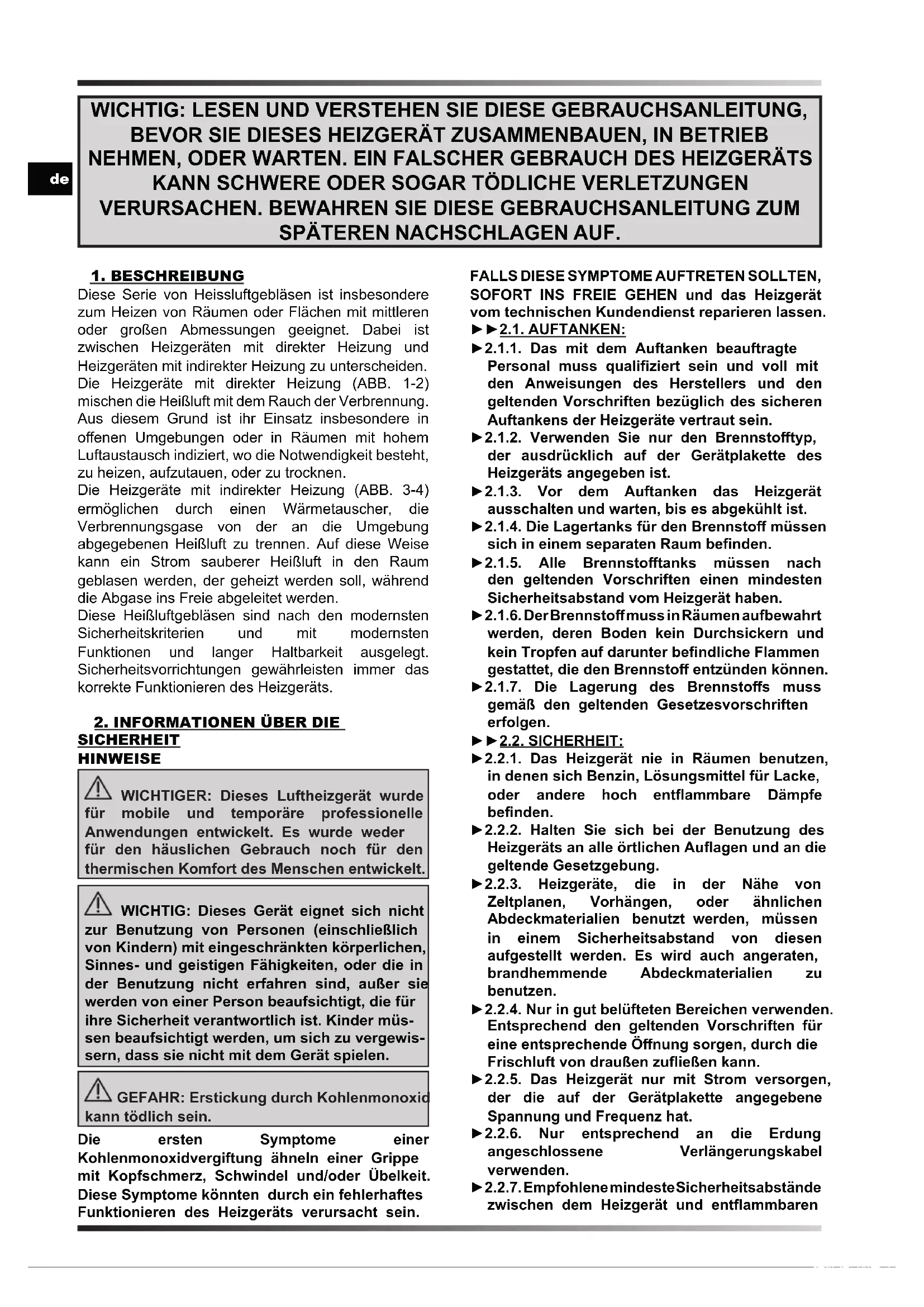 SICHERHEIT HINWEISE WICHTIGER: Dieses Luftheizgerät wurde für mobile und temporäre professionelle Anwendungen entwickelt. Es wurde weder für den häuslichen Gebrauch noch für den thermischen Komfort des Menschen entwickelt. WICHTIG: Dieses Gerät eignet sich nicht zur Benutzung von Personen (einschließlich von Kindern) mit eingeschränkten körperlichen, Sinnes- und geistigen Fähigkeiten, oder die in der Benutzung nicht erfahren sind, außer sie werden von einer Person beaufsichtigt, die für ihre Sicherheit verantwortlich ist. Kinder müs- sen beaufsichtigt werden, um sich zu vergewis- sern, dass sie nicht mit dem Gerät spielen. GEFAHR: Erstickung durch Kohlenmonoxid kann tödlich sein. Die ersten Symptome einer Kohlenmonoxidvergiftung ähneln einer Grippe mit Kopfschmerz, Schwindel und/oder Übelkeit. Diese Symptome könnten durch ein fehlerhaftes Funktionieren des Heizgeräts verursacht sein. FALLS DIESE SYMPTOME AUFTRETEN SOLLTEN, SOFORT INS FREIE GEHEN und das Heizgerät vom technischen Kundendienst reparieren lassen. ►►2.1. AUFTANKEN: ►2.1.1. Das mit dem Auftanken beauftragte Personal muss qualiziert sein und voll mit den Anweisungen des Herstellers und den geltenden Vorschriften bezüglich des sicheren Auftankens der Heizgeräte vertraut sein. ►2.1.2. Verwenden Sie nur den Brennstotyp, der ausdrücklich auf der Gerätplakette des Heizgeräts angegeben ist. ►2.1.3. Vor dem Auftanken das Heizgerät ausschalten und warten, bis es abgekühlt ist. ►2.1.4. Die Lagertanks für den Brennsto müssen sich in einem separaten Raum benden. ►2.1.5. Alle Brennstotanks müssen nach den geltenden Vorschriften einen mindesten Sicherheitsabstand vom Heizgerät haben. ►2.1.6. Der Brennsto muss in Räumen aufbewahrt werden, deren Boden kein Durchsickern und kein Tropfen auf darunter bendliche Flammen gestattet, die den Brennsto entzünden können. ►2.1.7. Die Lagerung des Brennstos muss gemäß den geltenden Gesetzesvorschriften erfolgen. ►►2.2. SICHERHEIT: ►2.2.1. Das Heizgerät nie in Räumen benutzen, in denen sich Benzin, Lösungsmittel für Lacke, oder andere hoch entammbare Dämpfe benden. ►2.2.2. Halten Sie sich bei der Benutzung des Heizgeräts an alle örtlichen Auagen und an die geltende Gesetzgebung. ►2.2.3. Heizgeräte, die in der Nähe von Zeltplanen, Vorhängen, oder ähnlichen Abdeckmaterialien benutzt werden, müssen in einem Sicherheitsabstand von diesen aufgestellt werden. Es wird auch angeraten, brandhemmende Abdeckmaterialien zu benutzen. ►2.2.4. Nur in gut belüfteten Bereichen verwenden. Entsprechend den geltenden Vorschriften für eine entsprechende Önung sorgen, durch die Frischluft von draußen zuießen kann. ►2.2.5. Das Heizgerät nur mit Strom versorgen, der die auf der Gerätplakette angegebene Spannung und Frequenz hat. ►2.2.6. Nur entsprechend an die Erdung angeschlossene Verlängerungskabel verwenden. ►2.2.7. Empfohlene mindeste Sicherheitsabstände zwischen dem Heizgerät und entammbarenen